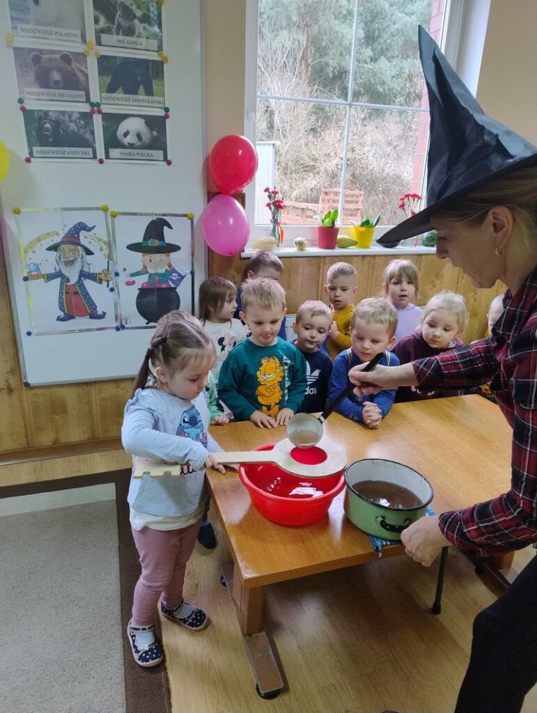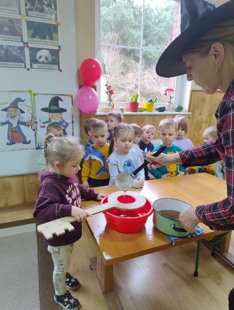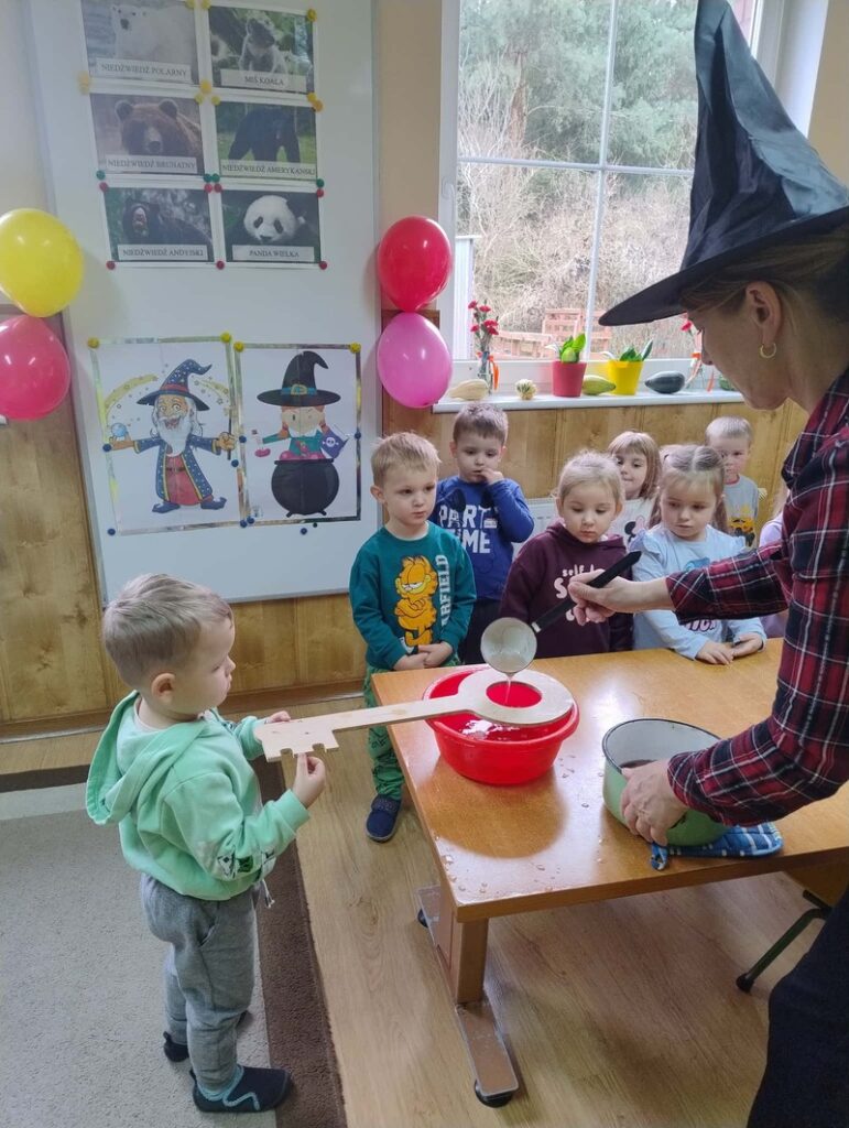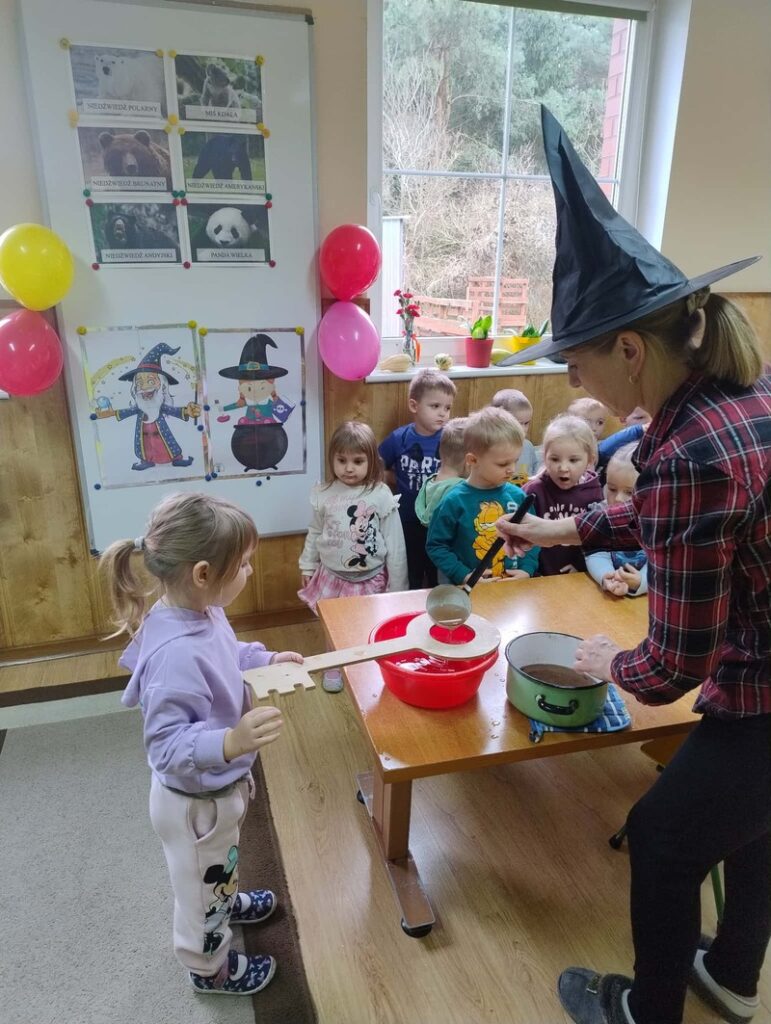 Dzieci z wielkim zaangażowaniem brały udział w tradycyjnych wróżbach andrzejkowych. Było losowanie przepowiedni, zabawy z butami oraz wiele śmiechu i pozytywnych emocji. Największą atrakcją okazało się oczywiście lanie wosku przez klucz 🕯️🔑 – powstałe kształty pobudzały wyobraźnię i były inspiracją do ciekawych opowieści.