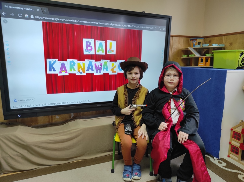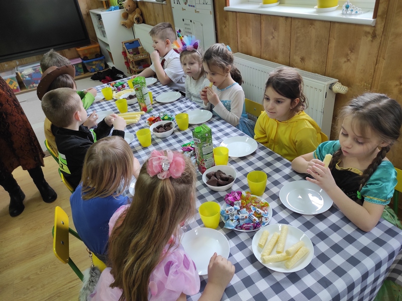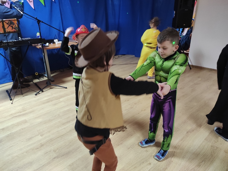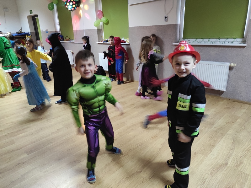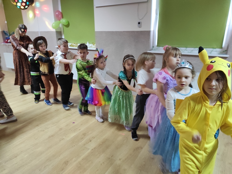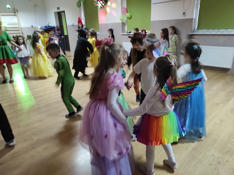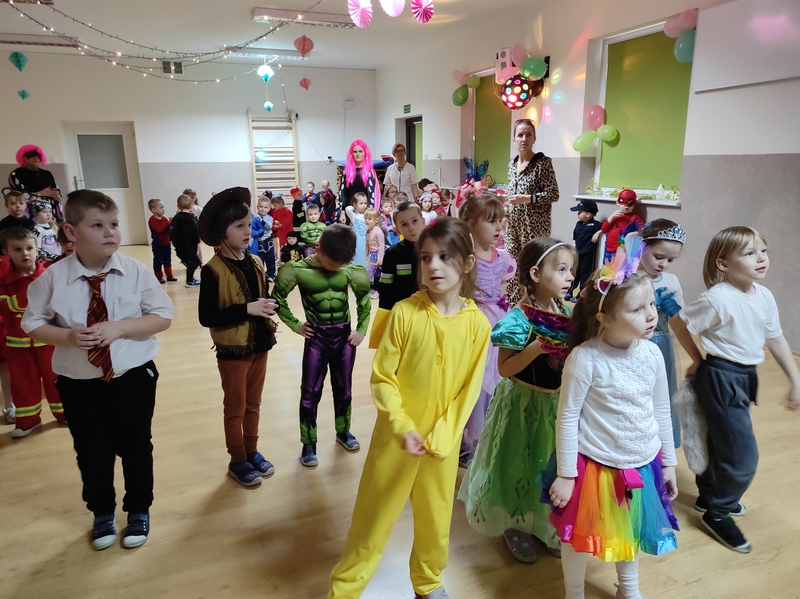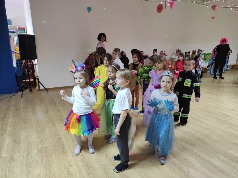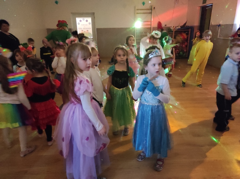 Tego dnia już od rana pojawili się przebierańcy. W salach przedszkolnych można było spotkać między innymi: wróżki, królewny, jednorożce, rycerzy, piratów, policjantów, strażaków i wiele innych postaci. Kiedy pojawiły się pierwsze rytmy wesołej muzyki wszyscy z wielką ochotą rozpoczęli pląsy i tańce. Dzieci bawiły się znakomicie. Były „Tańce – łamańce”, „Pociąg”, „Kaczuchy”, „ Maszynista” i inne.