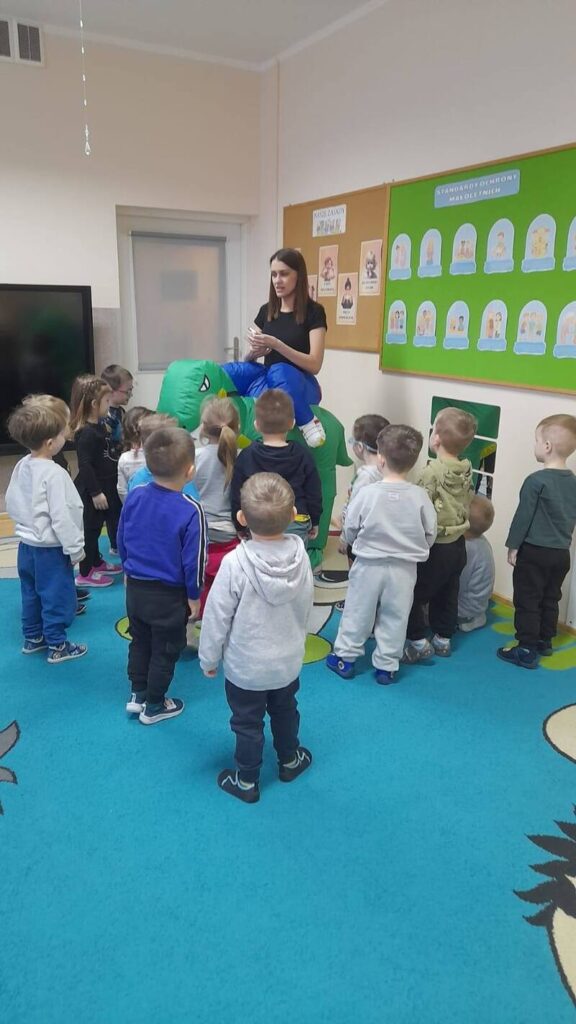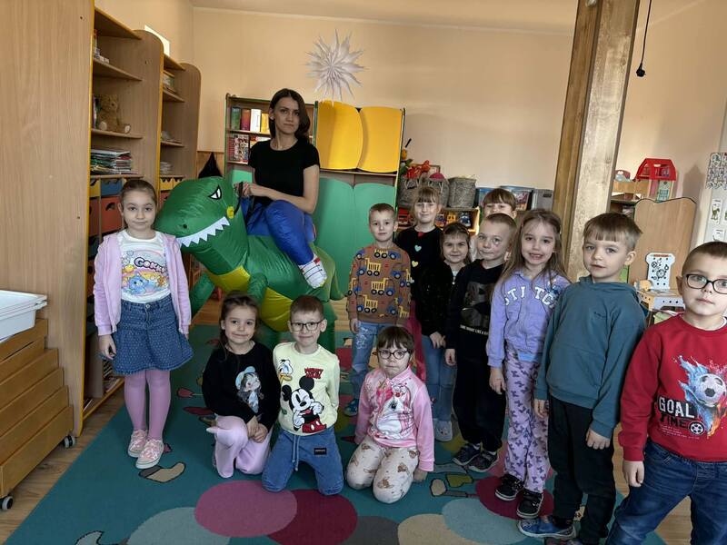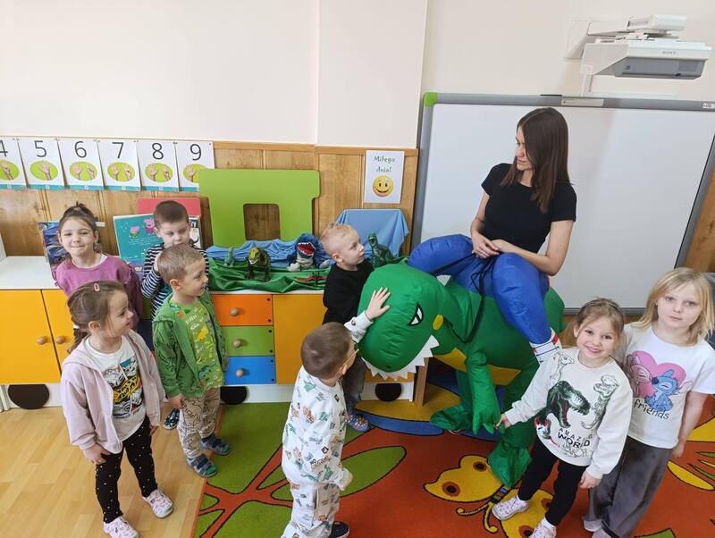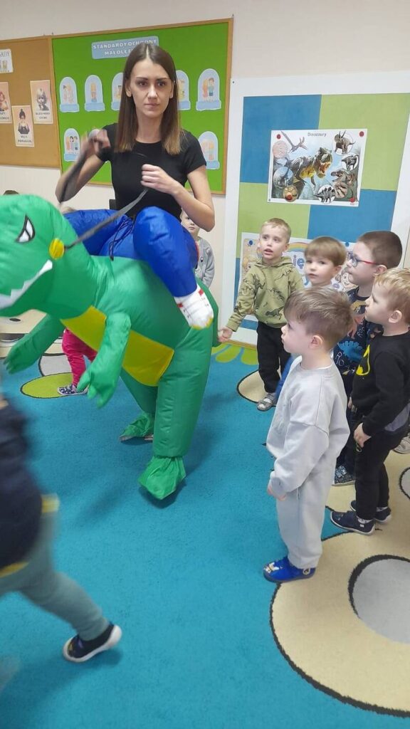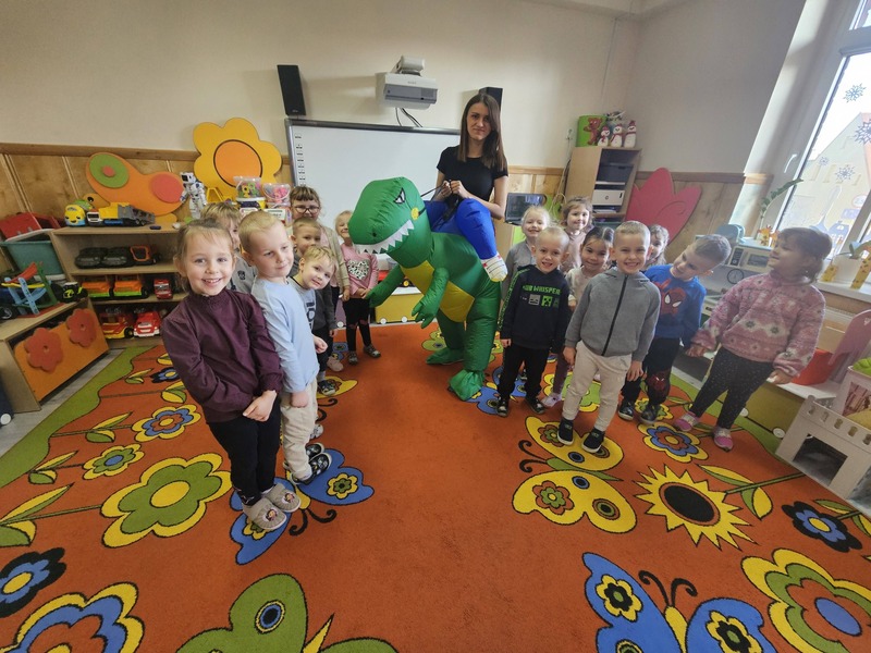 Największą niespodzianką była wyjątkowa wizyta… 🥰 Odwiedził nas prawdziwy dinozaur razem z p. Martą! Radości, śmiechu i emocji nie było końca. Dzieci mogły przywitać się z gościem, zrobić pamiątkowe zdjęcia i przeżyć niezapomniane chwile.