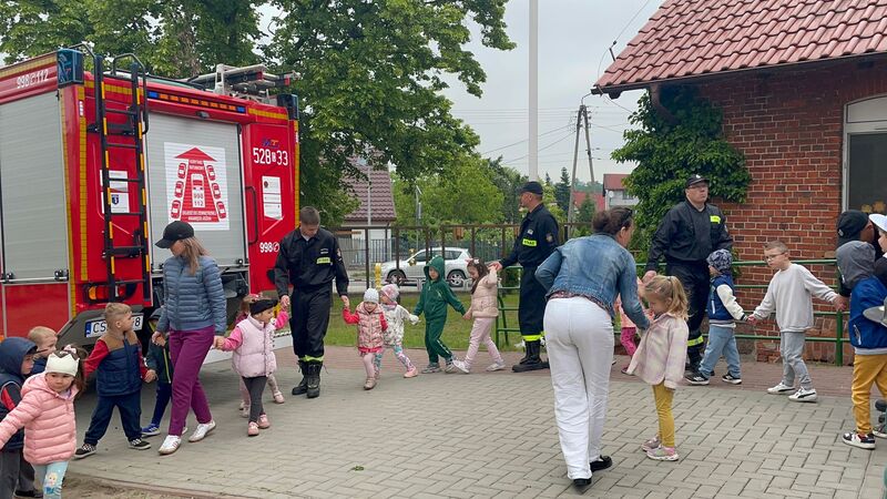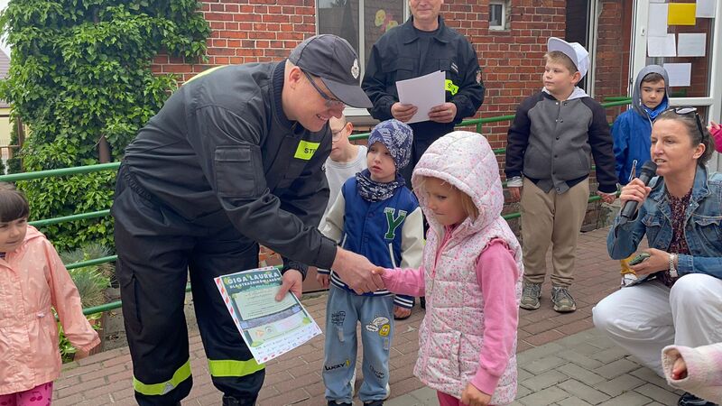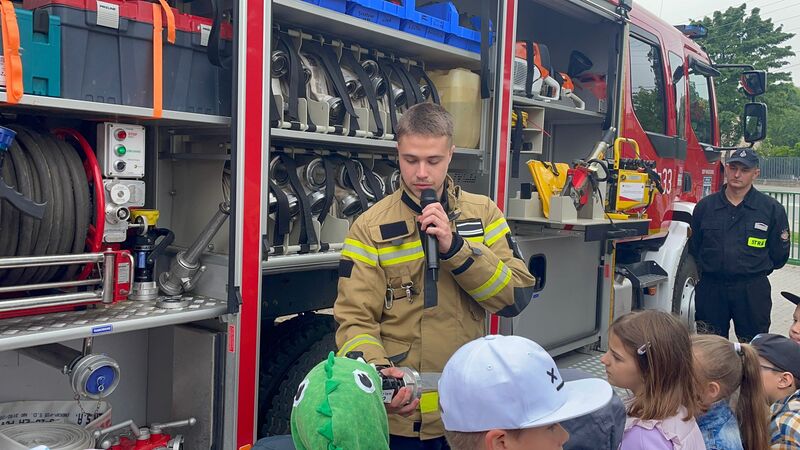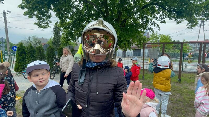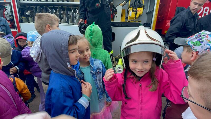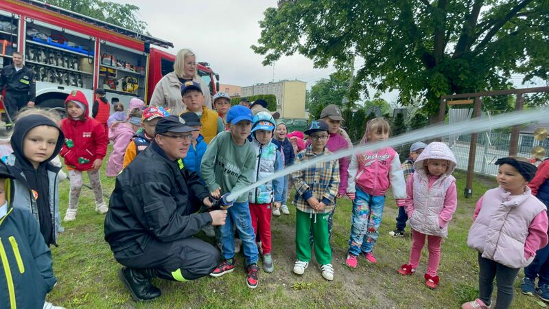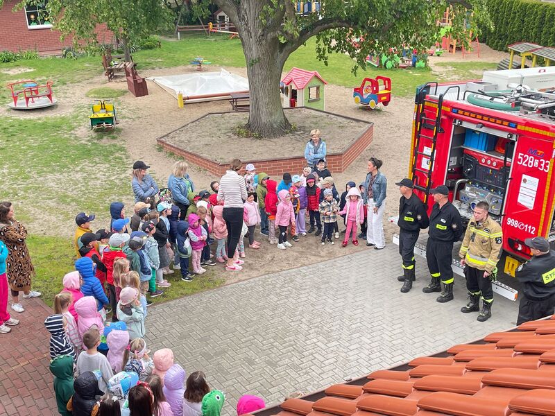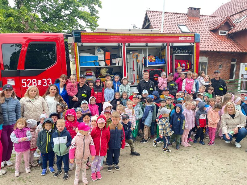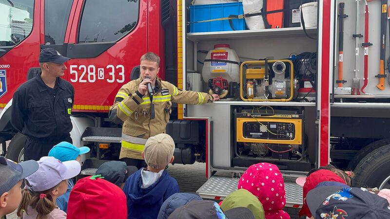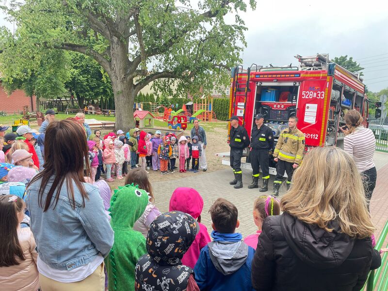Gościliśmy przedstawicieli straży pożarnej. Dzieci mogły zobaczyć z bliska wóz strażacki, wejść do środka i posłuchać ciekawych opowieści o pracy strażaków. Na deser czekały pyszne lody.