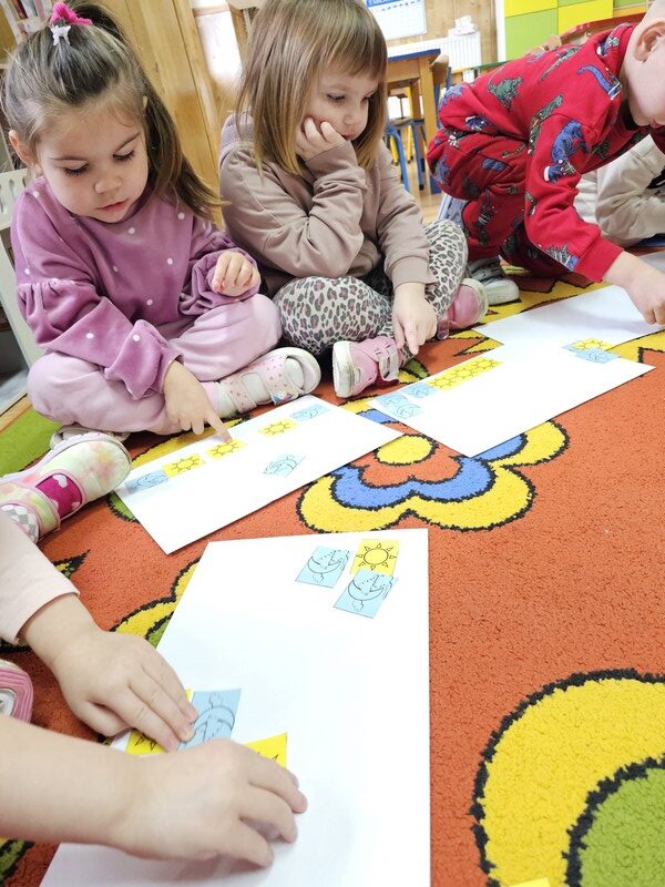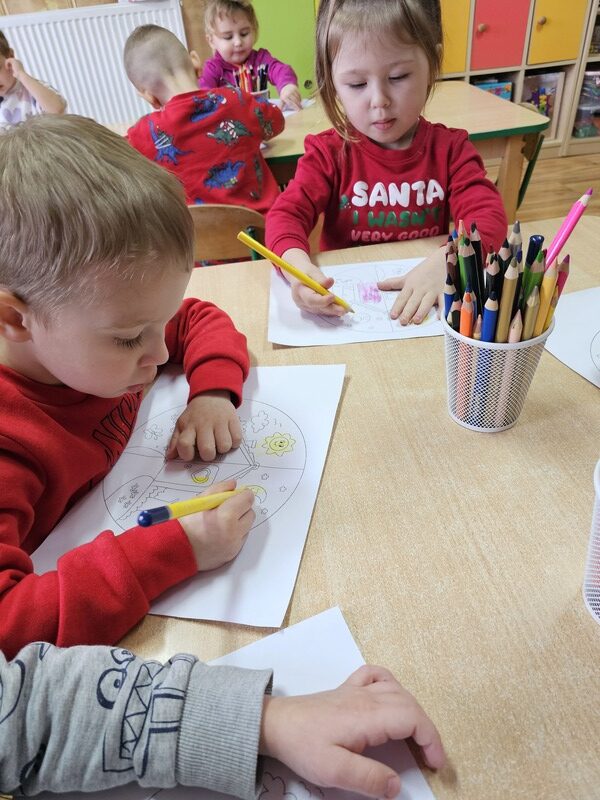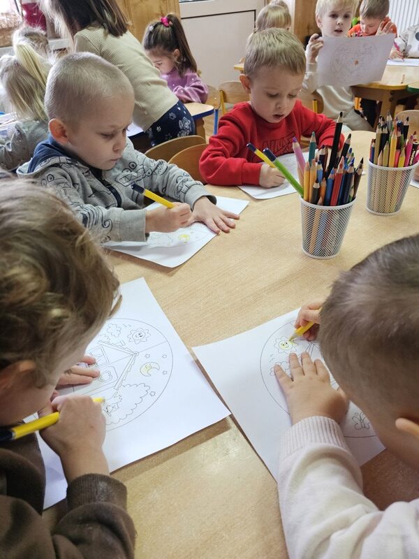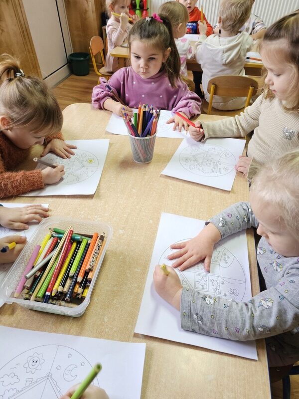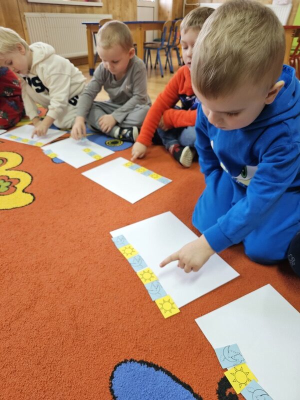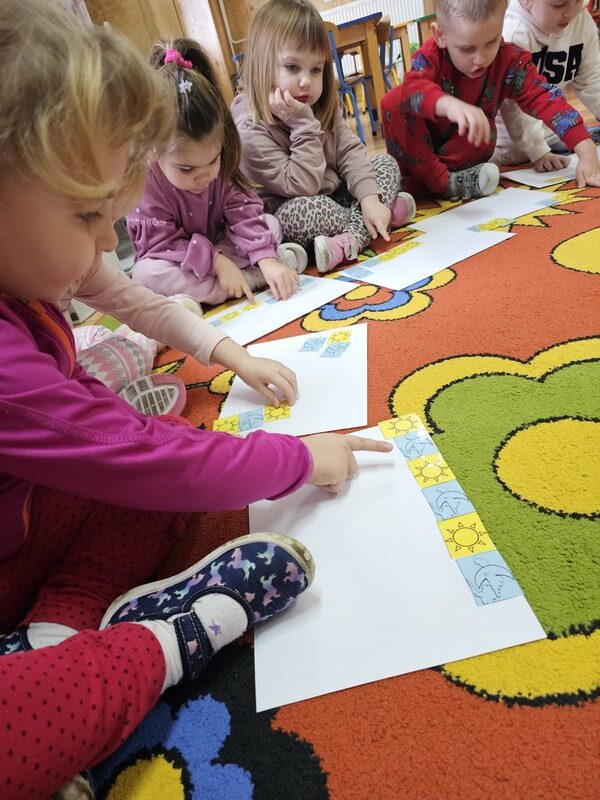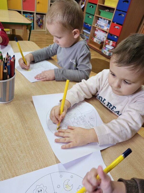 Dziś nasze 3-latki brały udział w ciekawych zajęciach, podczas których poznawały zmiany dnia i nocy oraz pór roku. 🌅🌌 Dzieci układały rytmy „dzień i noc”, a także pracowały na kartach pracy, ucząc się o tym, jak zmienia się świat wokół nas. 📚✨