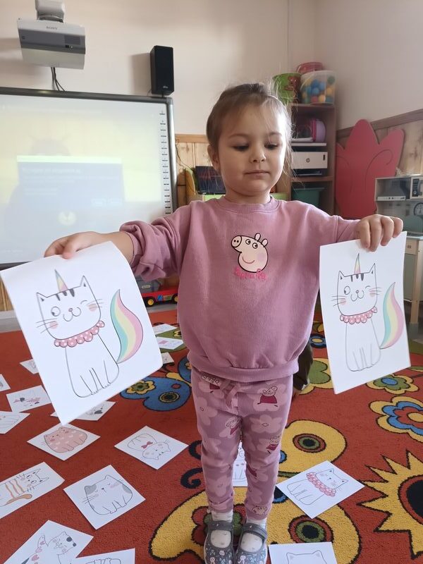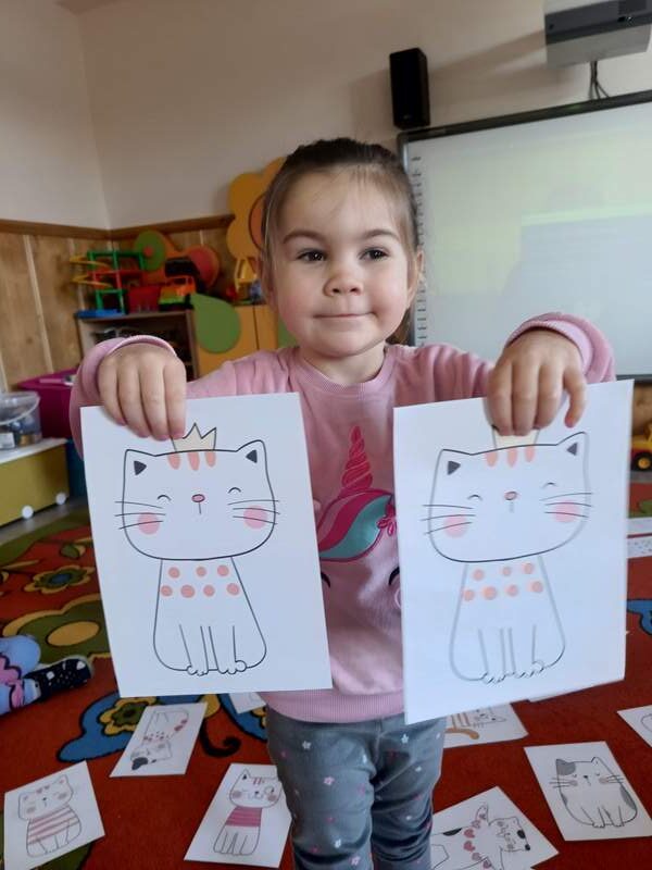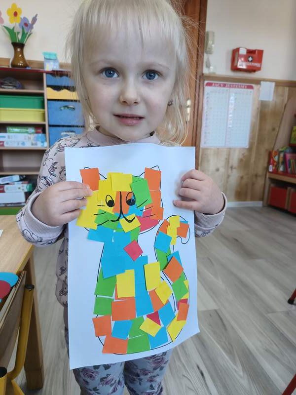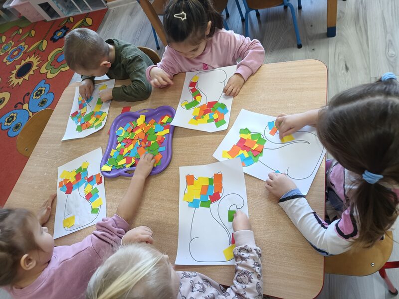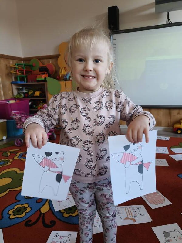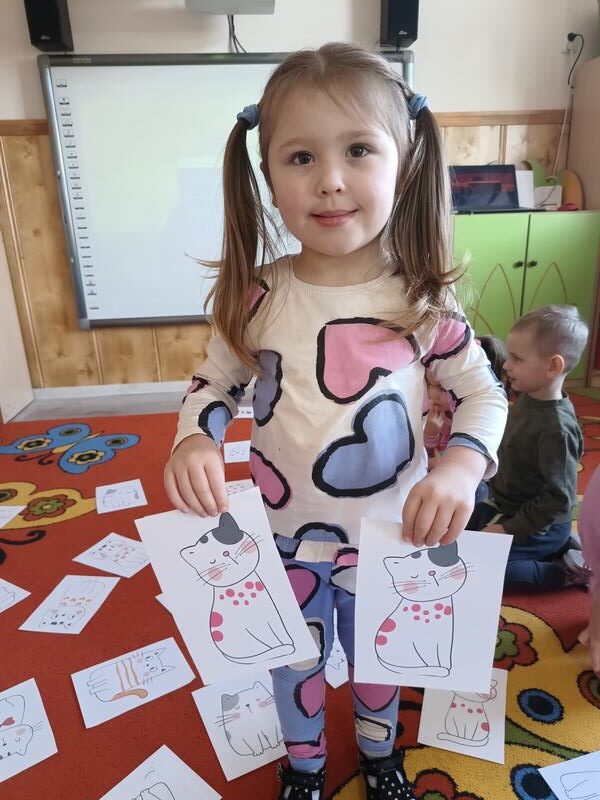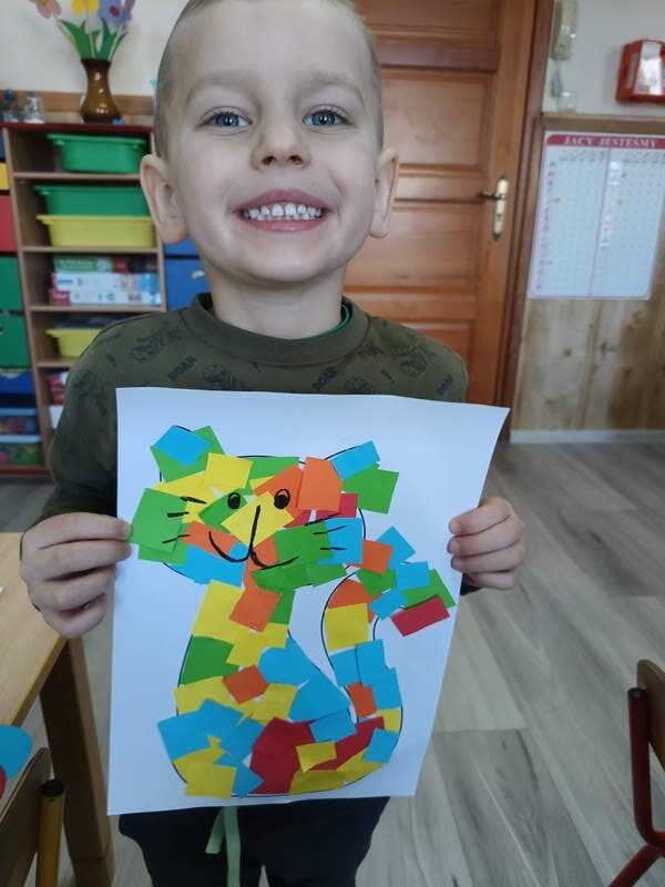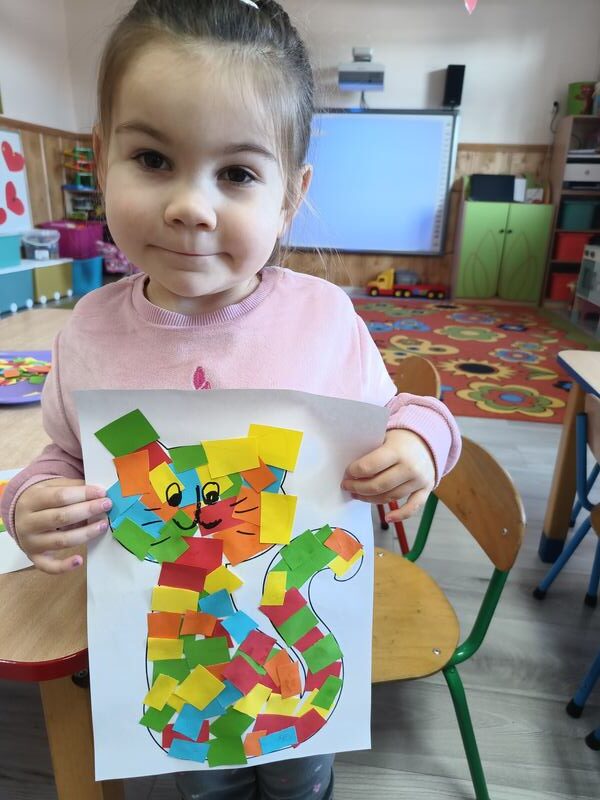17 lutego obchodziliśmy w naszej grupie ,,Dzień Kota”. Od samego rana przedszkolaki były pełne entuzjazmu, przygotowując się do wyjątkowych zajęć poświęconych tym urokliwym czworonogom. Zajęcia rozpoczęły się od interaktywnej prezentacji, podczas której dzieci miały okazję poznać ciekawostki na temat kotów oraz przedmioty, które są niezbędne do karmienia i pielęgnacji. Przedszkolaki tańczyły przy piosenkach o kotach, rozwiązywały zagadki oraz uczestniczyły w różnych zabawach. Na zakończenie zajęć dzieci z wielki zapałem wykonały piękne prace plastyczne, a były to kotki udekorowane kolorowymi kawałkami papieru. Każde dziecko mogło sobie wybrać swoje ulubione kolory, a efekt końcowy był naprawdę imponujący.