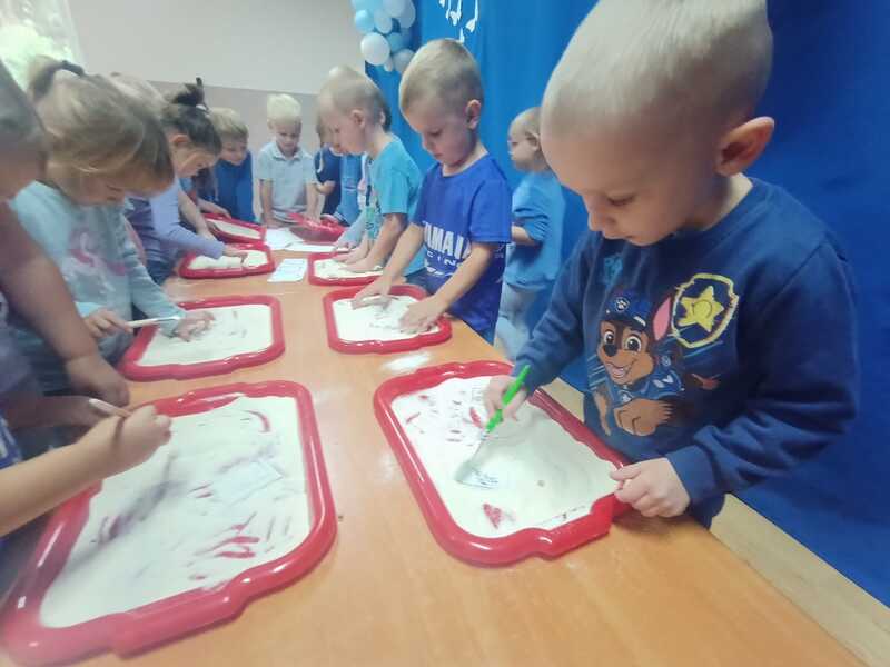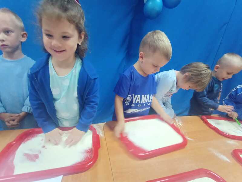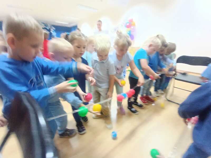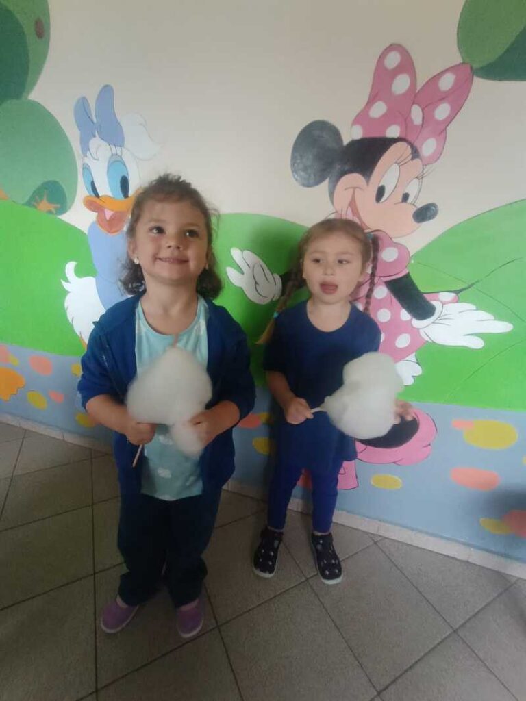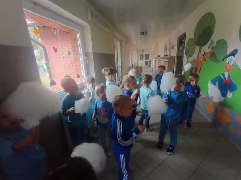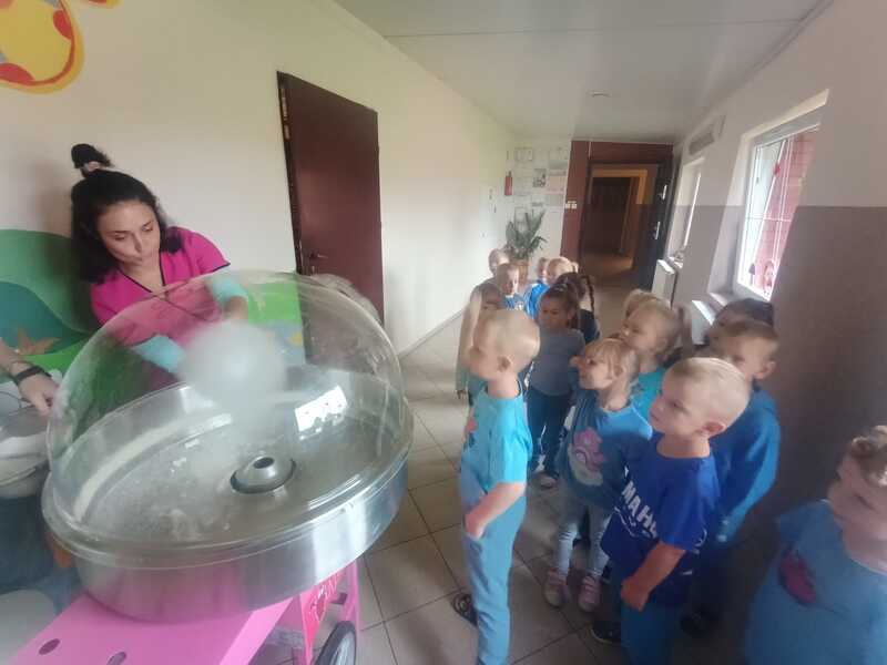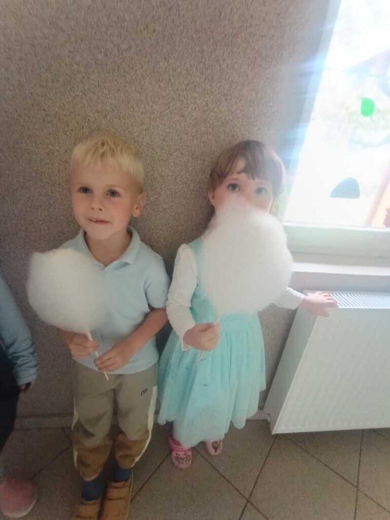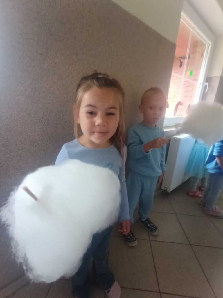 Tego dnia dzieci ubrane na niebiesko wspólnie tworzyły elfikowy plakat, bawiły się i tańczyły w sali ruchu i doświadczenia świata, a na zakończenie czekała na wszystkich pyszna wata cukrowa! 🍭