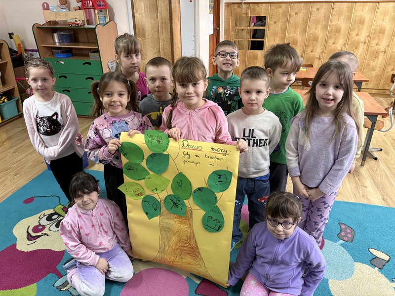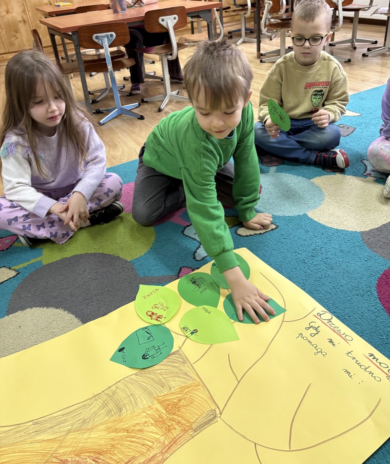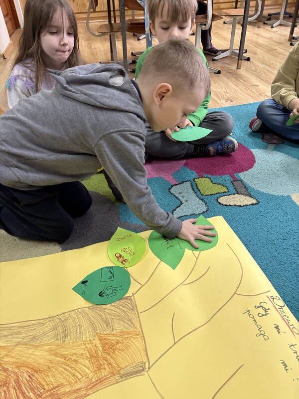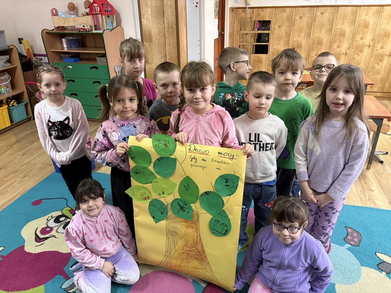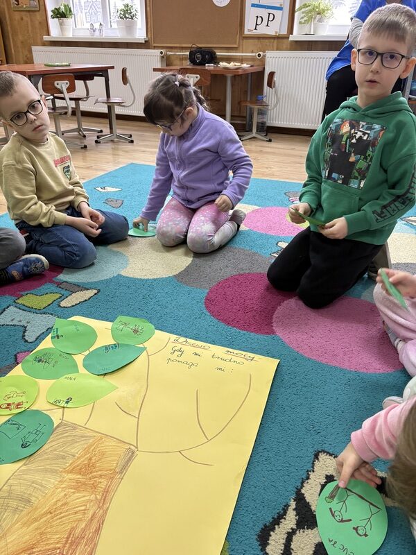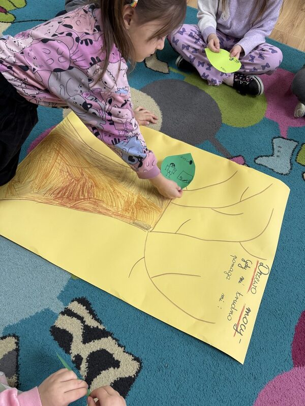 Wspólnie stworzyliśmy pracę plastyczną — „Drzewo mocy”. Na jego gałęziach zawiesiliśmy listki z pomysłami dzieci: tym, co pomaga im w trudnych chwilach, co dodaje im siły i poprawia humor.