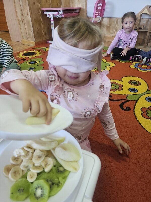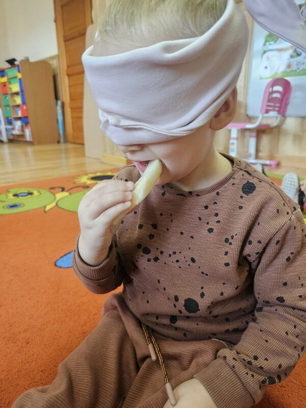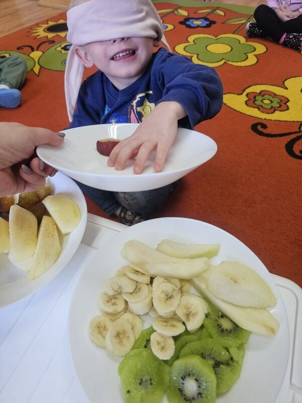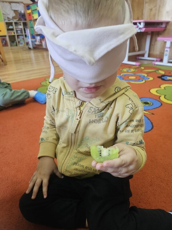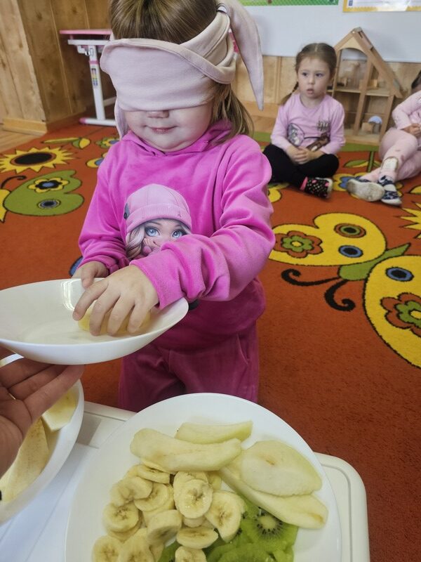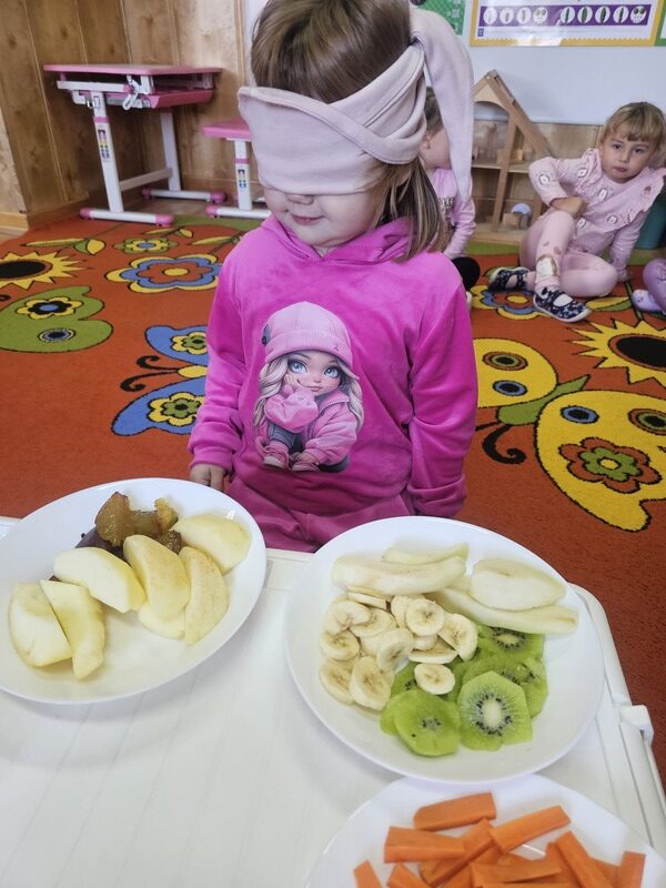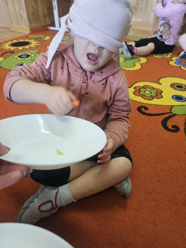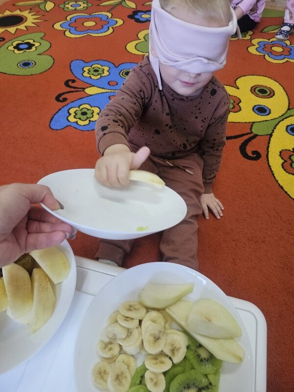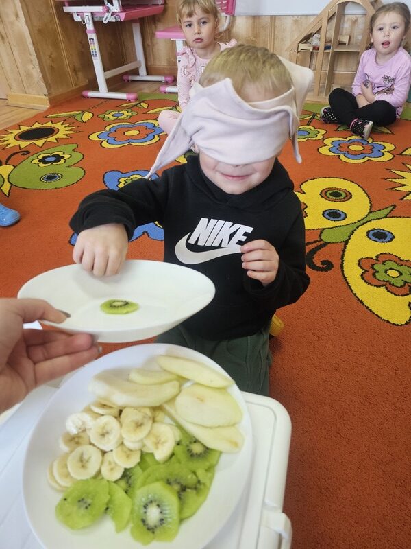 Zaczęliśmy od rozpoznawania różnych owoców i warzyw – dzieci miały okazję przyjrzeć się im, a także nauczyć się ich nazw. Następnie przeszliśmy do wyjątkowej zabawy, w której maluszki zgadywały, co to za owoc lub warzywo, mając zamknięte oczy. To było nie lada wyzwanie, ale i ogromna frajda!