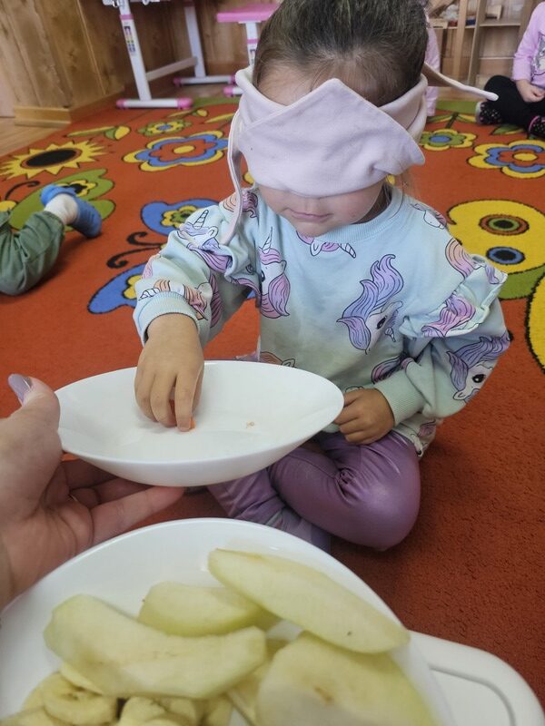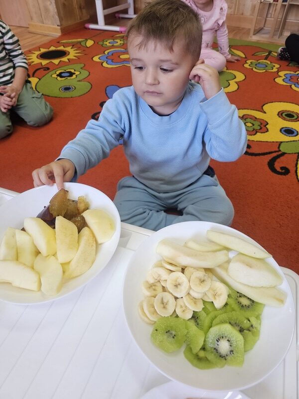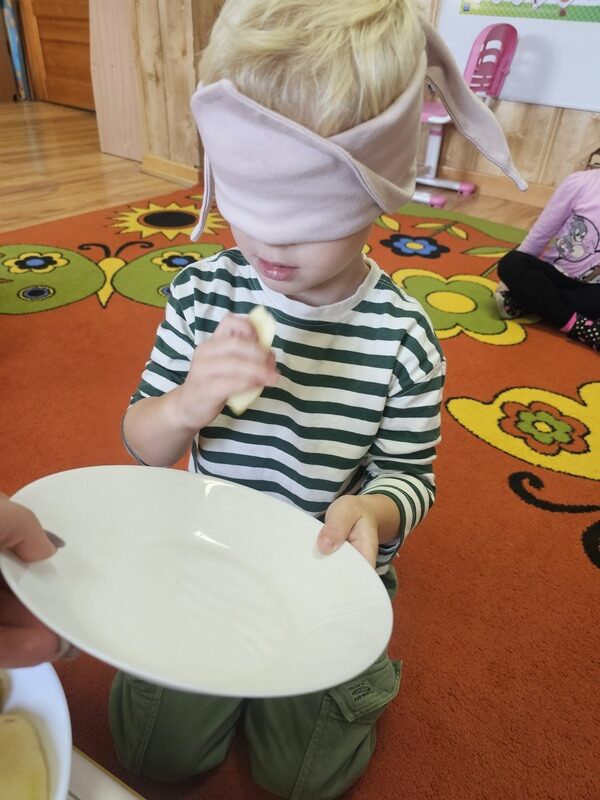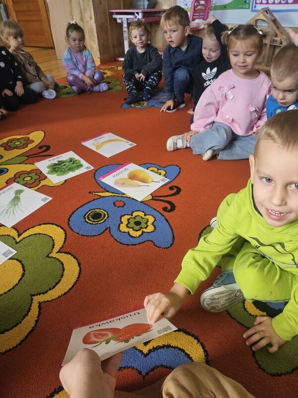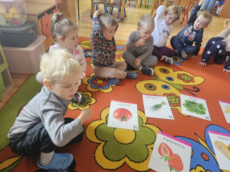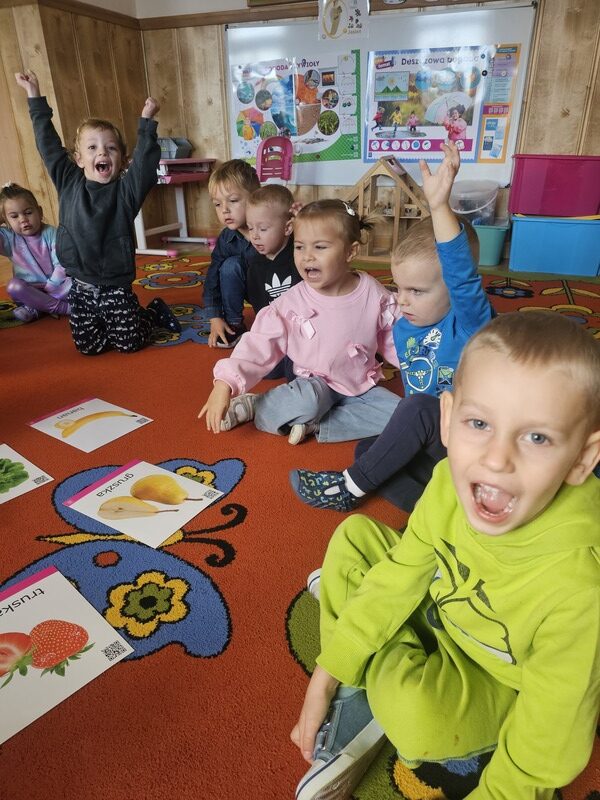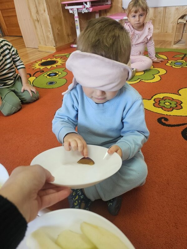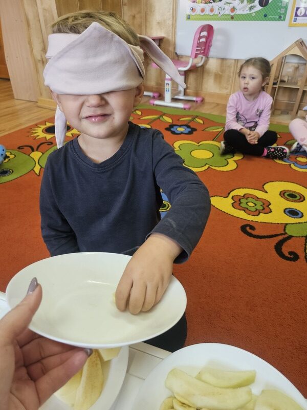 Zaczęliśmy od rozpoznawania różnych owoców i warzyw – dzieci miały okazję przyjrzeć się im, a także nauczyć się ich nazw. Następnie przeszliśmy do wyjątkowej zabawy, w której maluszki zgadywały, co to za owoc lub warzywo, mając zamknięte oczy. To było nie lada wyzwanie, ale i ogromna frajda!