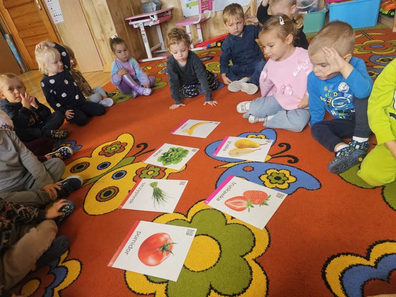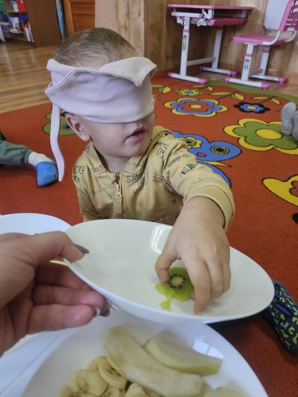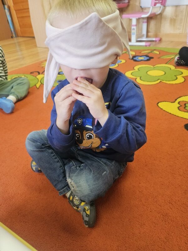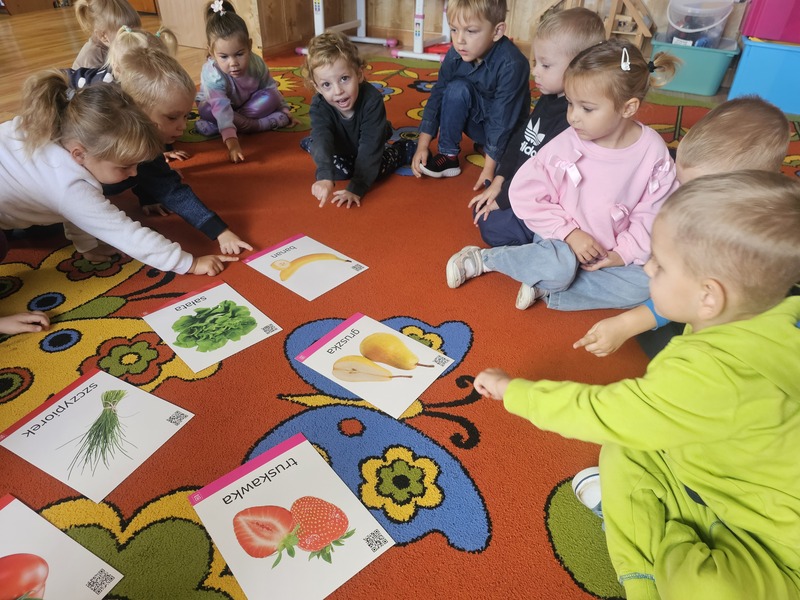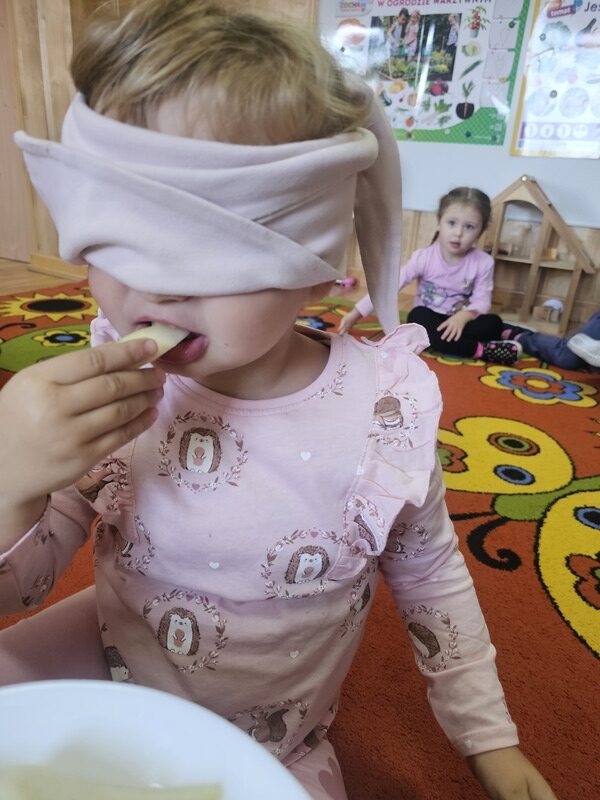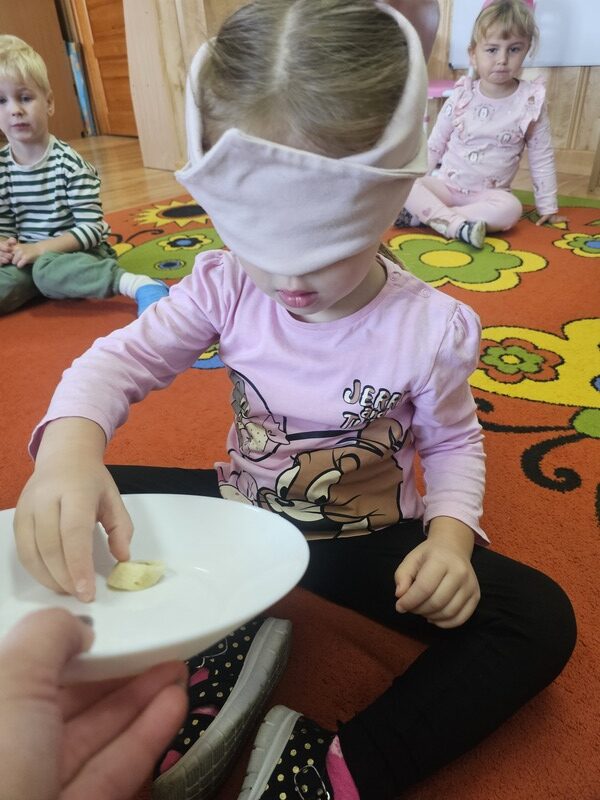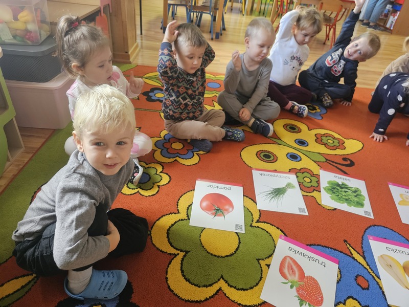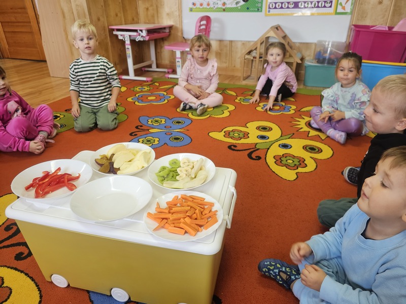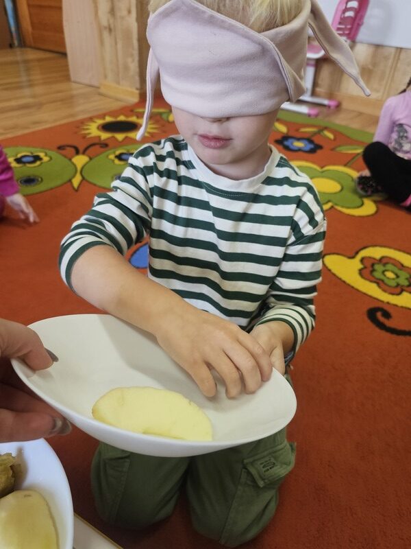 Zaczęliśmy od rozpoznawania różnych owoców i warzyw – dzieci miały okazję przyjrzeć się im, a także nauczyć się ich nazw. Następnie przeszliśmy do wyjątkowej zabawy, w której maluszki zgadywały, co to za owoc lub warzywo, mając zamknięte oczy. To było nie lada wyzwanie, ale i ogromna frajda!