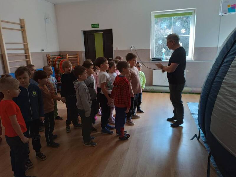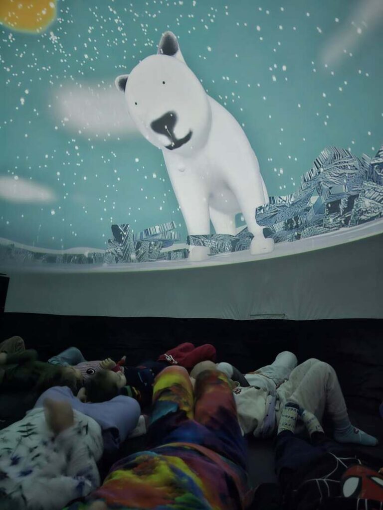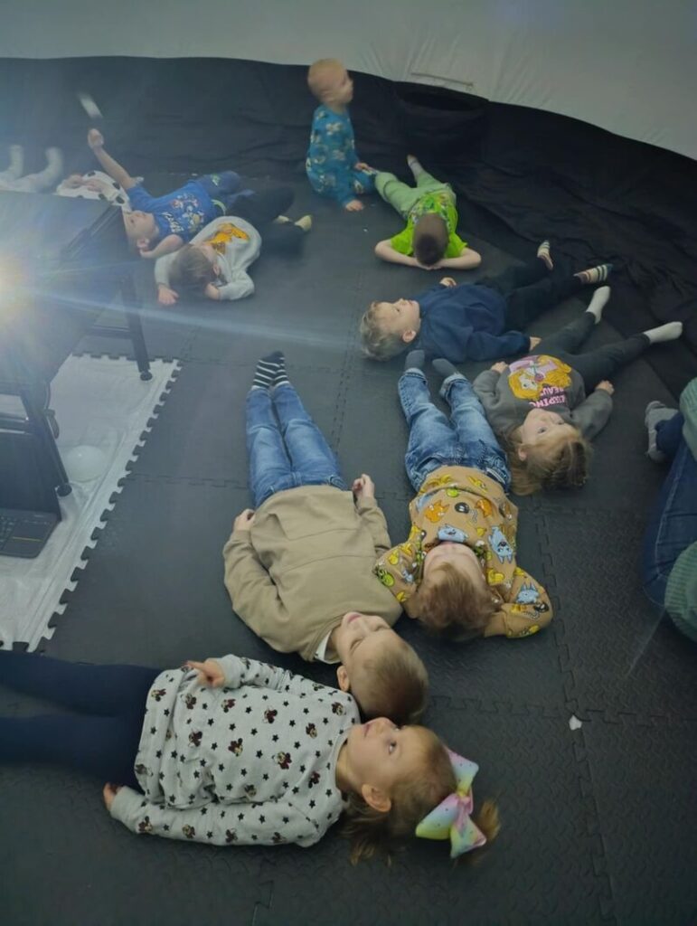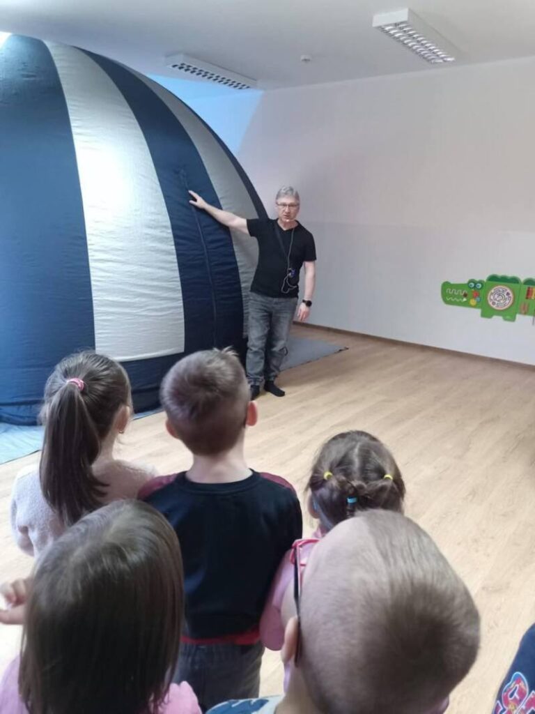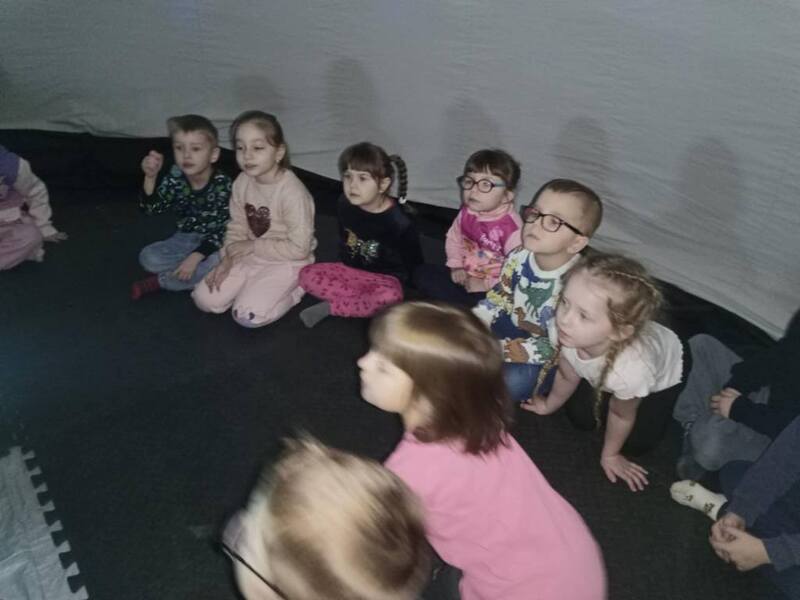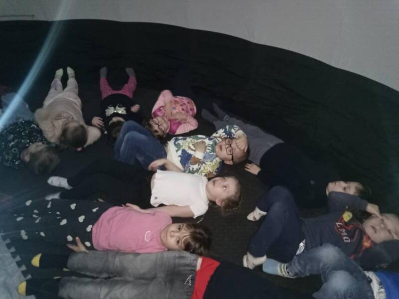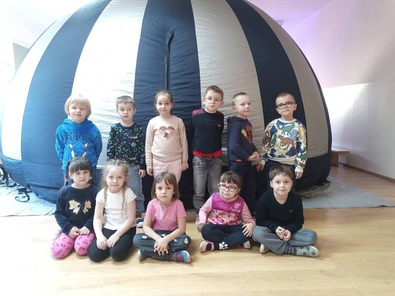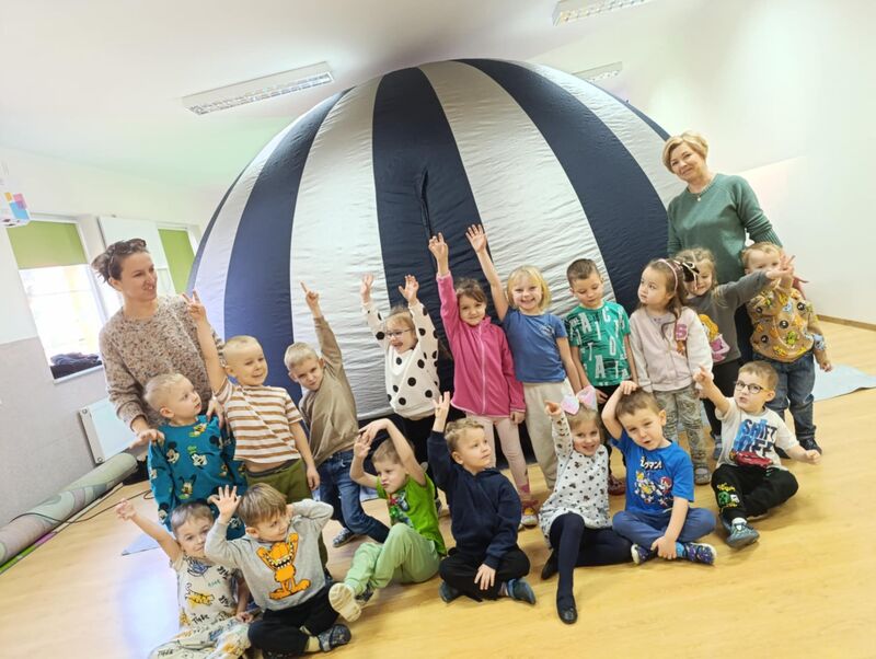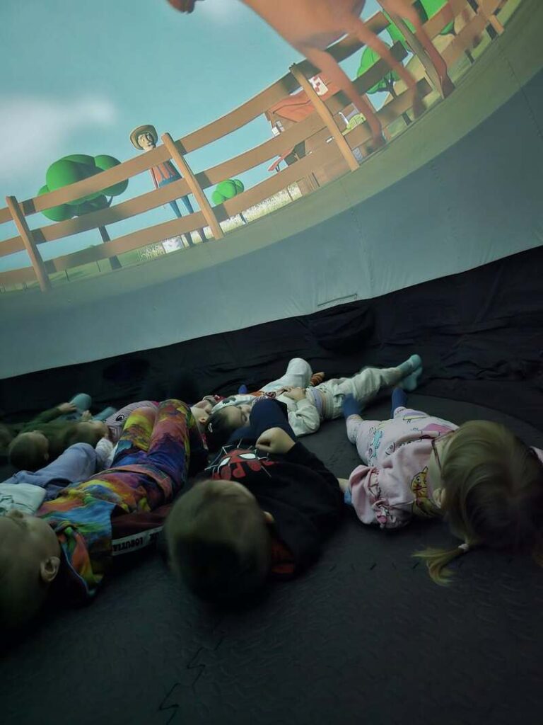 Dziś nasze przedszkole zamieniło się w prawdziwą salę kinową, a to wszystko dzięki niezwykłej wizycie kina sferycznego. Dzieci miały okazję zanurzyć się w fascynujący świat filmów edukacyjnych w formacie 360°, oglądając je w specjalnej, nadmuchiwanej kopule.