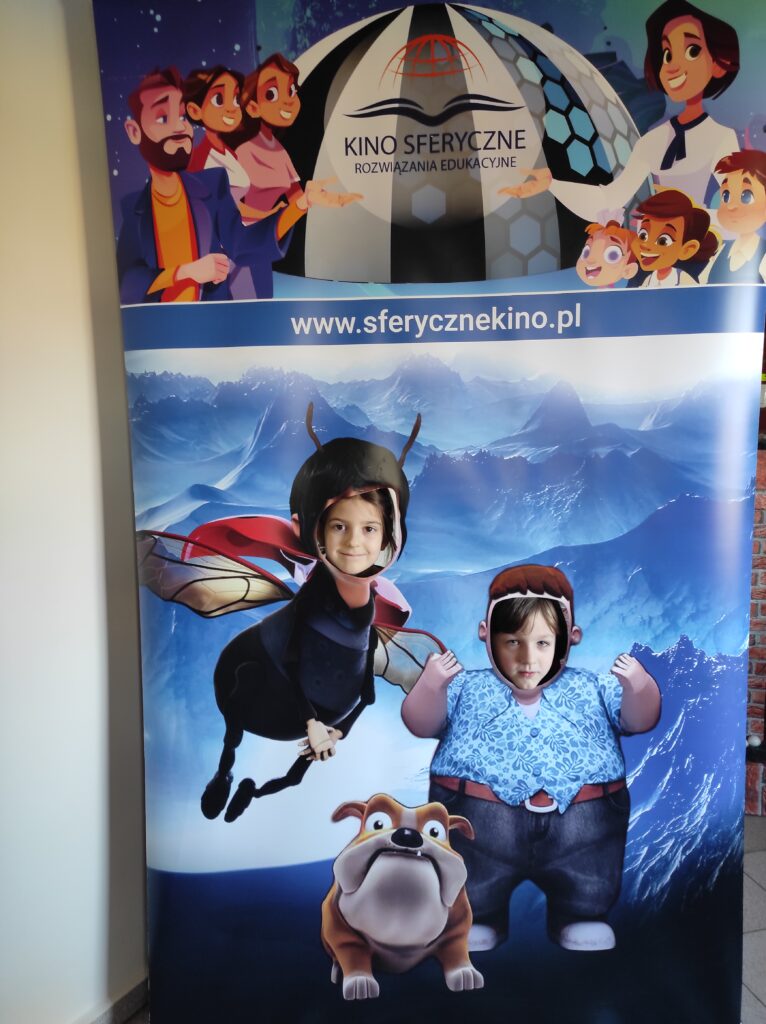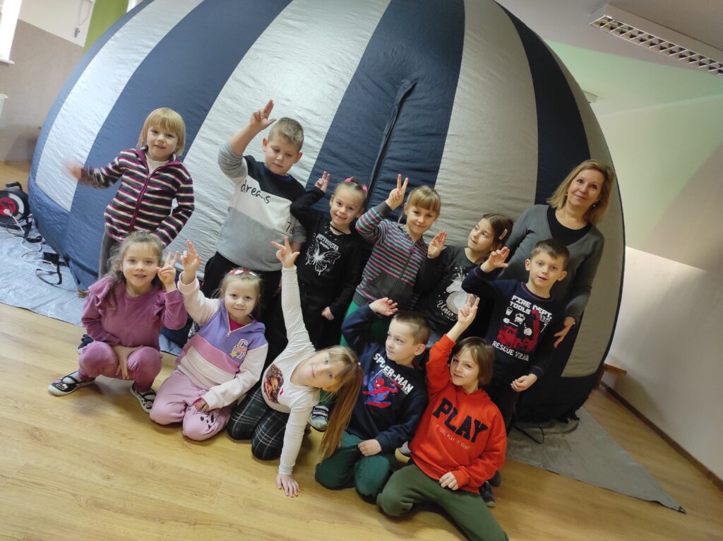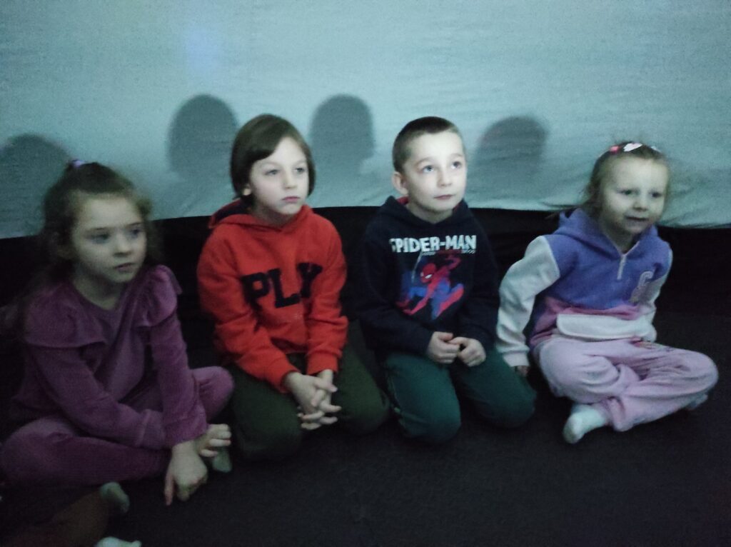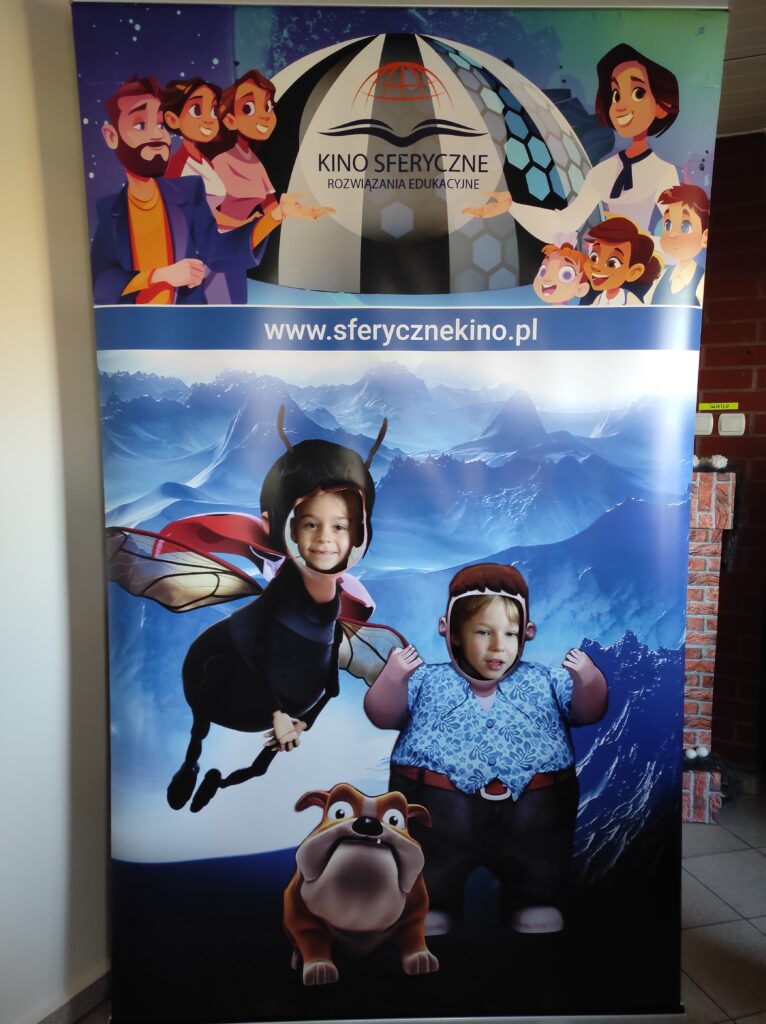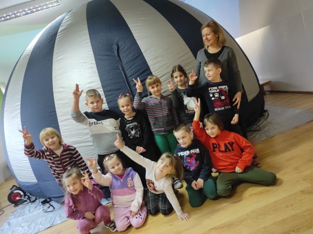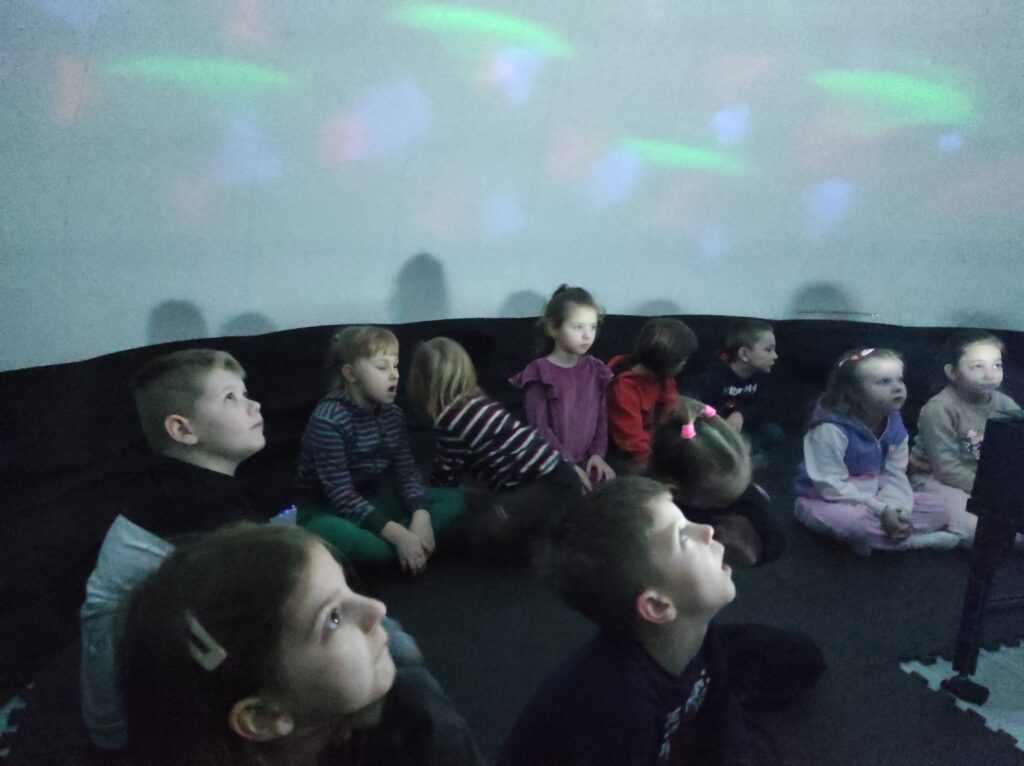Do naszego przedszkola przyjechało kino sferyczne. Dzięki tej nietradycyjnej formie pokazu przedszkolaki nie ruszając się z miejsca, przeniosły się do innej przestrzeni. Dzieci obejrzały film edukacyjny o Ziemi – naszej planecie i zmieniających się porach roku. Poprzez trójwymiarową przestrzeń, atrakcyjne widoki i niesamowite efekty dźwiękowe dzieci chętniej i szybciej zrozumiały i zapamiętały przekazywaną im wiedzę.