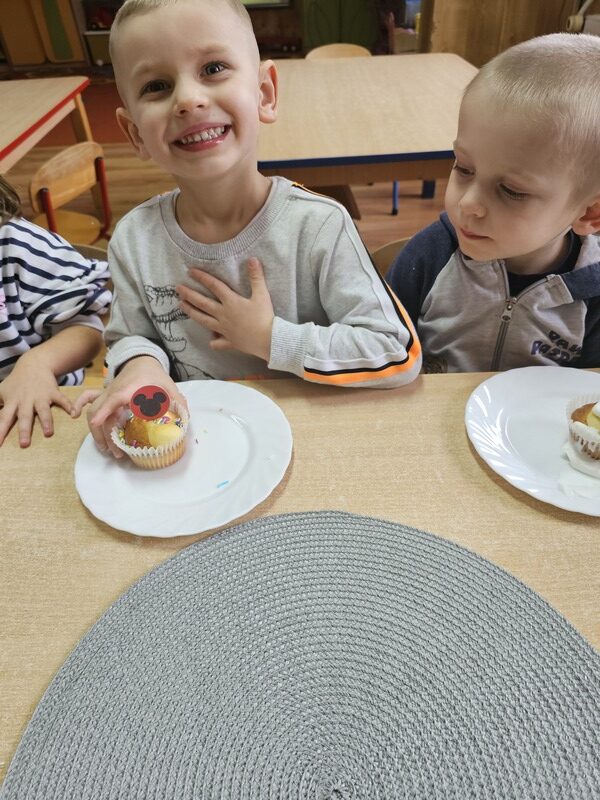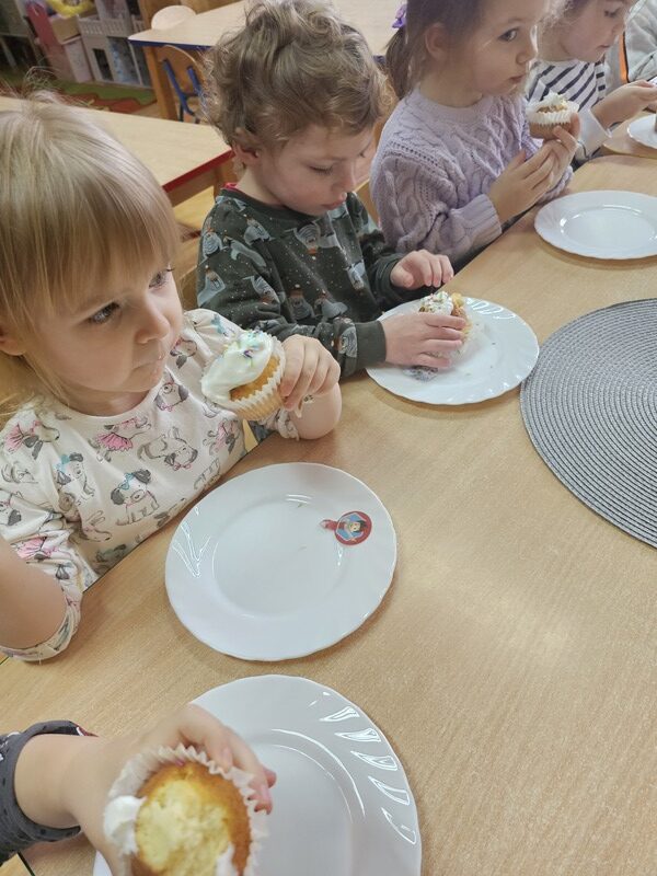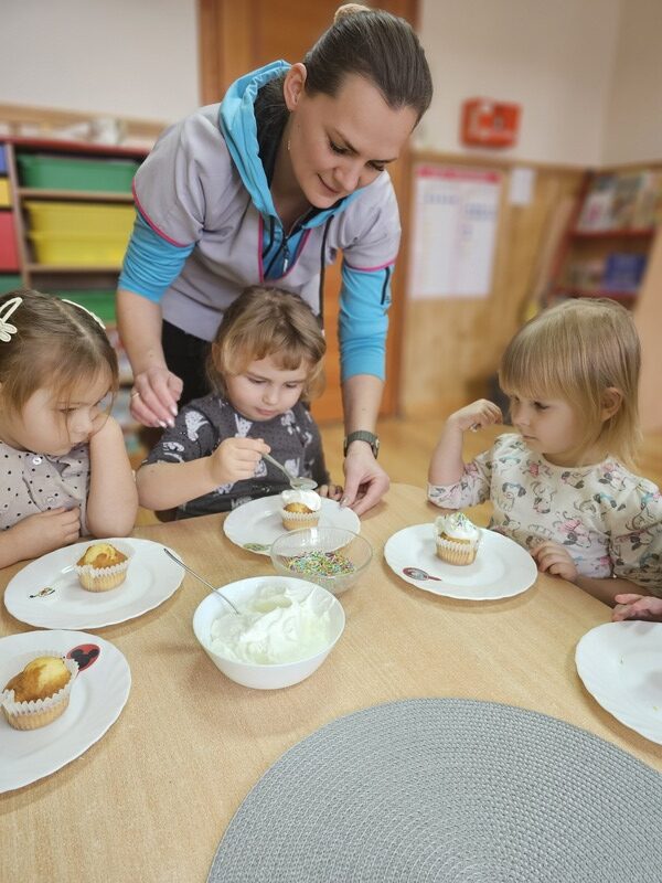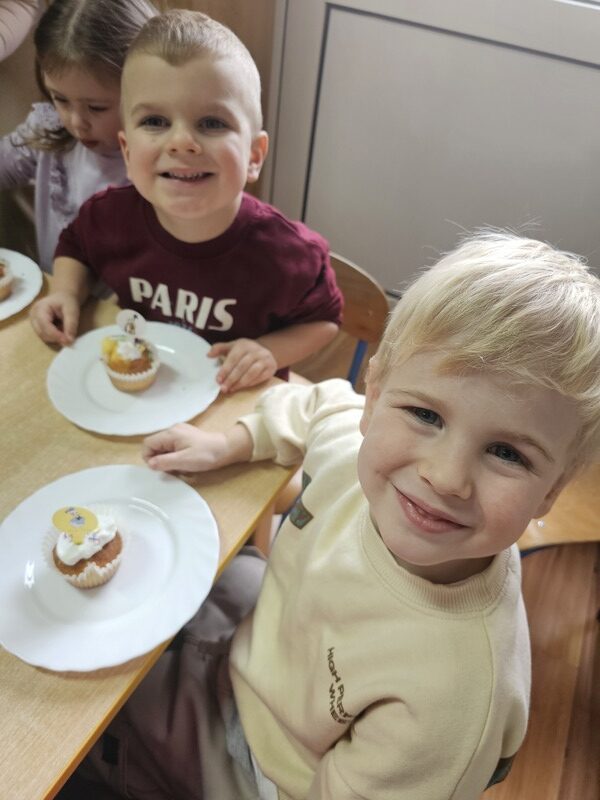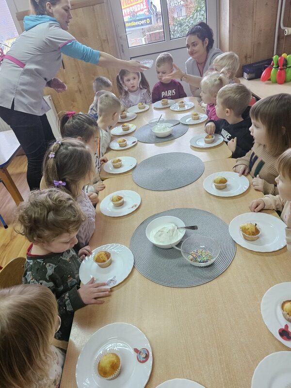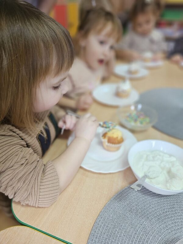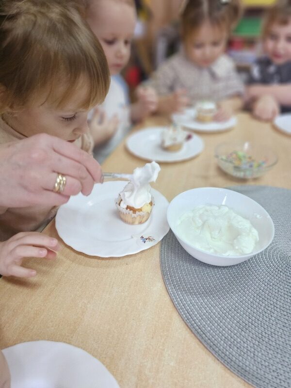 Dziś nasze 3-latki miały okazję ozdabiać pyszne muffinki! 🎨🍪 Dzieci dowiedziały się, jak je przygotować, a potem z radością dekorowały je kolorowymi posypkami, czekoladą i owocami. 🍓🍫