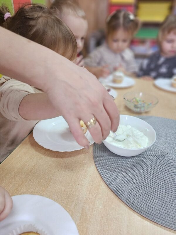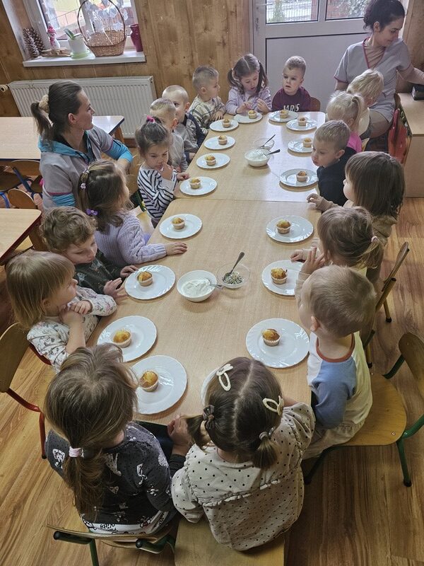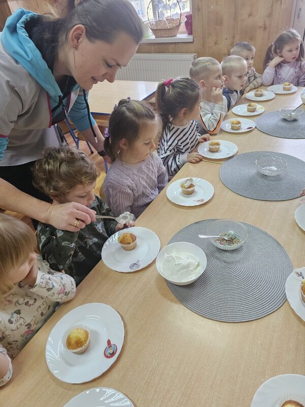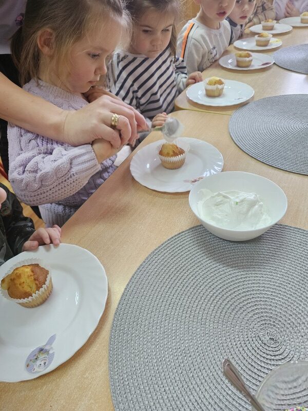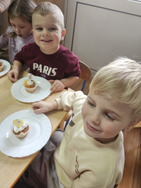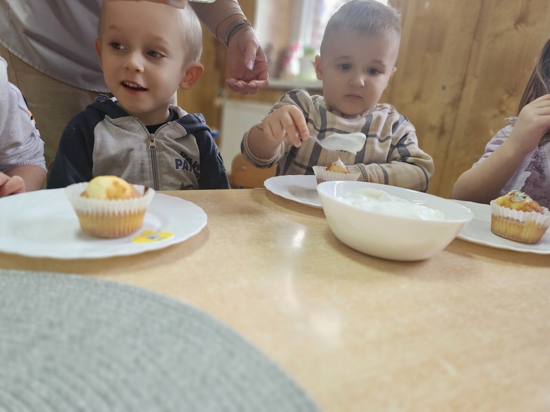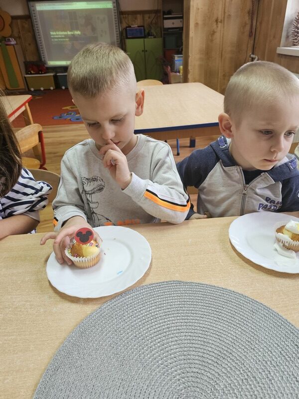 Dziś nasze 3-latki miały okazję ozdabiać pyszne muffinki! 🎨🍪 Dzieci dowiedziały się, jak je przygotować, a potem z radością dekorowały je kolorowymi posypkami, czekoladą i owocami. 🍓🍫