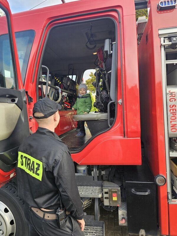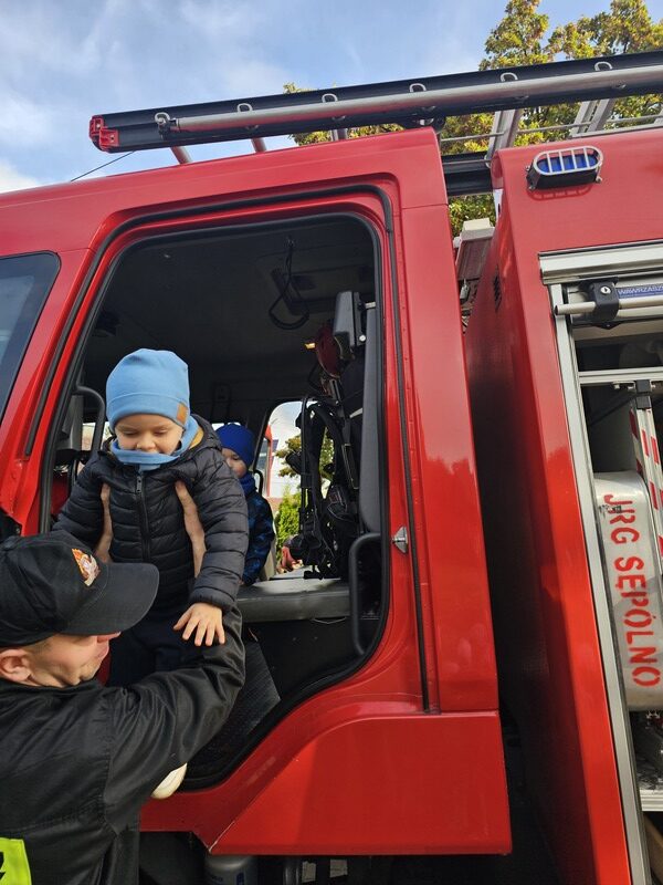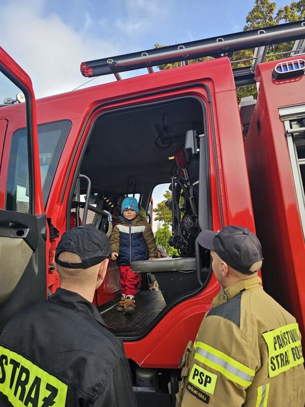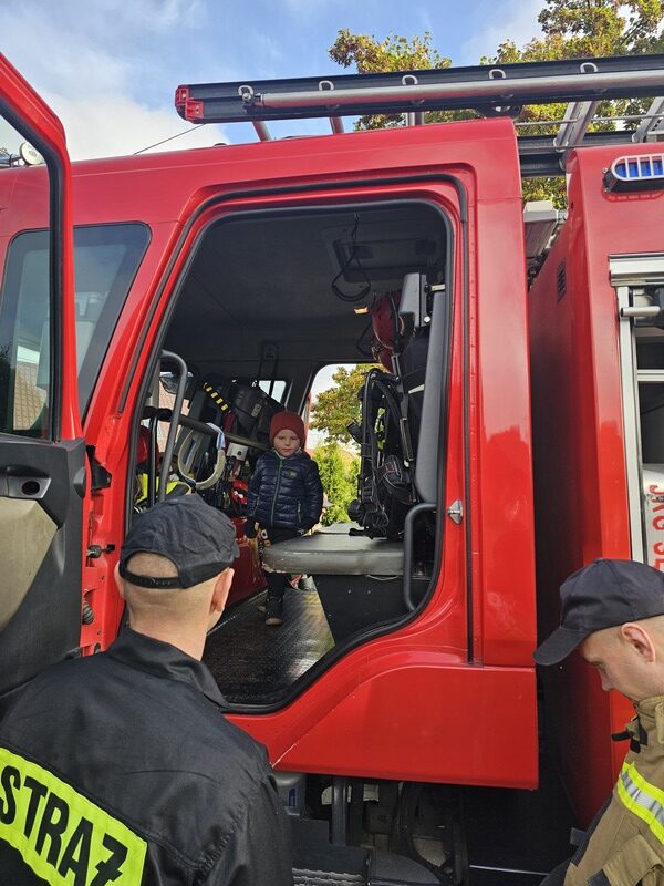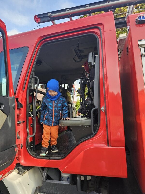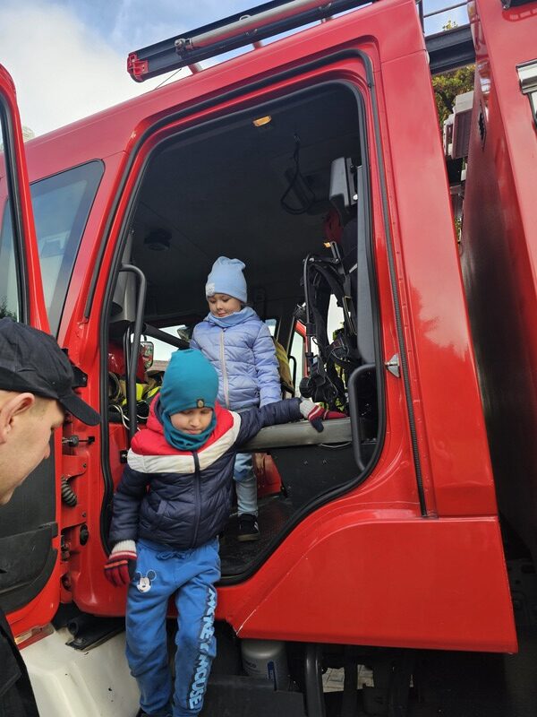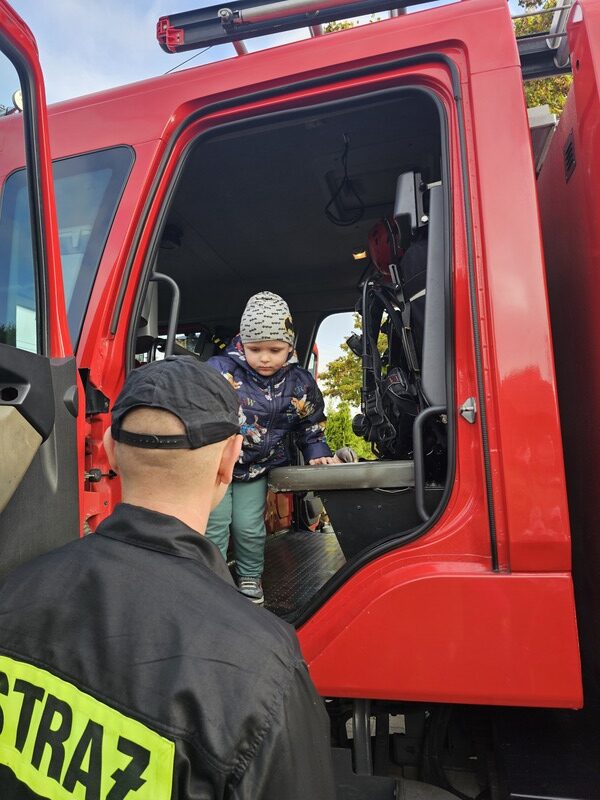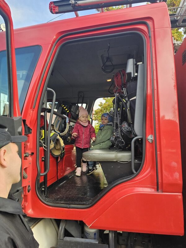 Po zakończeniu ćwiczeń dzieci czekała niezwykła niespodzianka – na przedszkolnym placu pojawił się wóz strażacki! Strażacy opowiedzieli przedszkolakom o swojej pracy, pokazali sprzęt ratowniczy i pozwolili zajrzeć do wnętrza pojazdu. „Żabki” z wielkim zainteresowaniem słuchały opowieści, oglądały hełmy, węże strażackie i inne elementy wyposażenia.