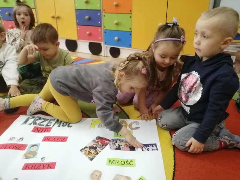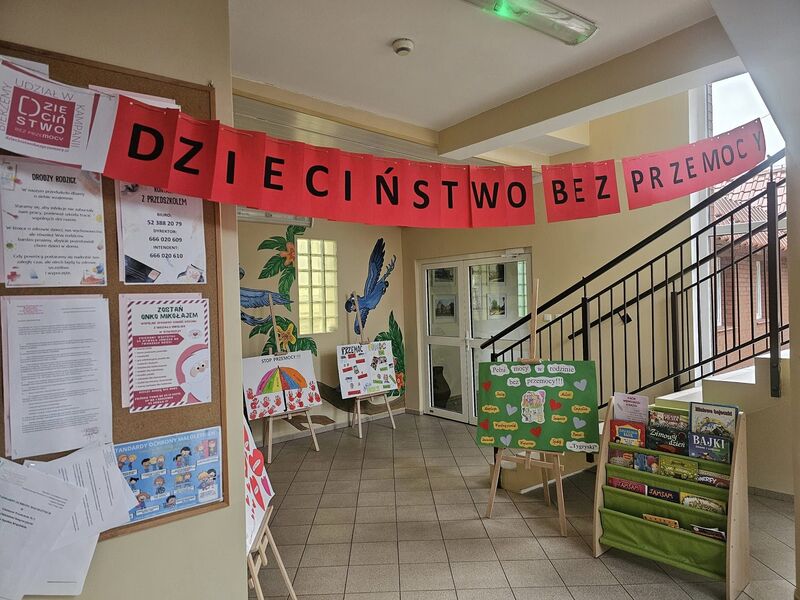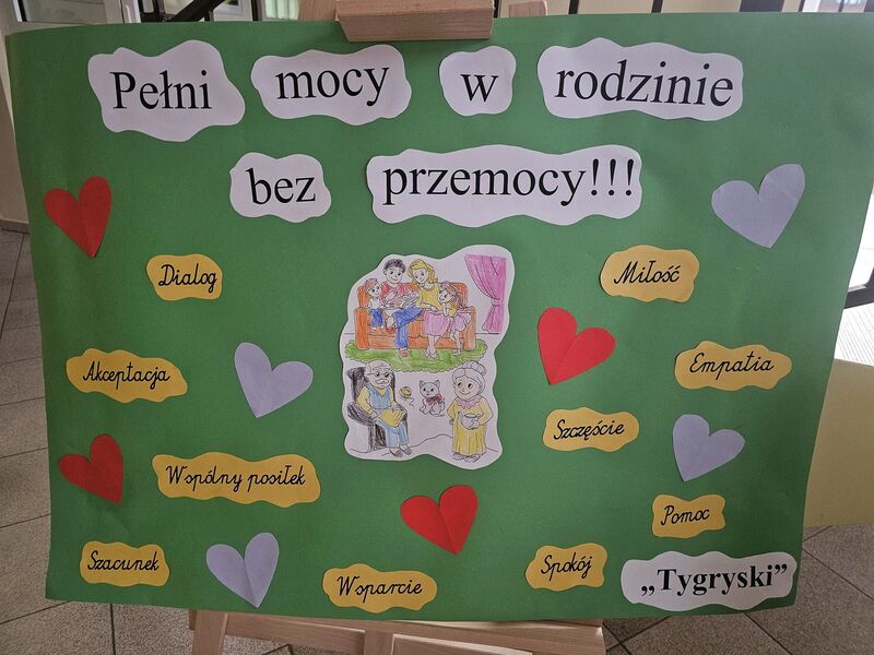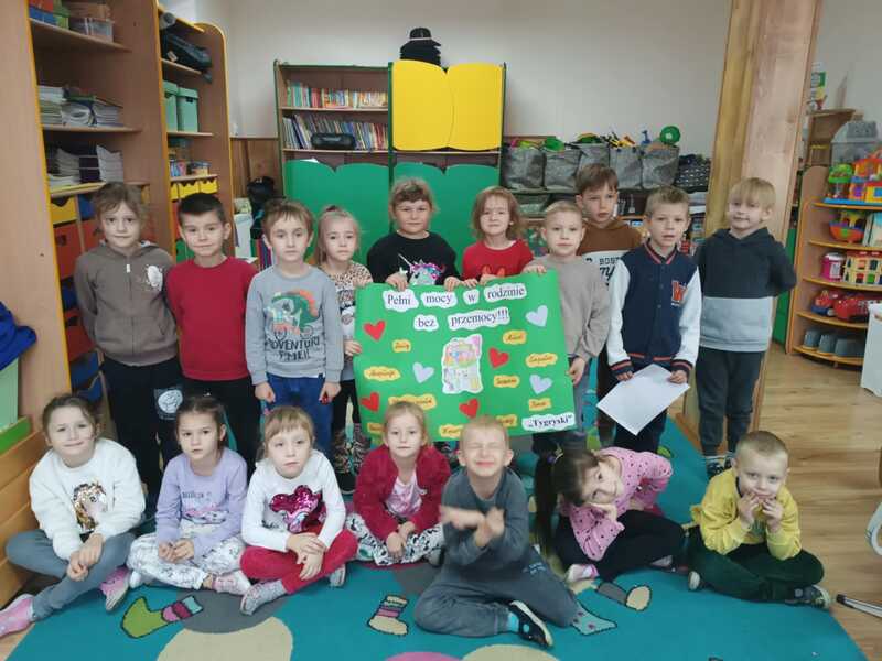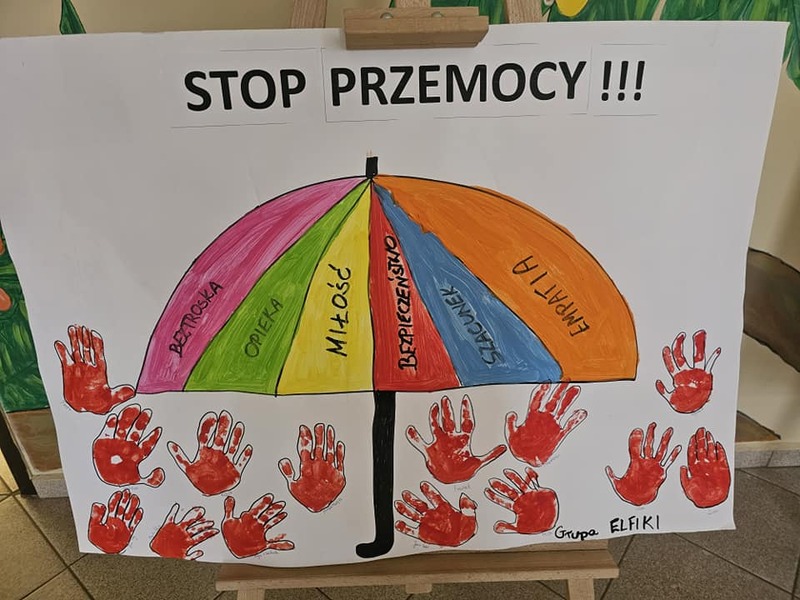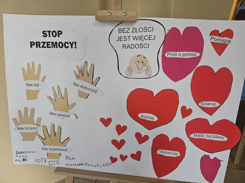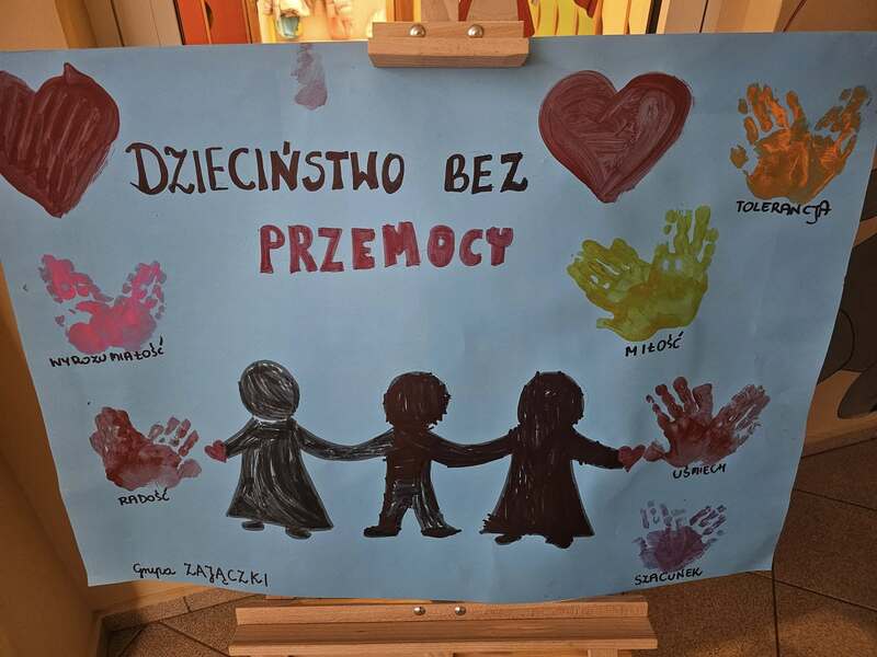 Każda grupa przygotowała także plakat promujący przeciwdziałanie przemocy, na którym dzieci wyraziły swoje przemyślenia i przesłanie w formie rysunków oraz haseł. Powstałe prace zostały wystawione w holu naszego przedszkola, gdzie mogą je podziwiać dzieci, rodzice i wszyscy odwiedzający.