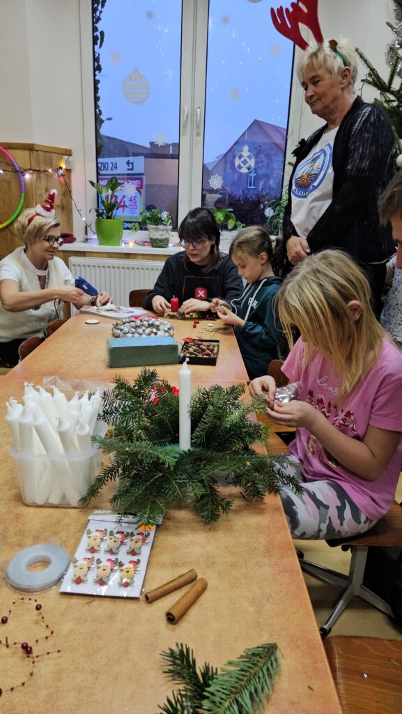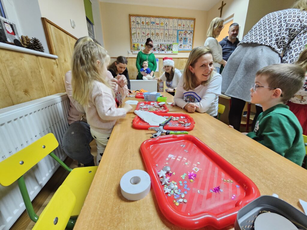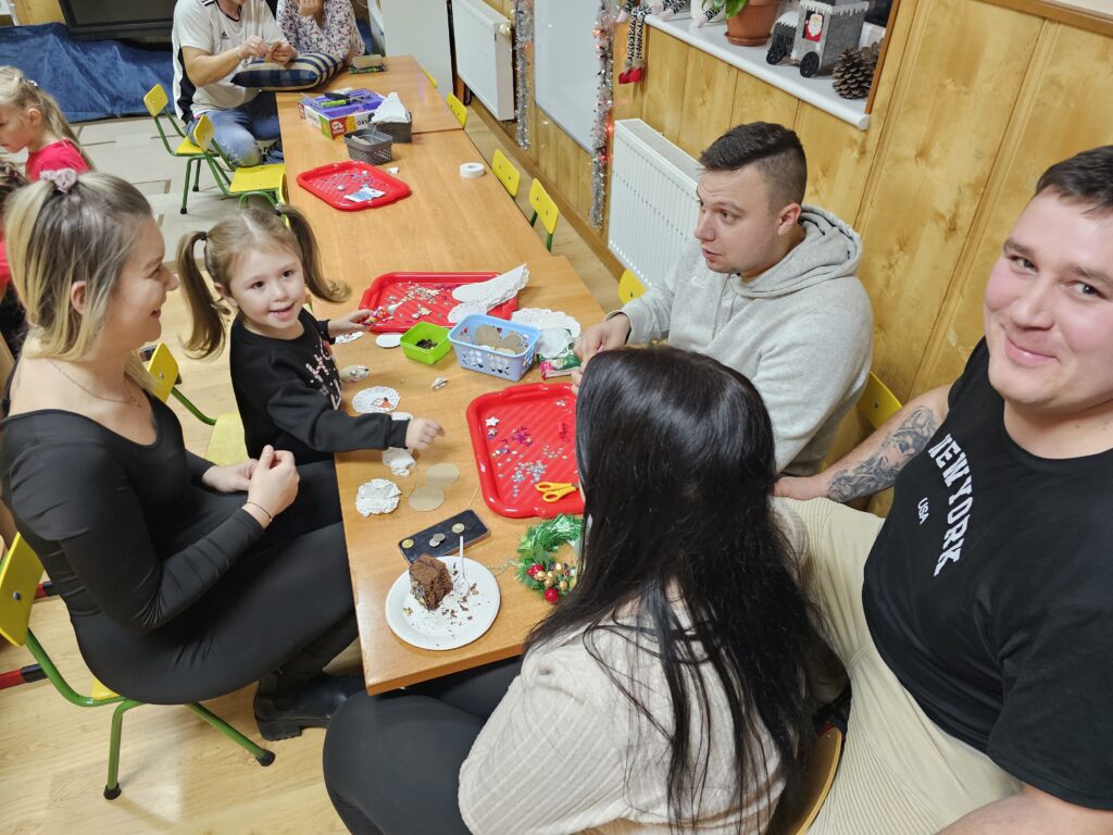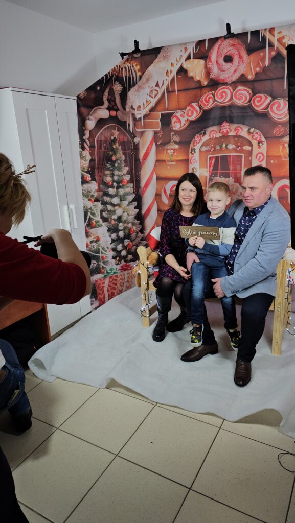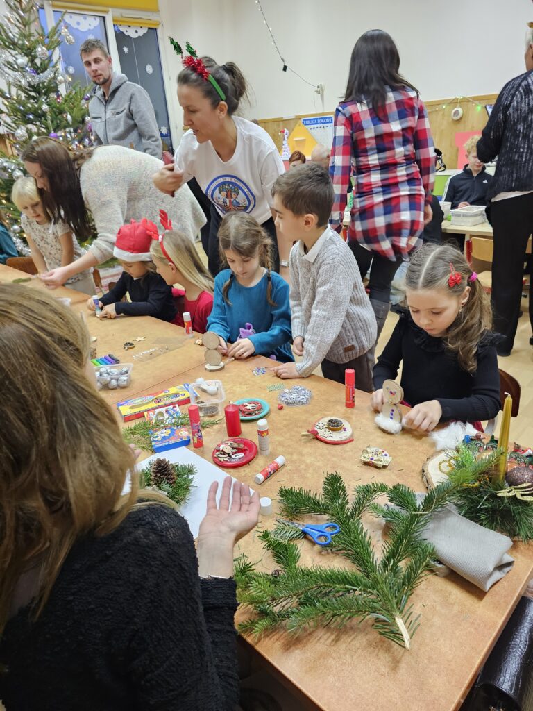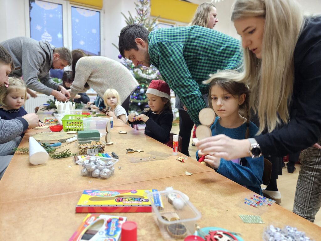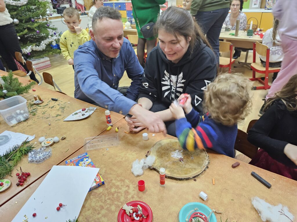 Nie zabrakło również atrakcji dla miłośników kreatywnej zabawy. Warsztaty plastyczno-techniczne cieszyły się ogromnym zainteresowaniem – uczestnicy mogli samodzielnie stworzyć stroiki i ozdoby świąteczne, które z pewnością ozdobią ich domy. Dla tych, którzy chcieli uwiecznić wspomnienia, przygotowaliśmy fotobudkę, a najmłodsi bawili się doskonale podczas zabaw taneczno-ruchowych.
