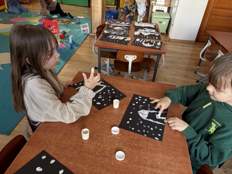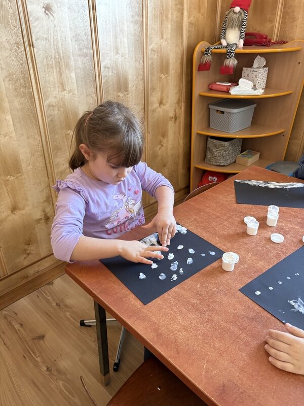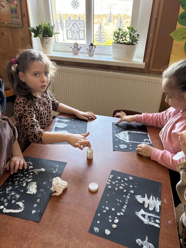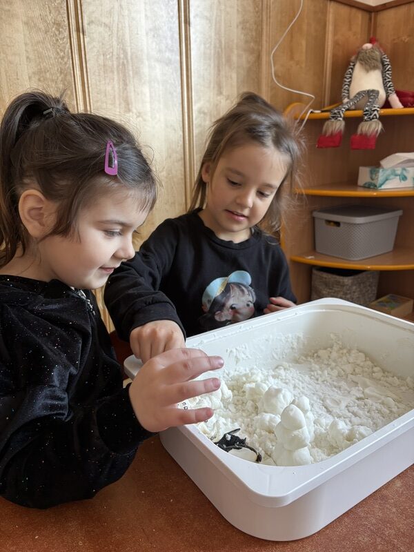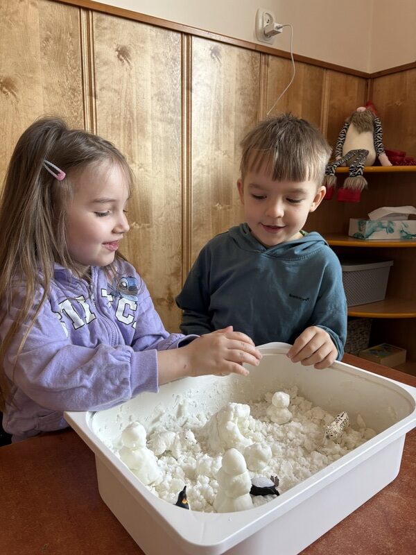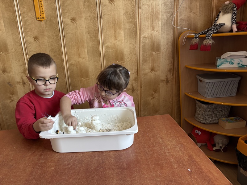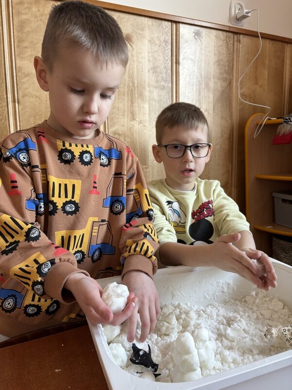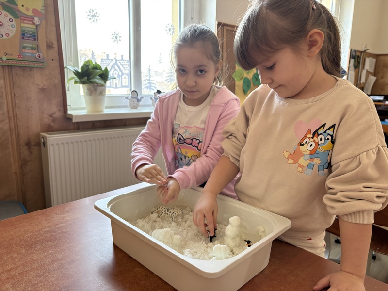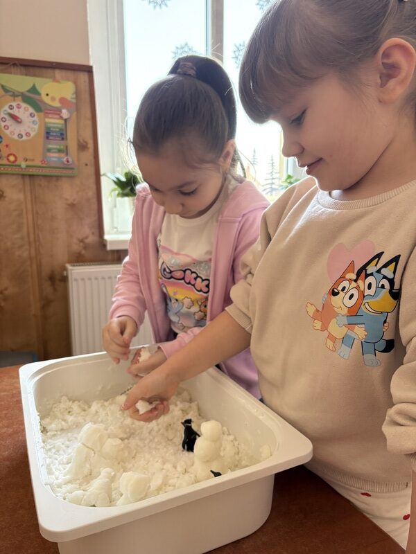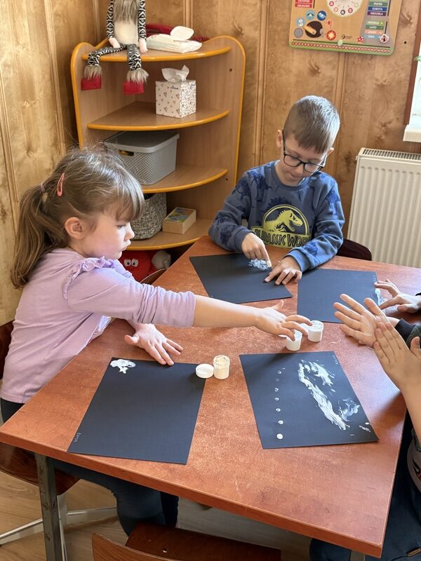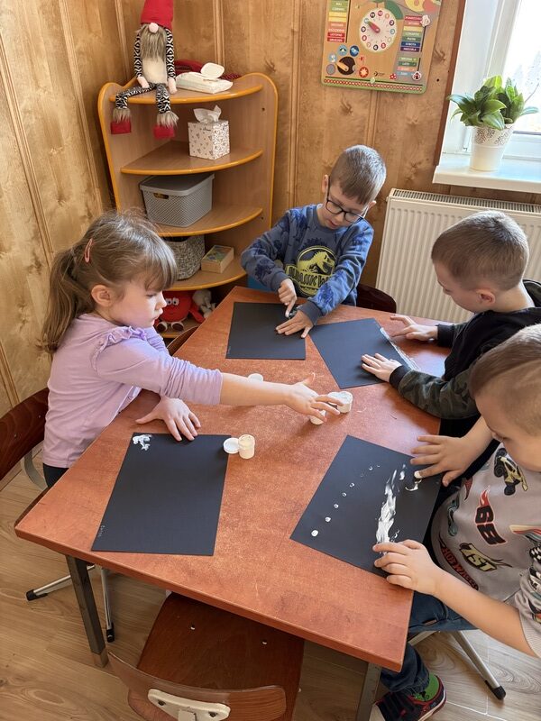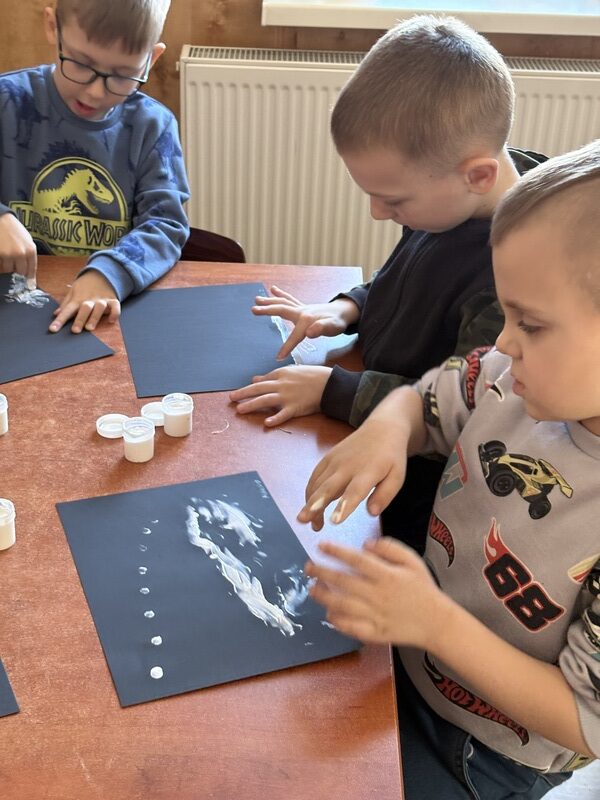 Zanurzyliśmy się w zimowy świat pełen faktur, kolorów i wrażeń. Dzieci malowały palcami zimowe pejzaże, odkrywając chłodne barwy i miękkie, śnieżne struktury farby. Dużo radości przyniosły także zabawy ze sztucznym śniegiem — lepienie, przesypywanie i eksperymentowanie z jego konsystencją pobudziło zmysły i wyobraźnię.