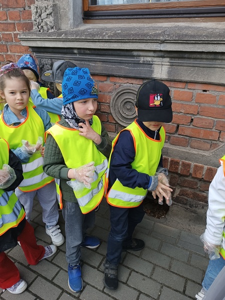 Dzieci, wyposażone w rękawiczki i worki na śmieci, z wielkim zaangażowaniem pomagały w porządkowaniu terenów wokół przedszkola. Z entuzjazmem zbierały odpady, ucząc się przy tym, jak ważne jest dbanie o czystość naszego otoczenia i segregacja śmieci.