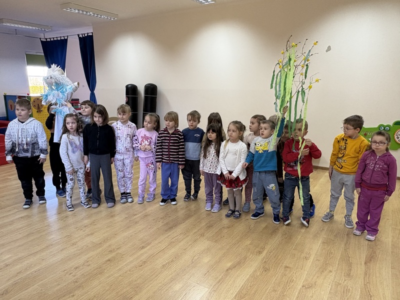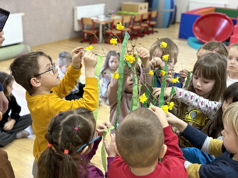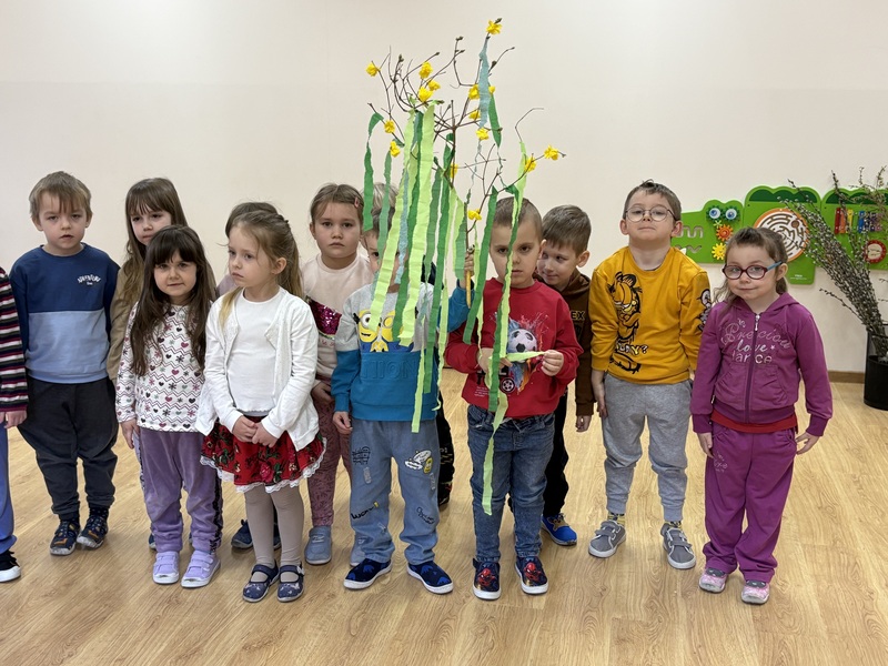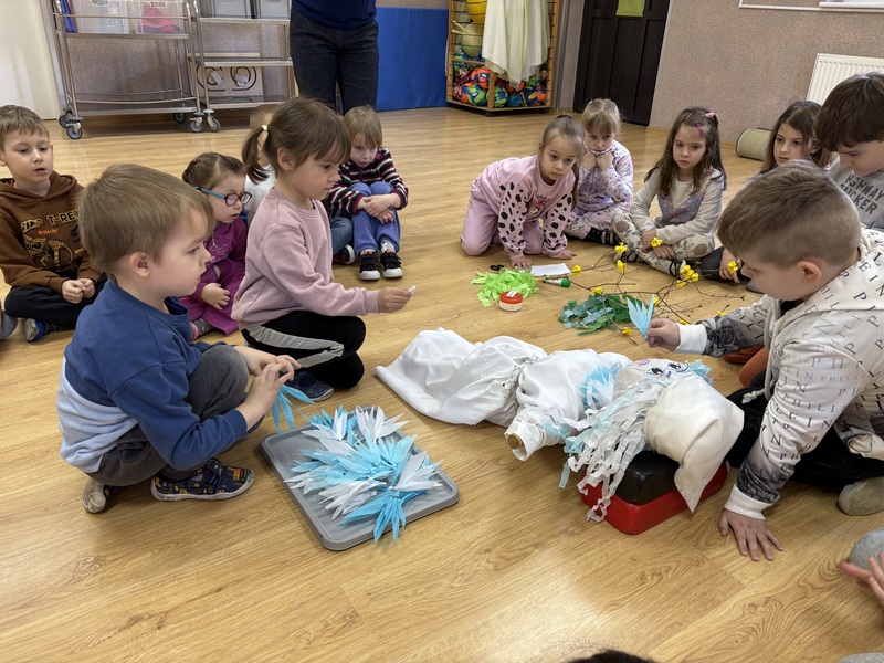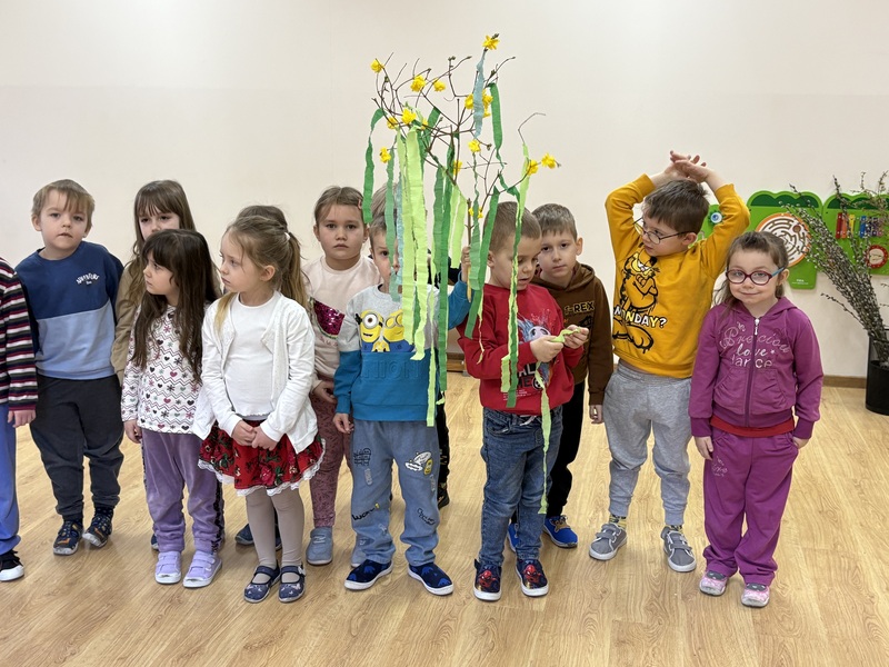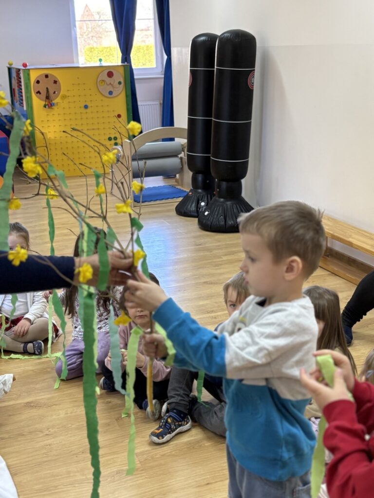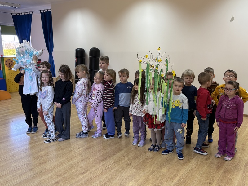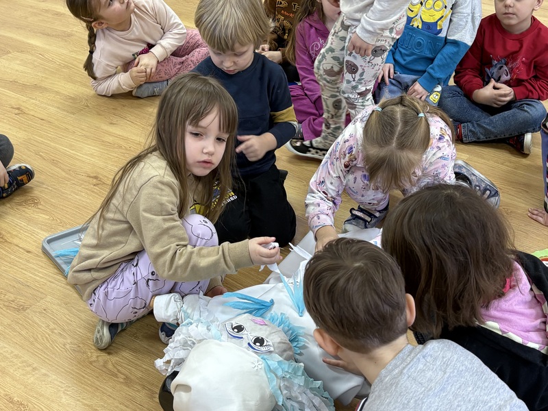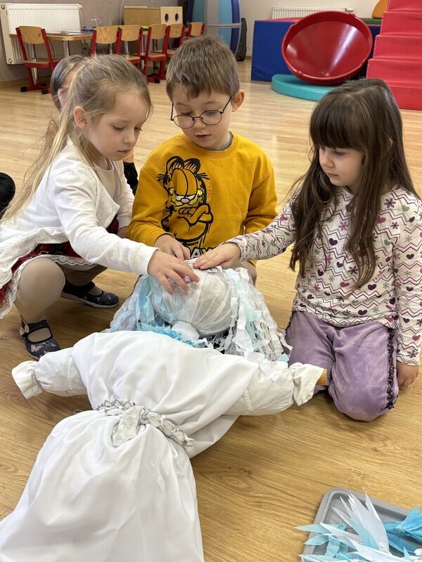 Zajączki wraz z Żabkami z radością stroiły Marzannę. Dzieci wspólnie ozdabiały ją pięknymi kawałkami krepy, przygotowując do symbolicznego pożegnania zimy.