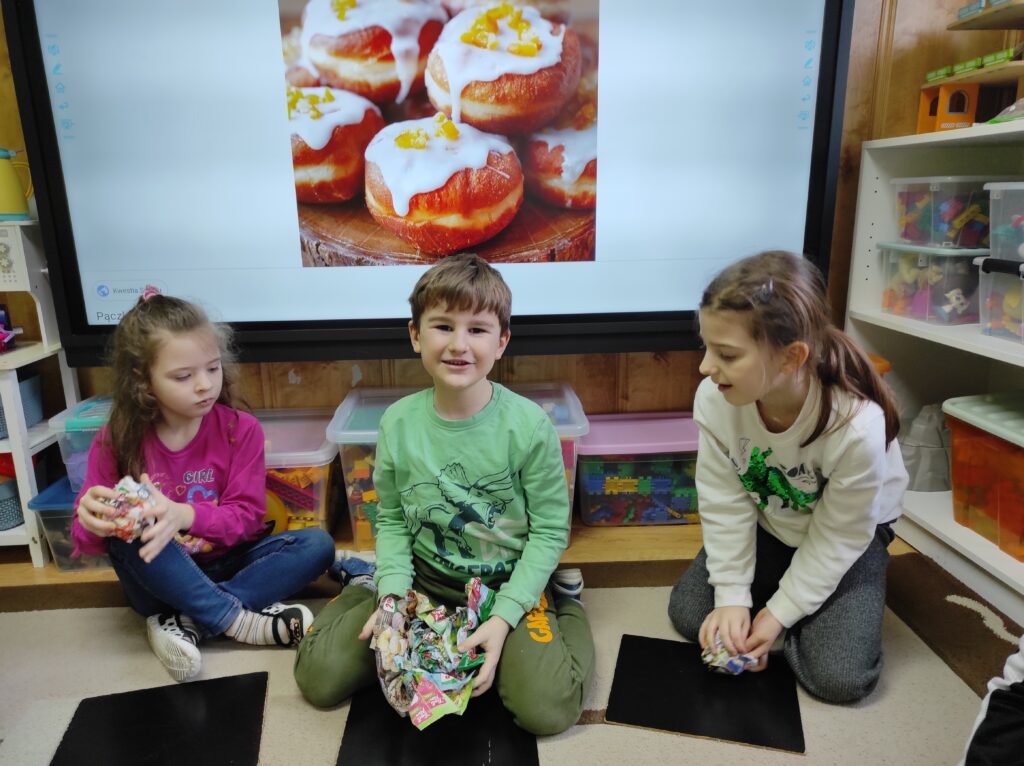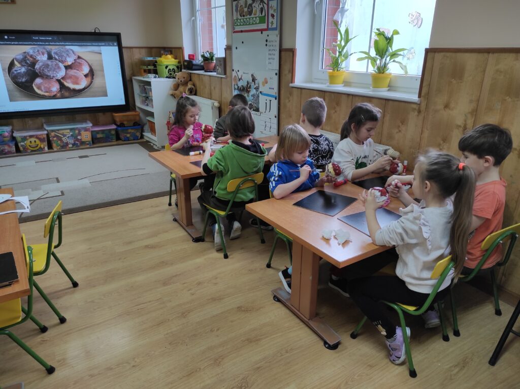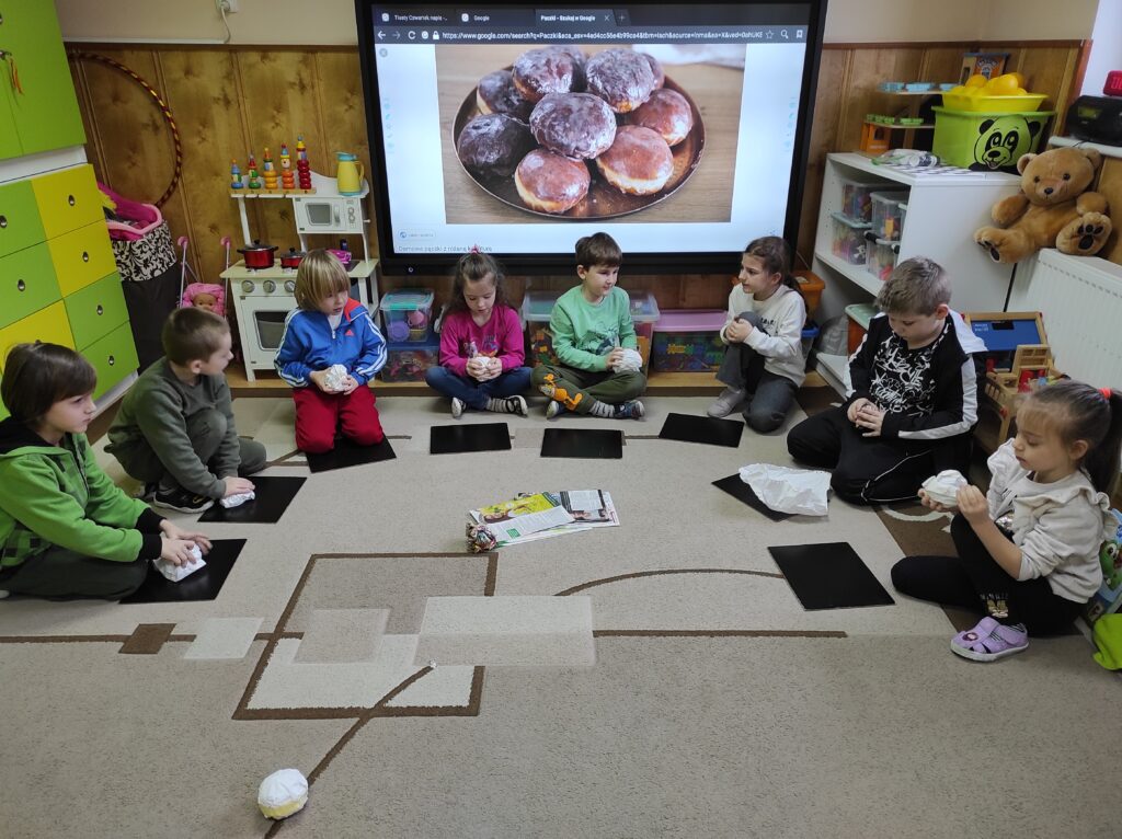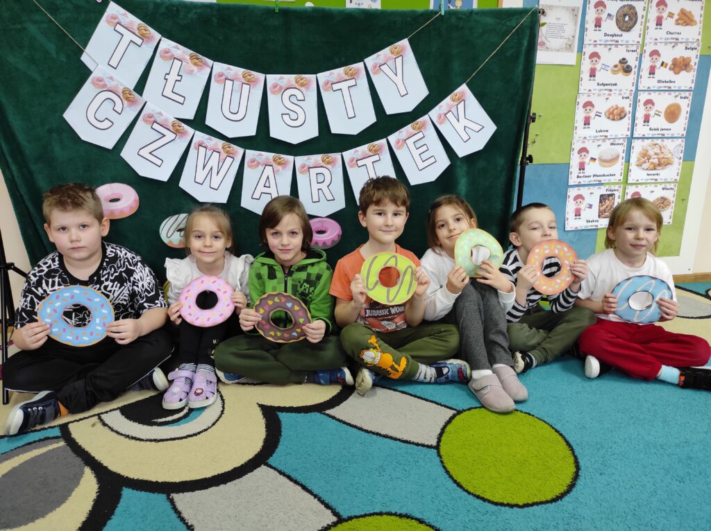 Tłusty Czwartek to dzień, w którym dzieci poznały tradycje i obrzędy związane z tym świętem, poznały składniki pączkowego czy faworkowego ciasta. Odbyła się zabawa plastyczna – PĄCZKI.