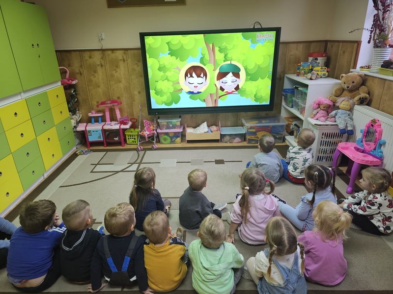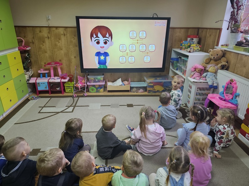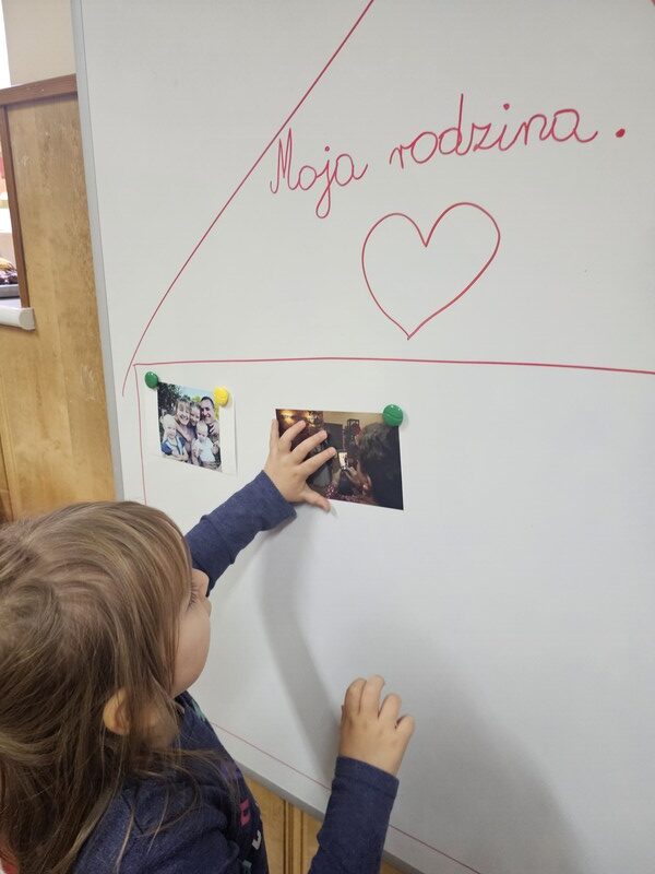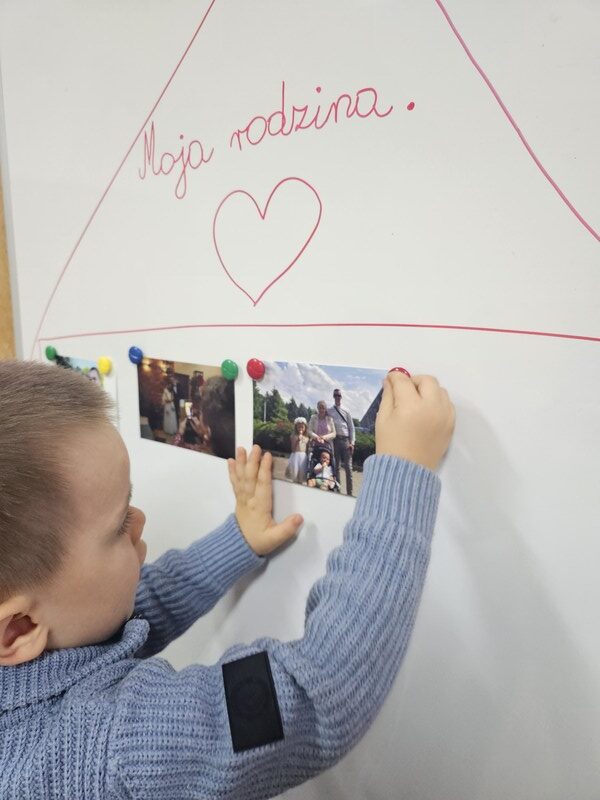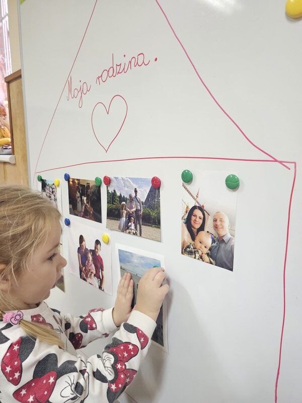Podczas zajęć uczyliśmy się imion rodziców, a także poznawaliśmy, kim są: babcia, dziadek, ciocia, wujek, brat czy siostra. Dzięki różnym zabawom i rozmowom „Żabki” utrwalały słownictwo związane z rodziną oraz uczyły się, jak ważne są relacje z najbliższymi.