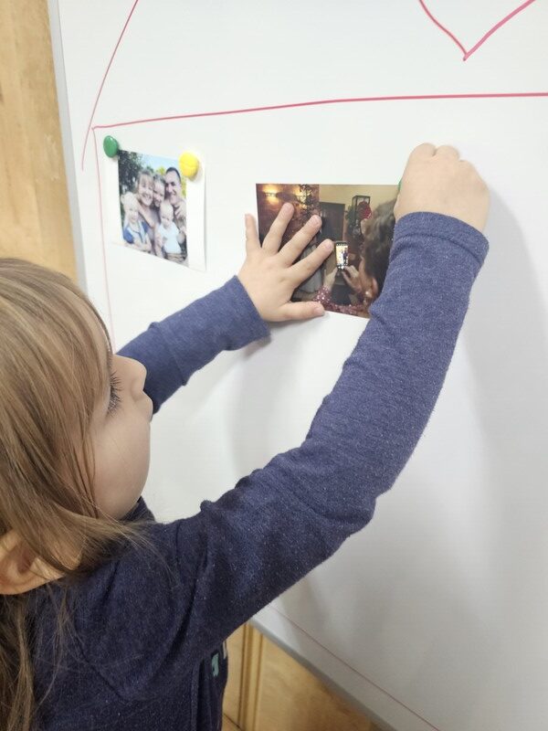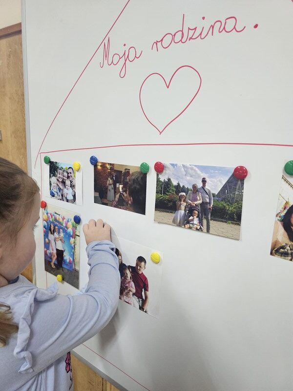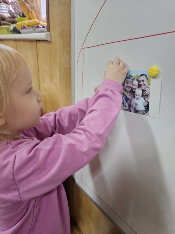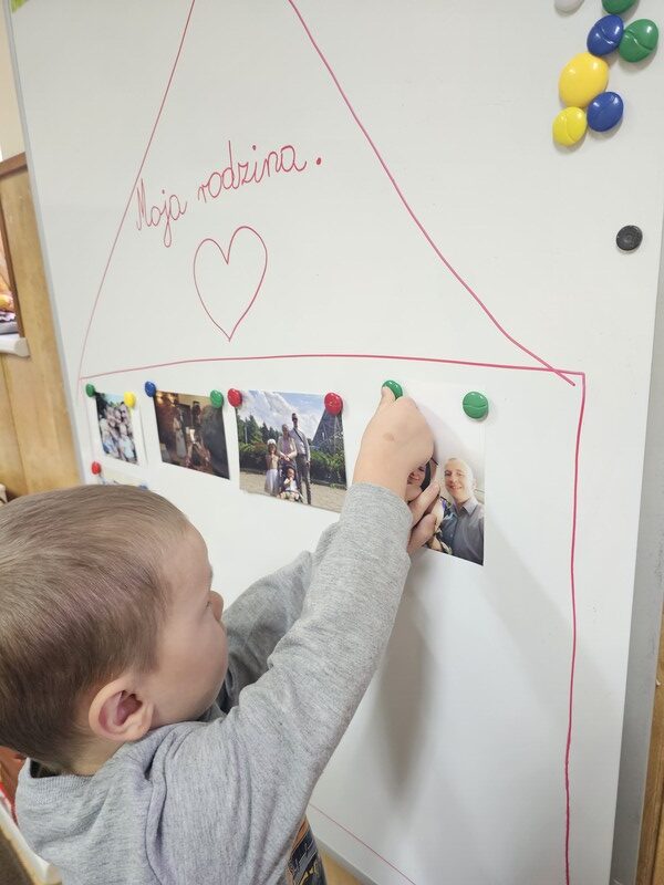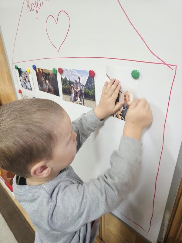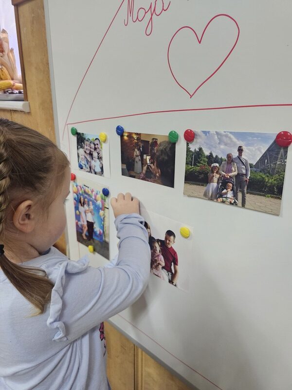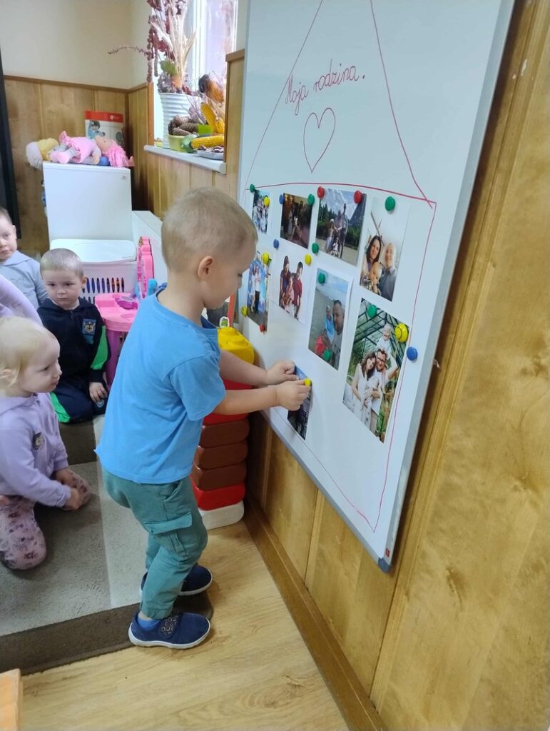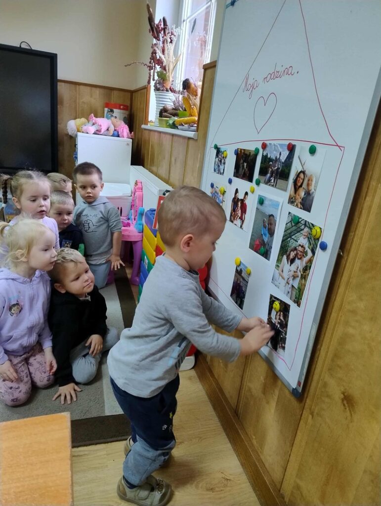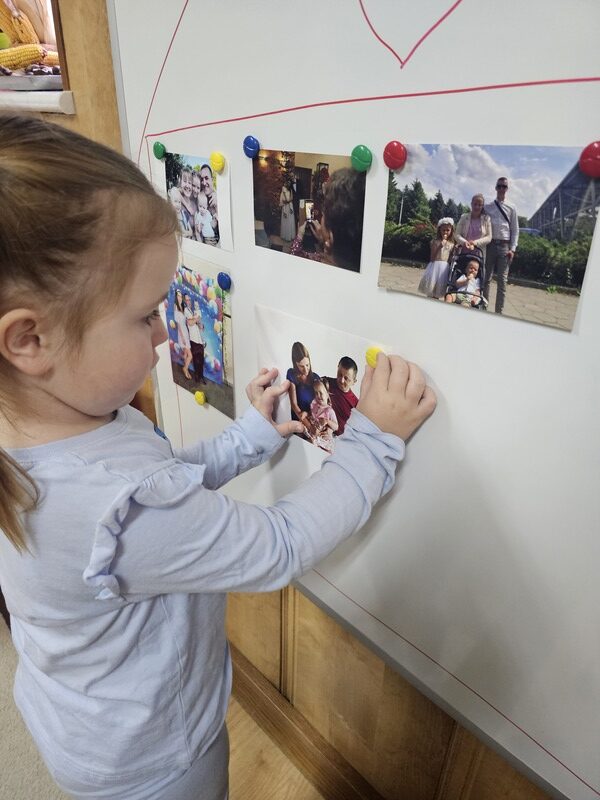 W minionym tygodniu w grupie „Żabki” rozmawialiśmy o najbliższych – o rodzinie. Dzieci przyniosły do przedszkola zdjęcia swoich rodzin, z których wspólnie stworzyliśmy piękne, kolorowe miejsce na tablicy. Każde dziecko z dumą prezentowało swoją fotografię i opowiadało o swoich bliskich.
