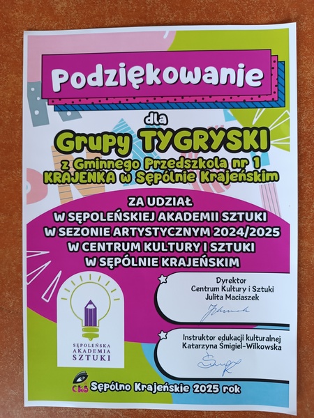 Przez cały rok dzieci z grupy Tygryski odkrywały tajemnice sztuki, uczestnicząc w zajęciach Sępoleńskiej Akademii Sztuki organizowanych przez Centrum Kultury i Sztuki. Każde spotkanie było okazją do rozwijania kreatywności, eksperymentowania z technikami plastycznymi i zanurzenia się w świecie artystycznej ekspresji.