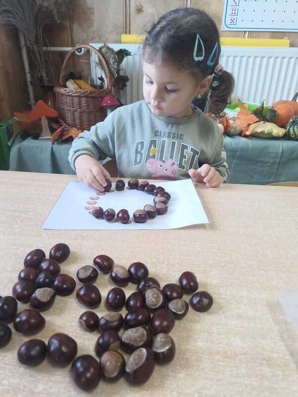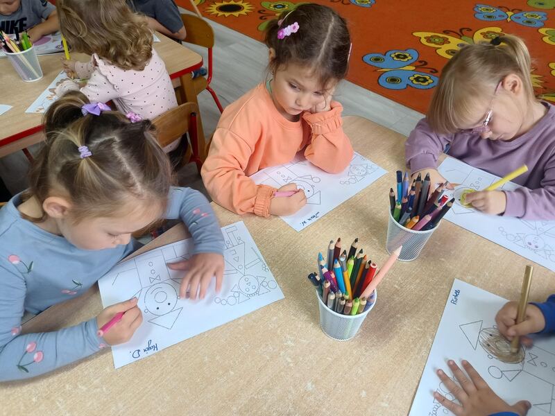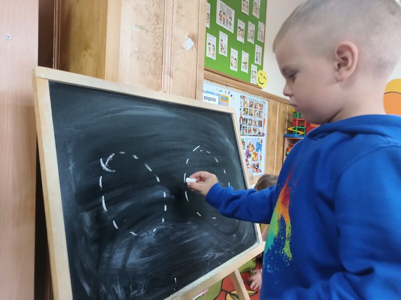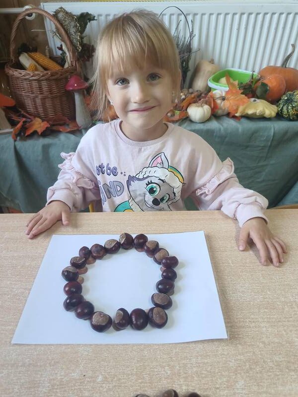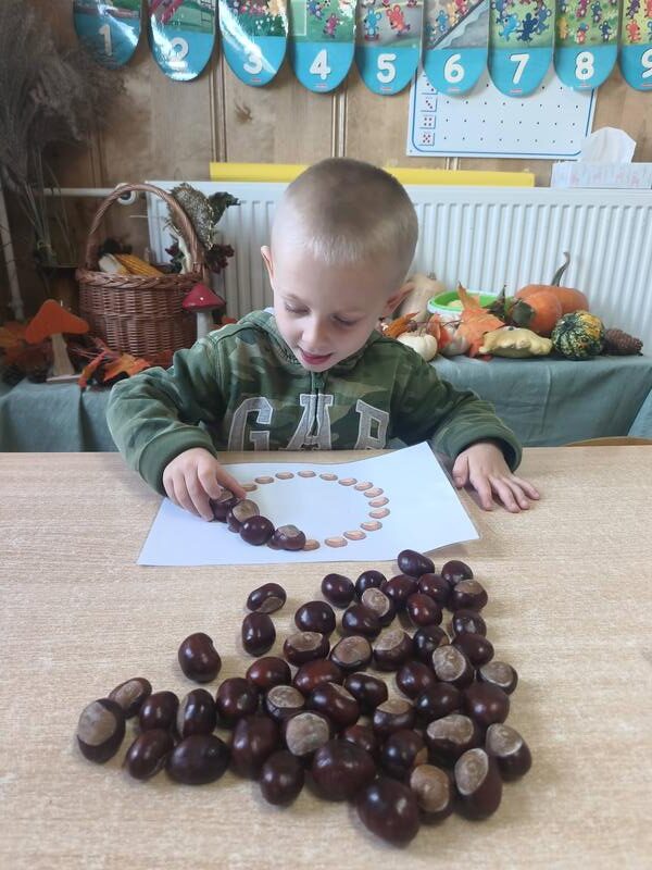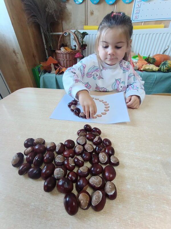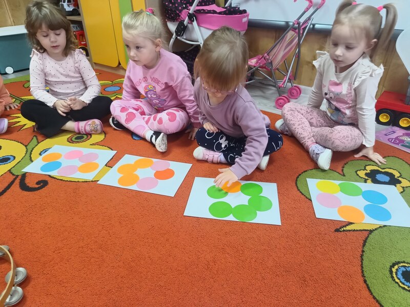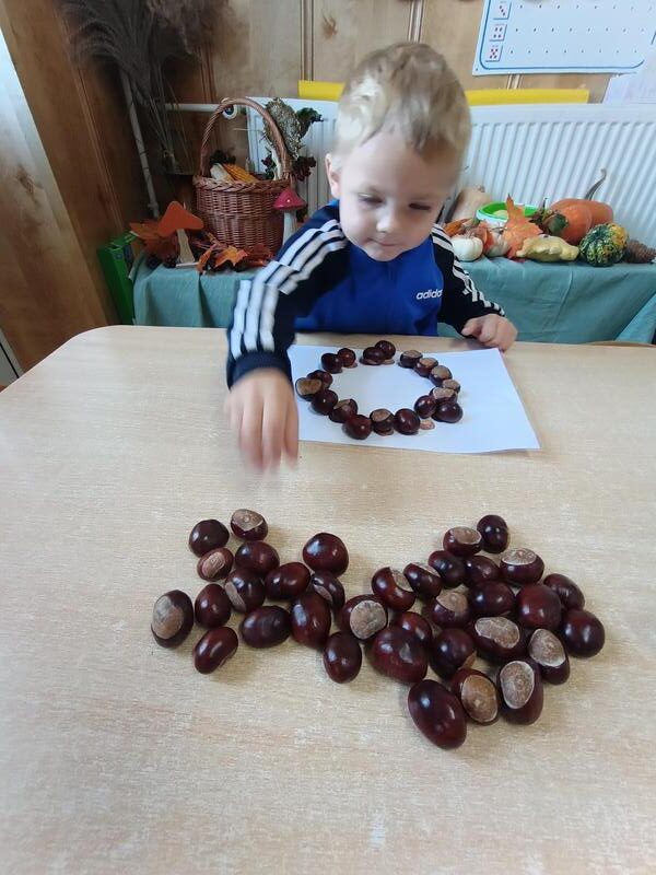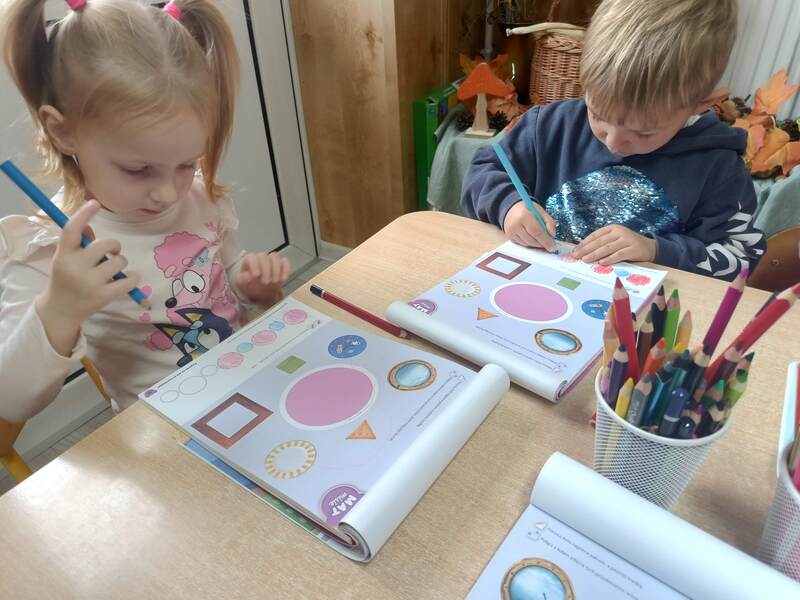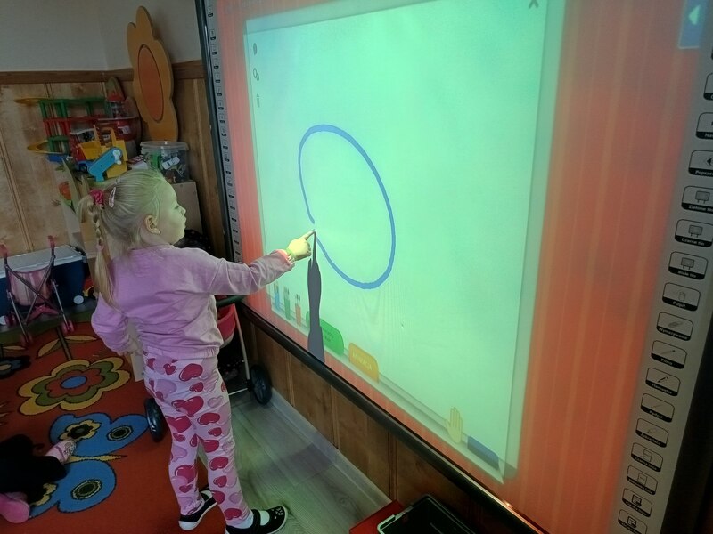 Elficzki z wielkim zaangażowaniem utrwalały wygląd figury geometrycznej – koła. Układały koła z kasztanów według przygotowanego wzoru, co nie tylko rozwijało ich spostrzegawczość, ale też motorykę małą. Rysowały koła na tablicy interaktywnej oraz kredą po tradycyjnej tablicy, ćwicząc precyzję ruchów. Samodzielnie przeliczały oczka na kostce i układały odpowiednią liczbę kół, ucząc się przy tym liczenia i logicznego myślenia. Z ogromną radością tworzyły kompozycje z kół, układając z nich kolorowe kwiatki.  Na zakończenie pracowały w książkach, wykonując zadania związane z rozpoznawaniem i rysowaniem kół. To był dzień pełen nauki przez zabawę!