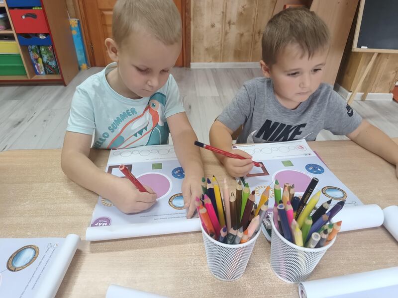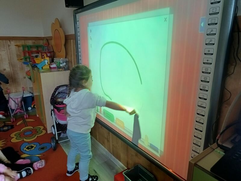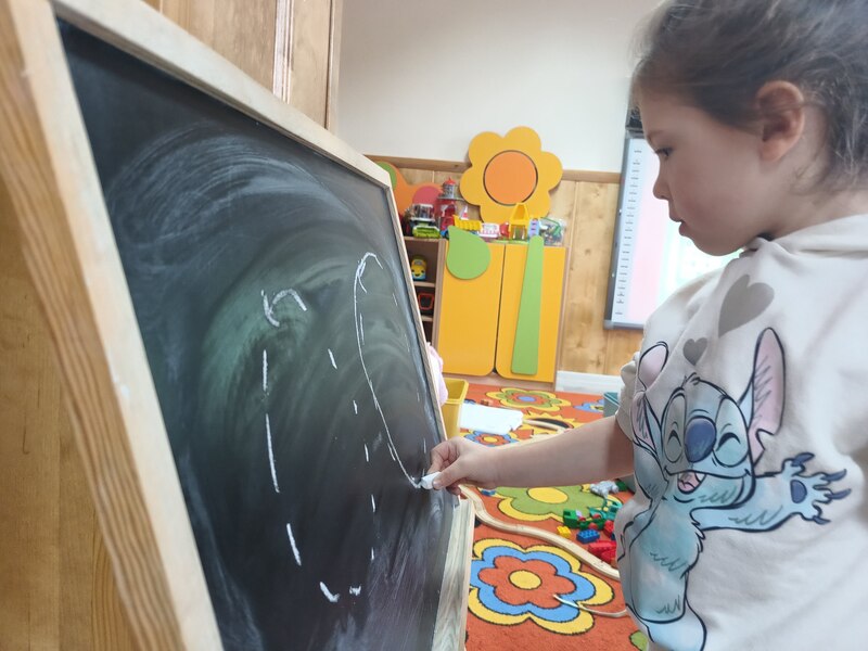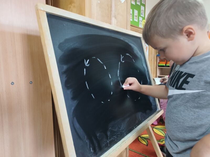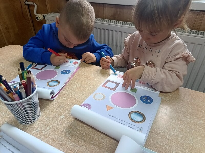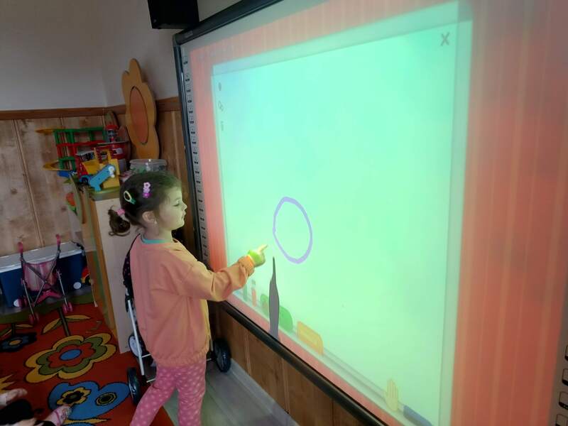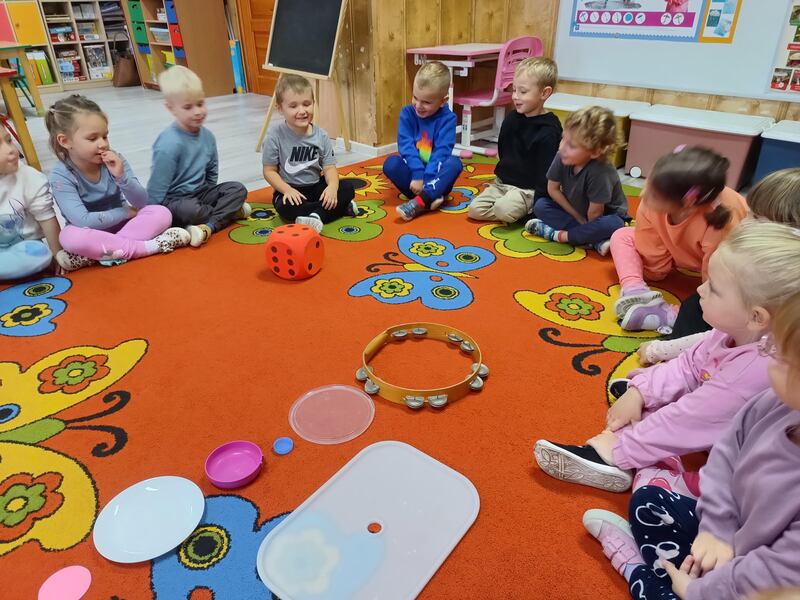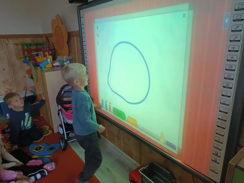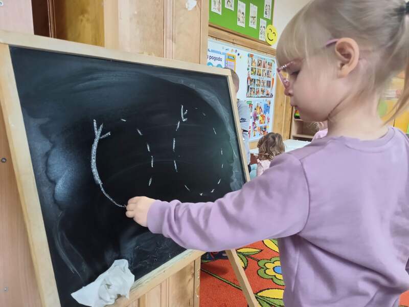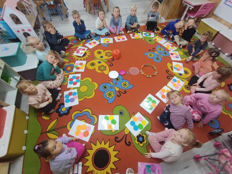 Elficzki z wielkim zaangażowaniem utrwalały wygląd figury geometrycznej – koła. Układały koła z kasztanów według przygotowanego wzoru, co nie tylko rozwijało ich spostrzegawczość, ale też motorykę małą. Rysowały koła na tablicy interaktywnej oraz kredą po tradycyjnej tablicy, ćwicząc precyzję ruchów. Samodzielnie przeliczały oczka na kostce i układały odpowiednią liczbę kół, ucząc się przy tym liczenia i logicznego myślenia. Z ogromną radością tworzyły kompozycje z kół, układając z nich kolorowe kwiatki.  Na zakończenie pracowały w książkach, wykonując zadania związane z rozpoznawaniem i rysowaniem kół. To był dzień pełen nauki przez zabawę!
