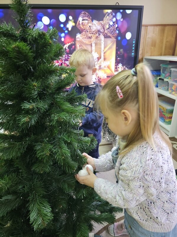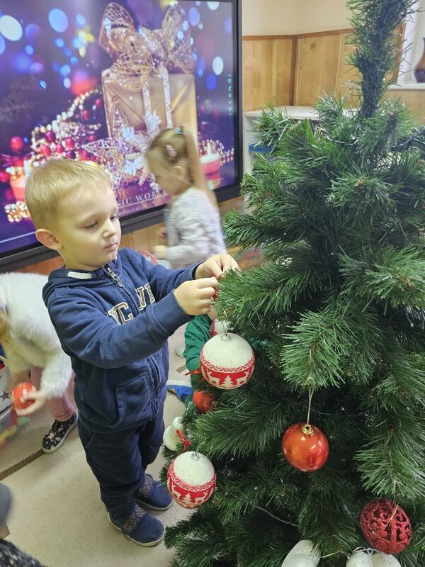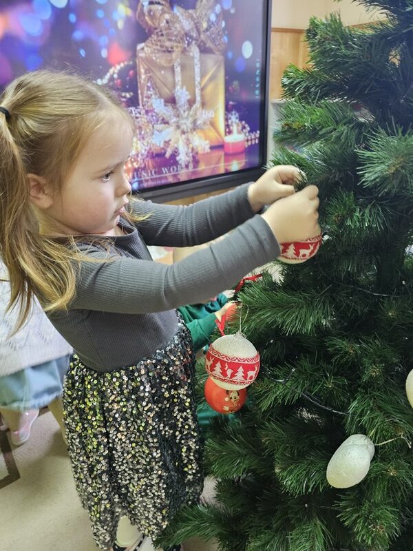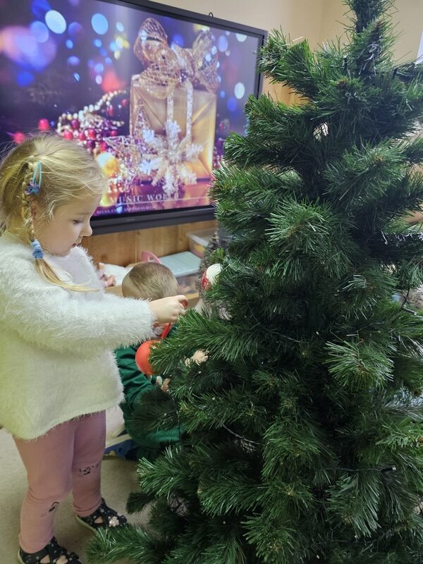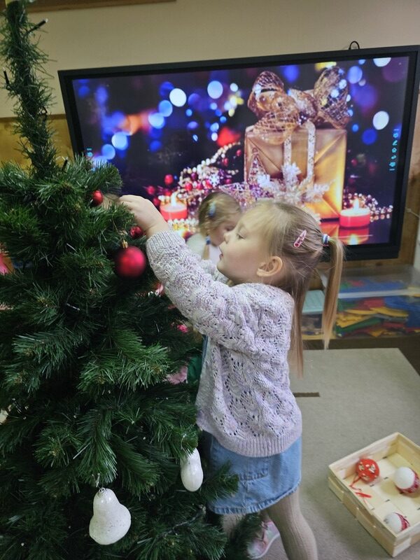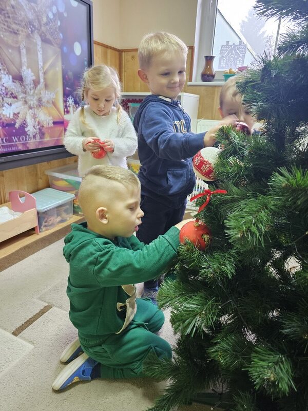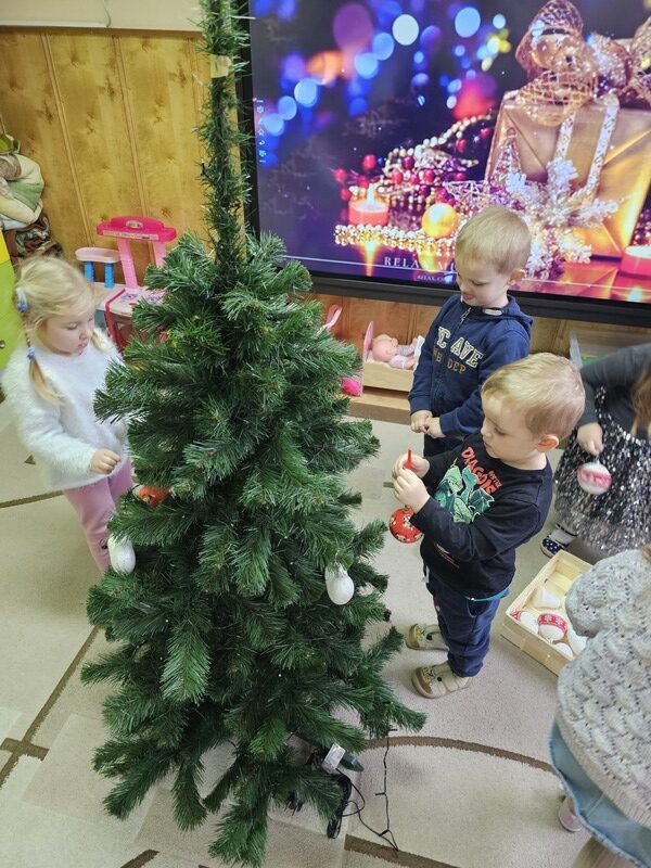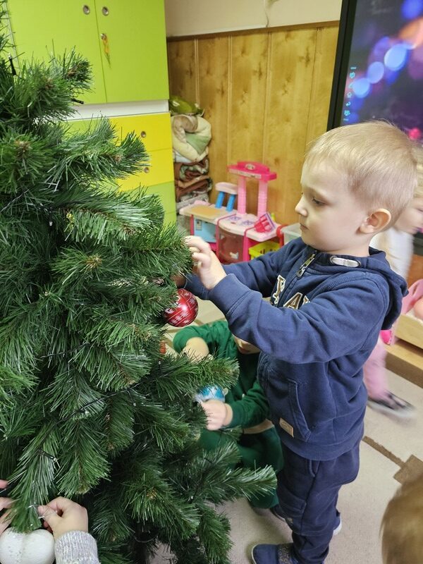 Wspólnie przystroiliśmy naszą grupową choinkę – nie zabrakło kolorowych bombek, łańcuchów i światełek. Każde dziecko mogło zawiesić swoją ozdobę, co sprawiło wszystkim wiele radości.