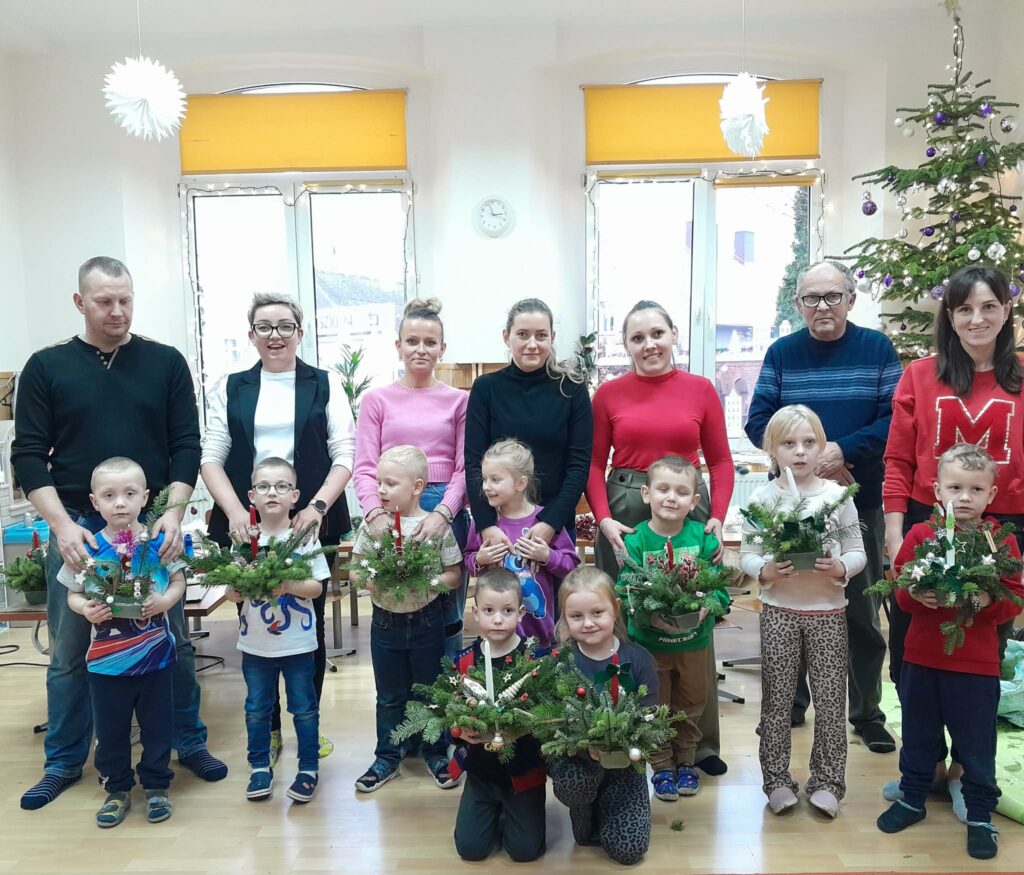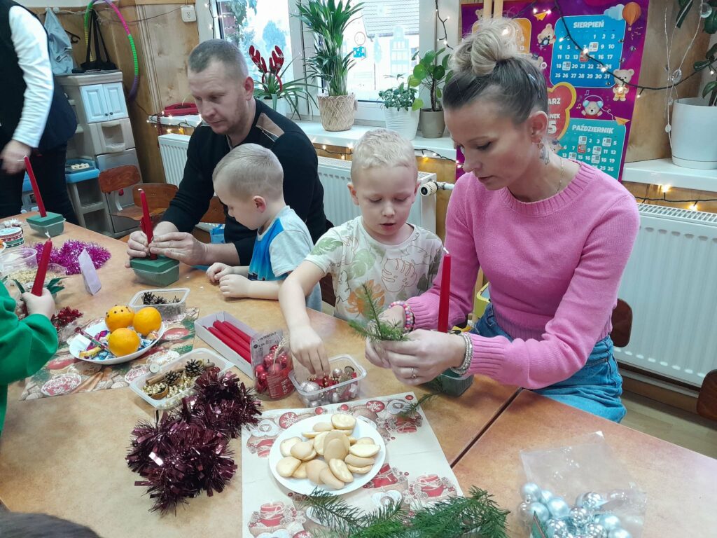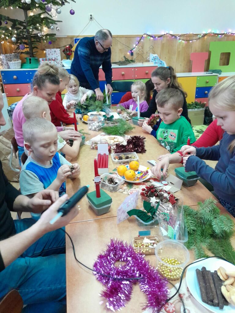 Praca przebiegała w miłej i radosnej atmosferze. Uczniowie razem z rodzicami wykazali się dużą kreatywnością i zaangażowaniem. Powstały piękne, kolorowe stroiki, które wprowadziły wszystkich w świąteczny nastrój.