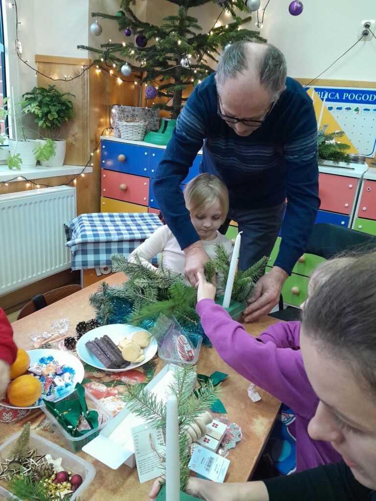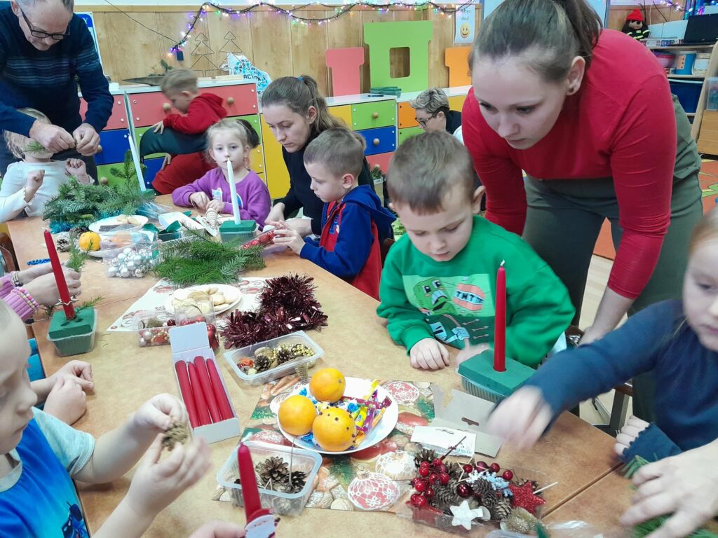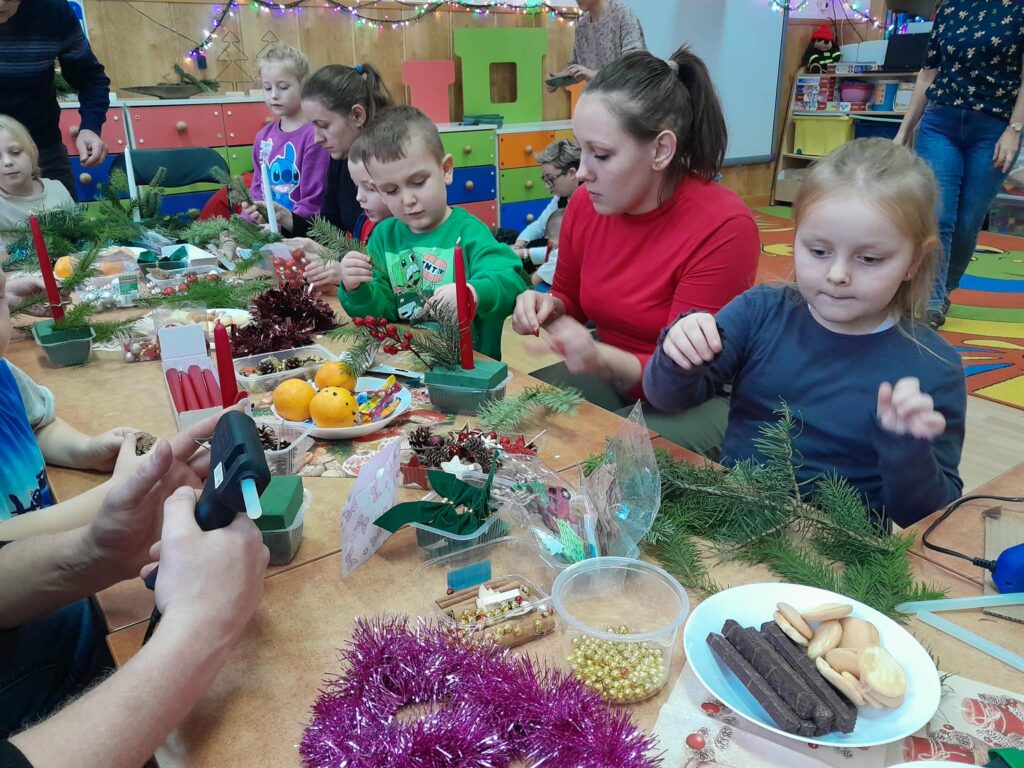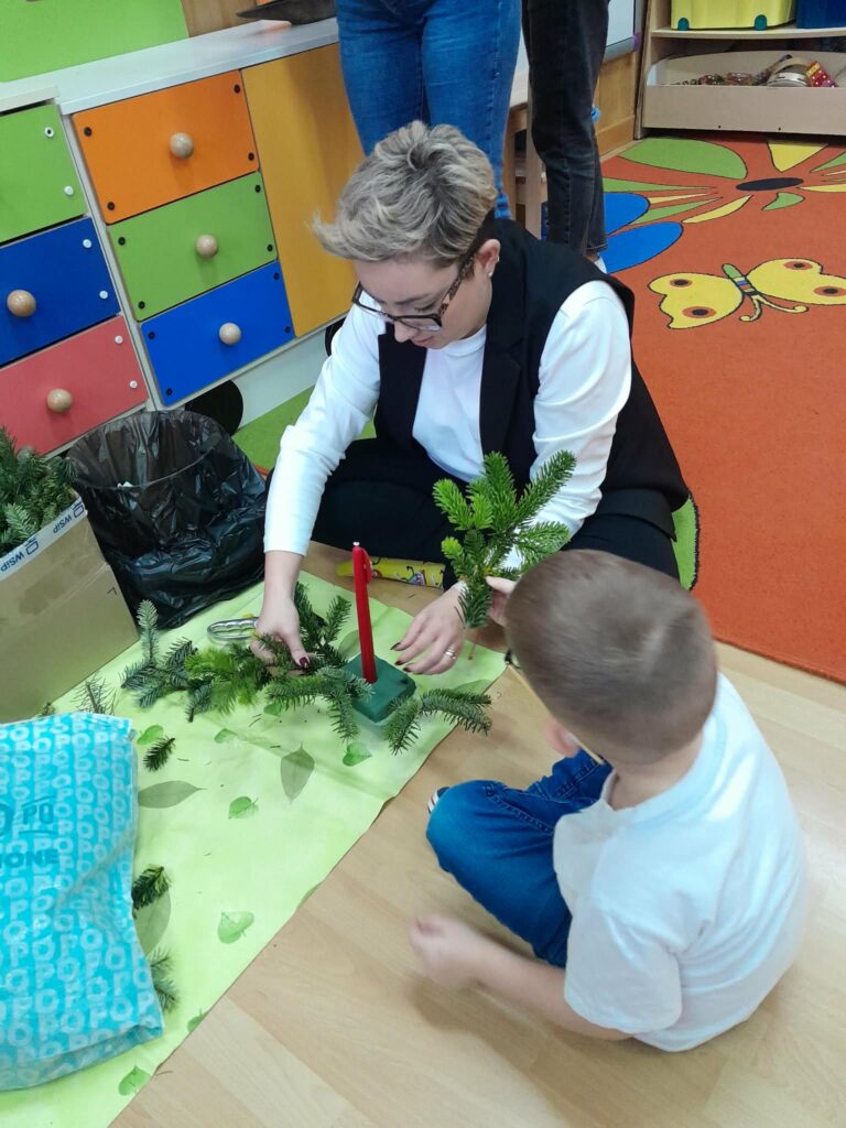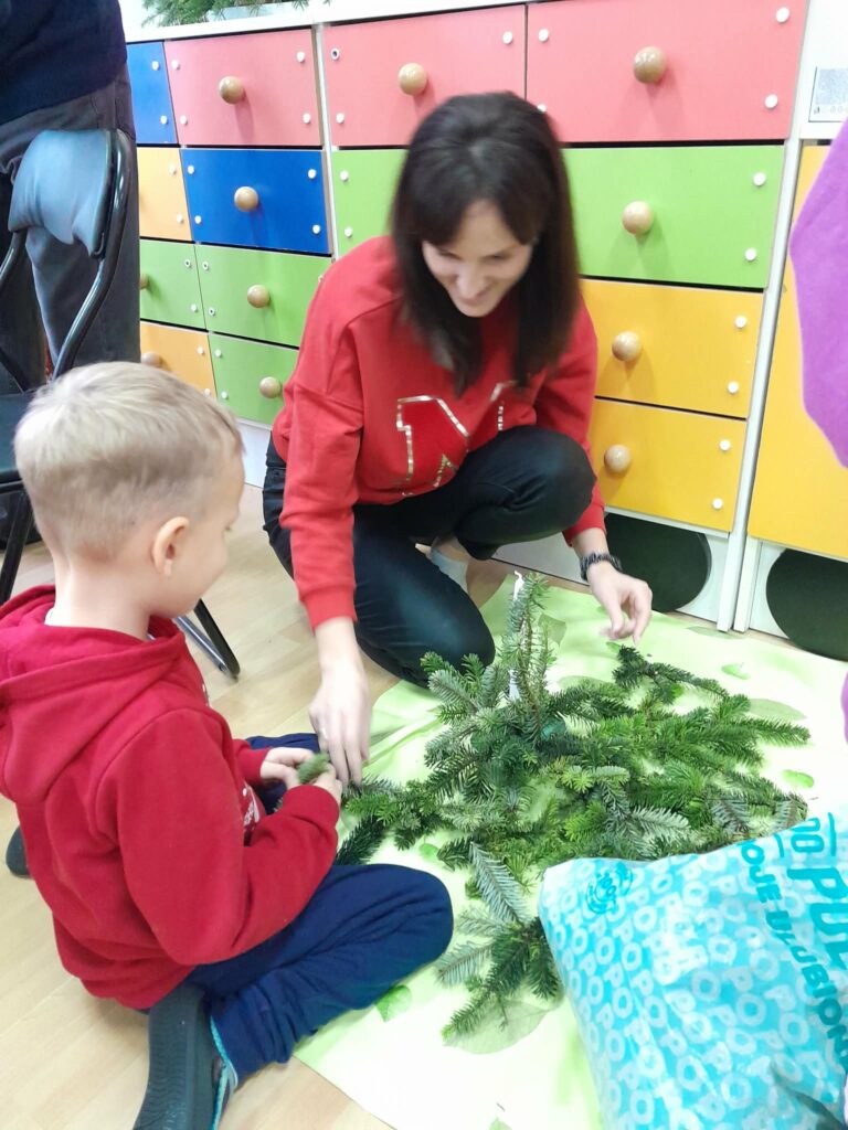 W naszej grupie odbyły się warsztaty świąteczne z udziałem rodziców. Podczas spotkania wspólnie wykonywaliśmy stroiki świąteczne. Do ich przygotowania wykorzystaliśmy m.in. gałązki choinki, szyszki, bombki, wstążki oraz inne ozdoby.
