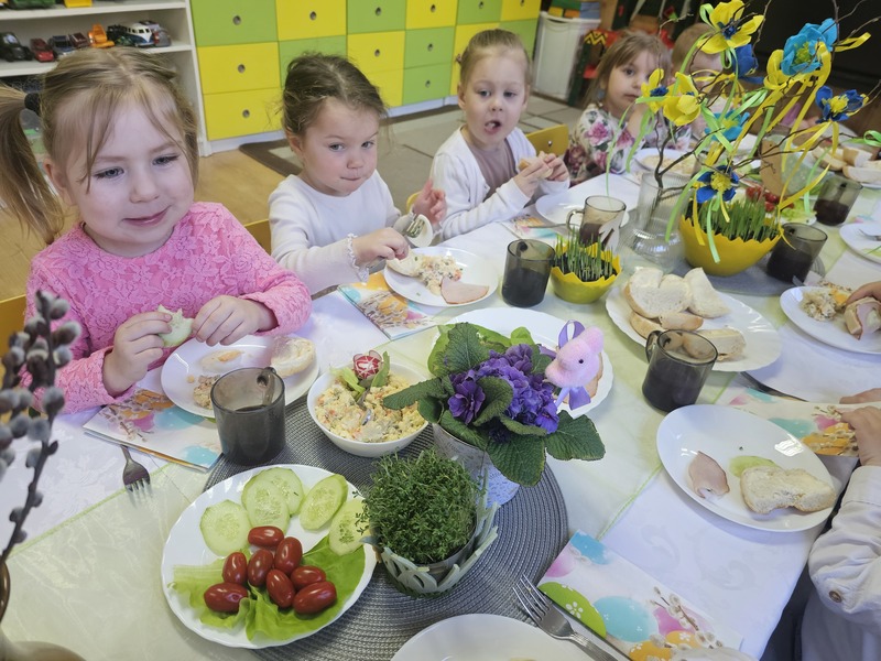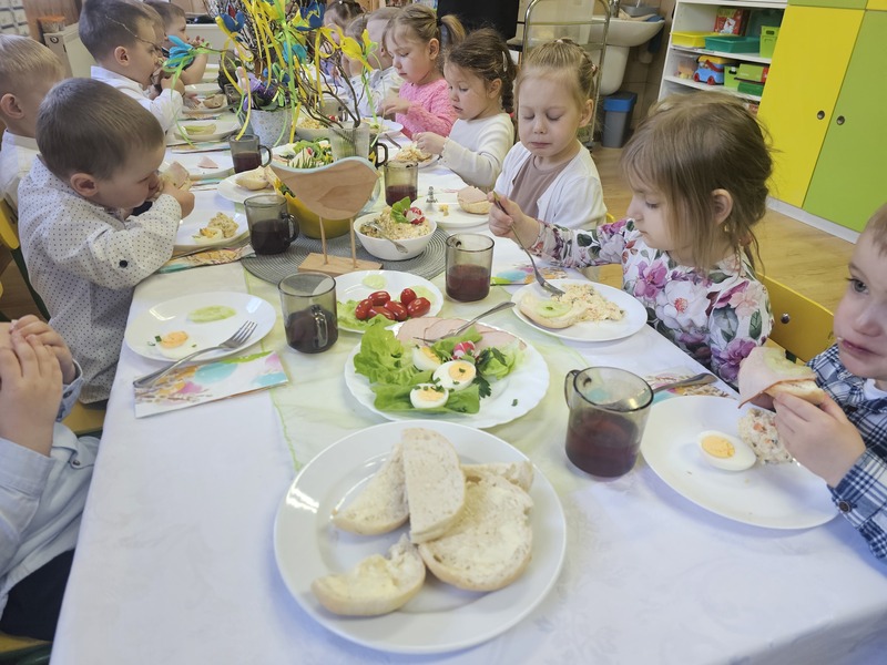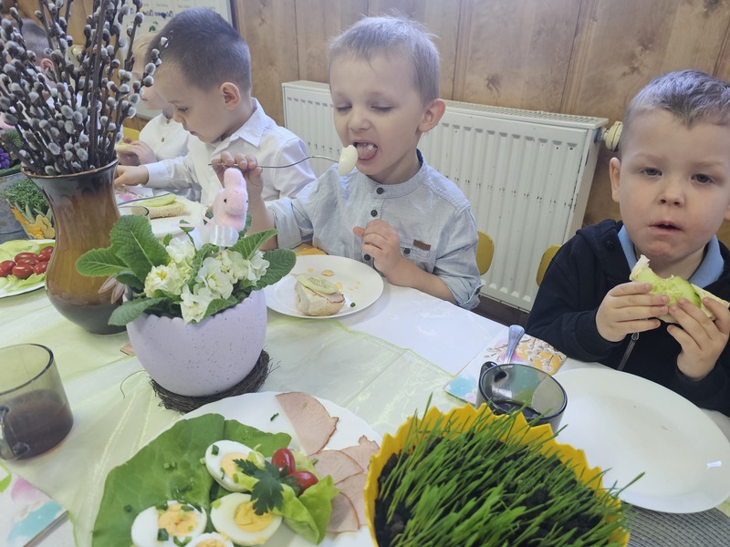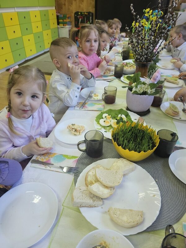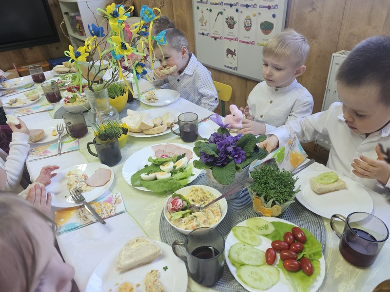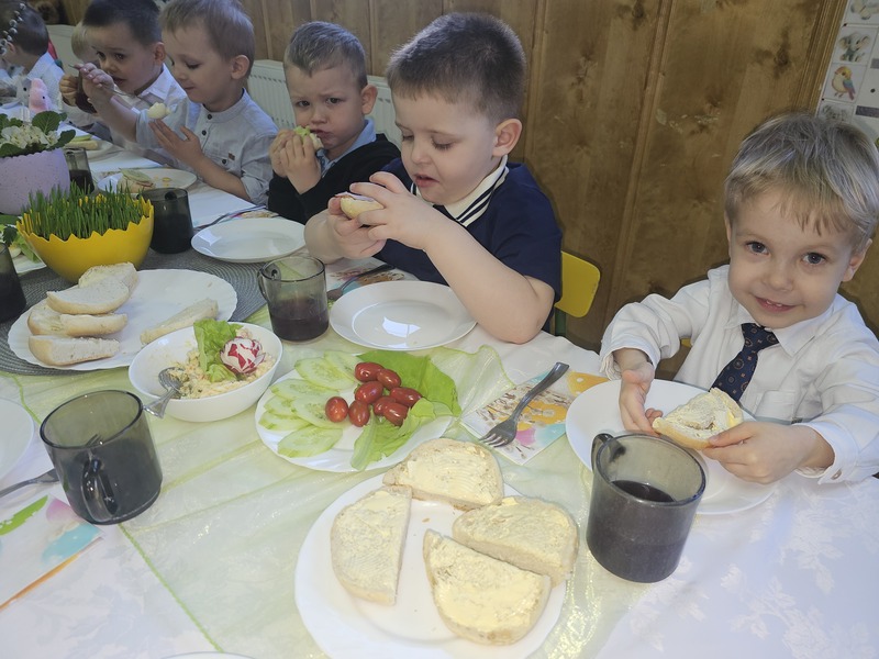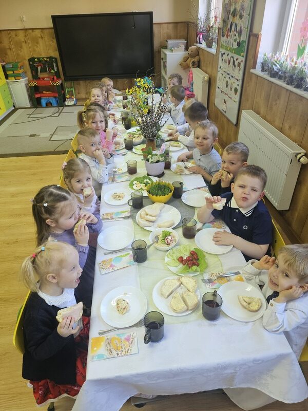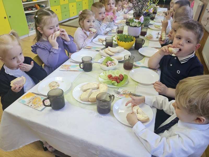 W grupie Żabki odbyło się uroczyste śniadanie z okazji Święta Wielkanocne. Dzieci wspólnie zasiadły do pięknie udekorowanego stołu, na którym nie zabrakło tradycyjnych potraw oraz świątecznych ozdób. Przedszkolaki składały sobie życzenia i rozmawiały o wielkanocnych zwyczajach. Spotkanie przebiegło w radosnej i ciepłej atmosferze, a wspólne śniadanie było doskonałą okazją do budowania więzi i poznawania tradycji.🐣🌿🥚