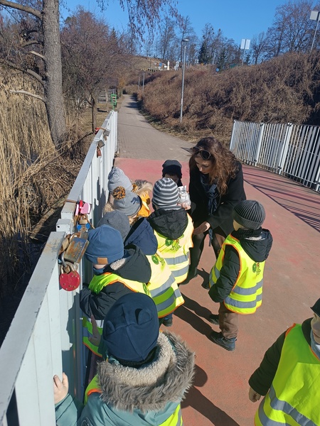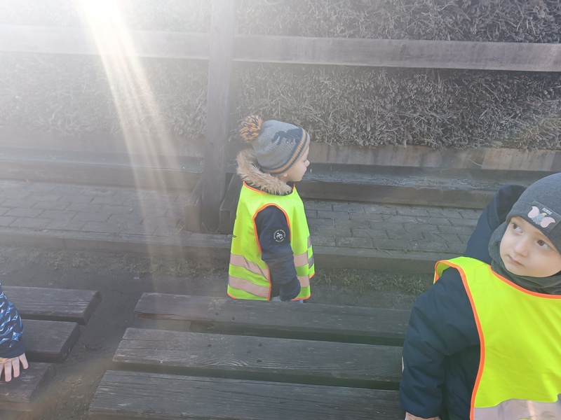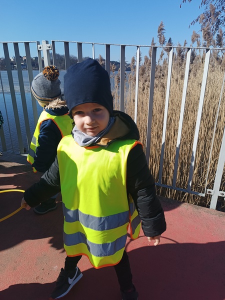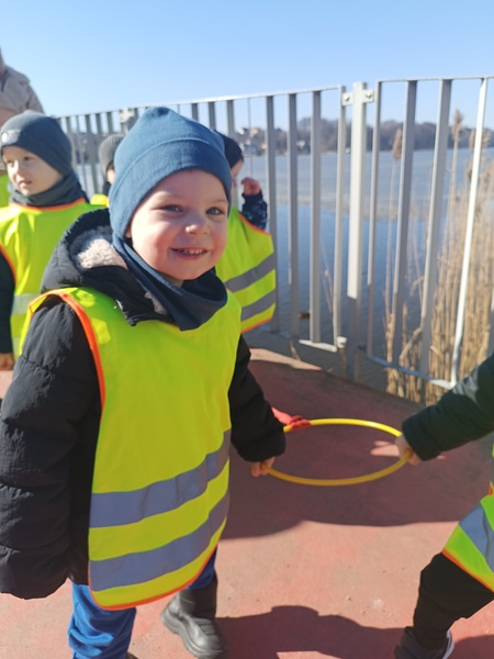 Marcowy spacer nad jezioro okazał się dla „Zajączków” prawdziwą przygodą pełną zachwytów. Dzieci od razu zauważyły, że wiosna zaczyna coraz śmielej zaglądać do naszego otoczenia — na gałązkach pojawiają się pąki, trawa staje się bardziej zielona, a ptaki głośniej witają każdy słoneczny dzień. Przedszkolaki z ogromną ciekawością obserwowały te zmiany, ciesząc się świeżym powietrzem i pięknymi widokami.