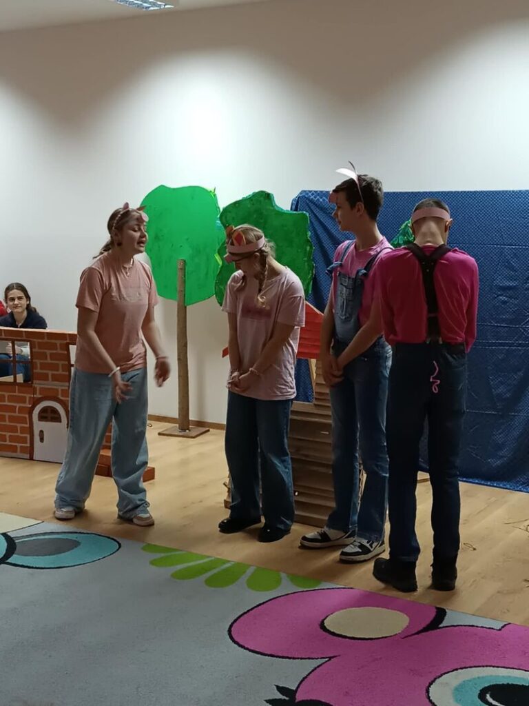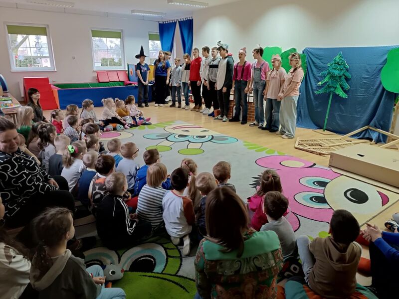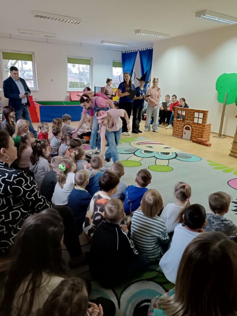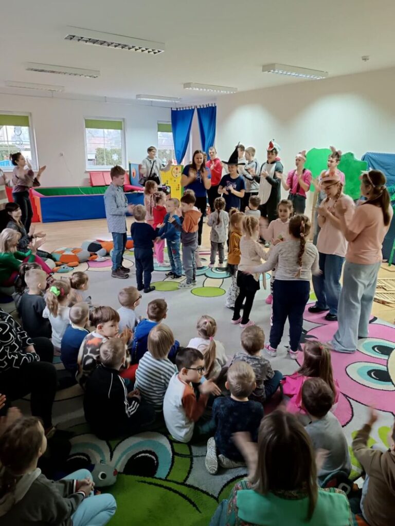 Dzieci z trzech najstarszych grup z zaciekawieniem śledziły losy bohaterów, a spektakl był pełen humoru, muzyki i pięknych kostiumów. Serdecznie dziękujemy za tę niesamowitą przygodę i czekamy na kolejne wspólne inicjatywy!