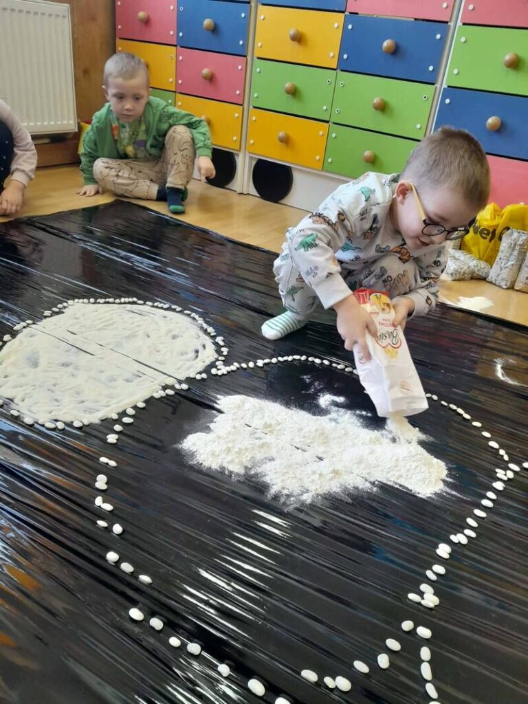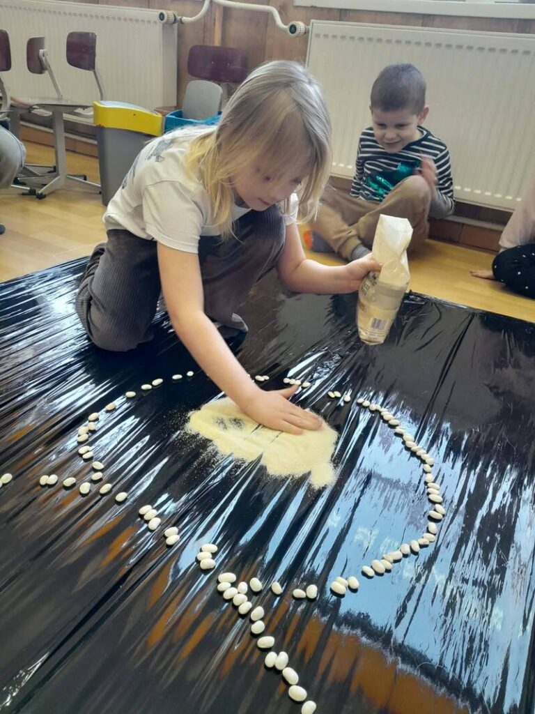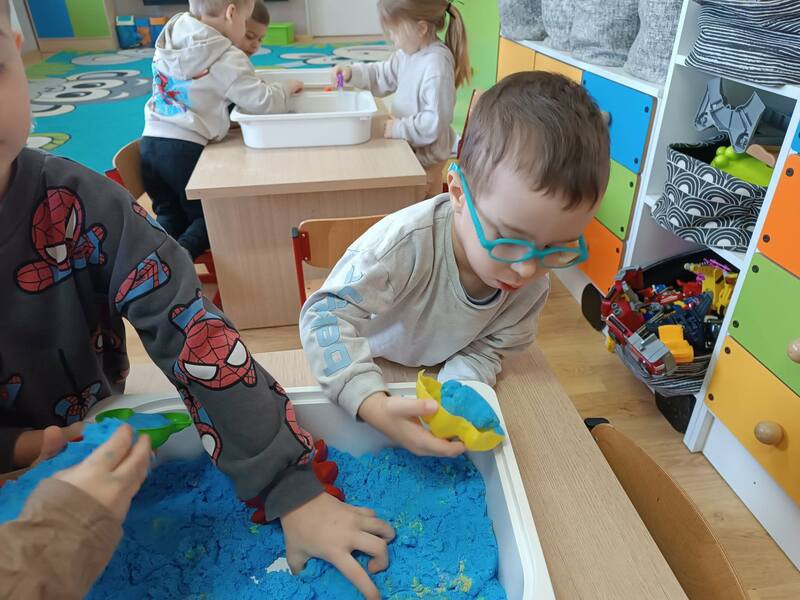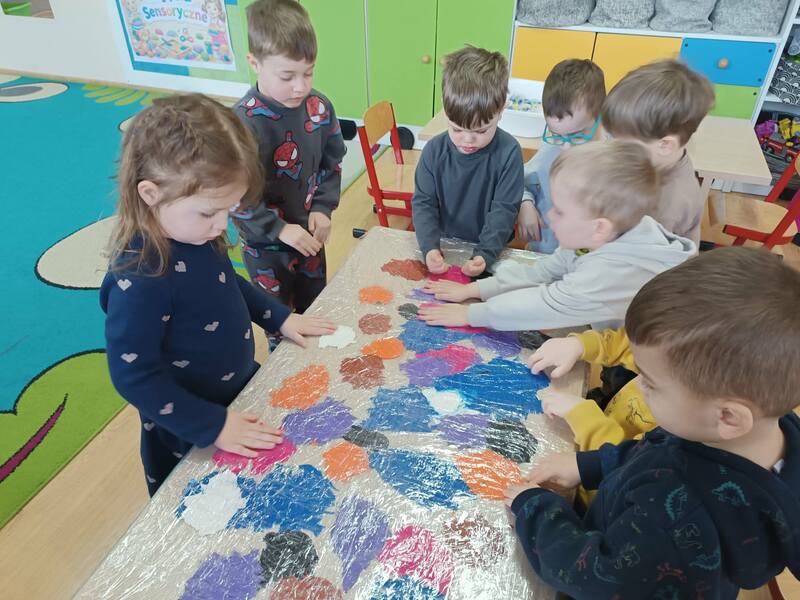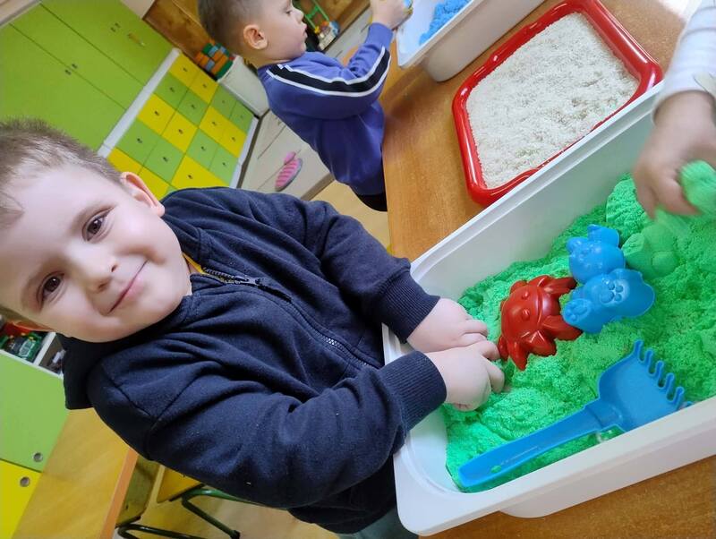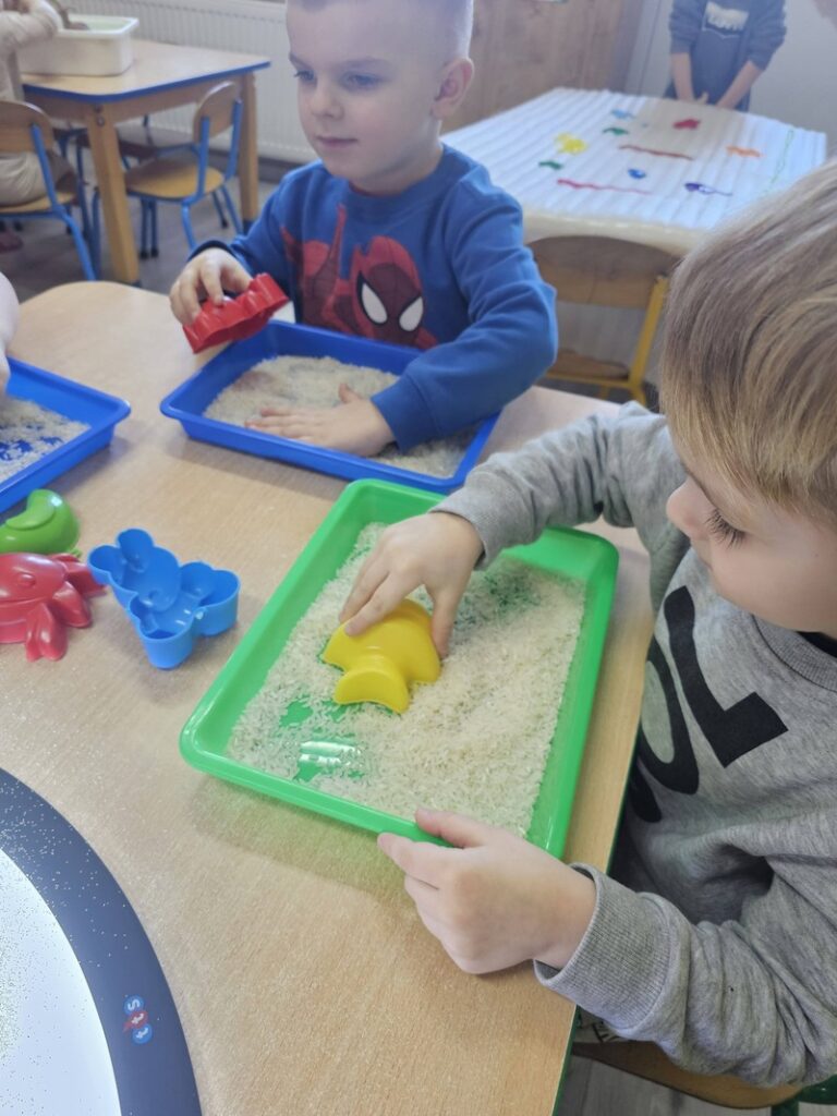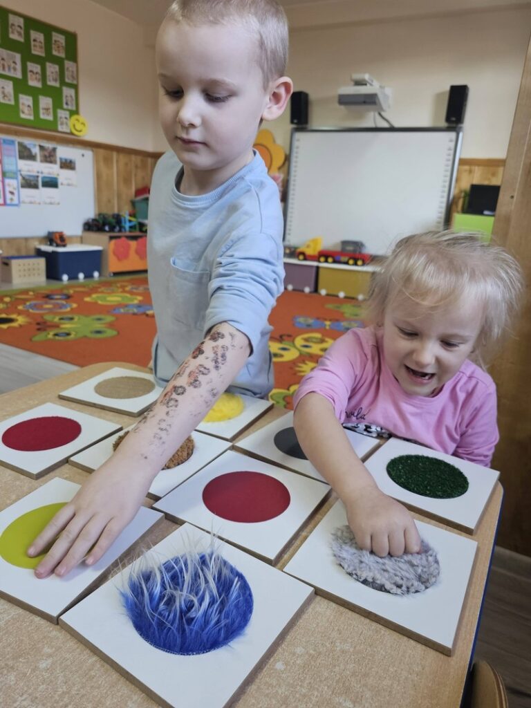 Podczas zajęć dzieci mają okazję doświadczać różnorodnych faktur, struktur i materiałów – od miękkich i sypkich, po mokre i elastyczne.