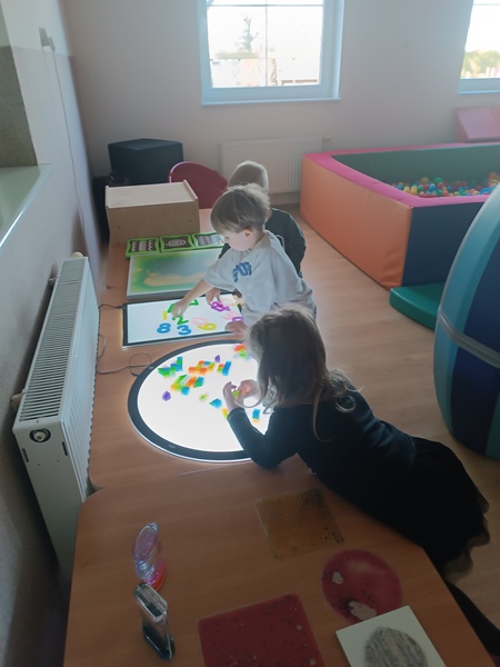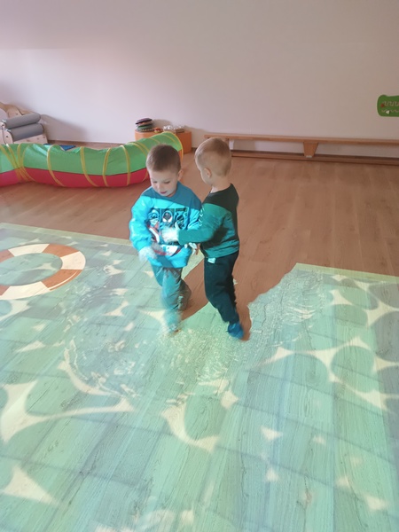Dużym zainteresowaniem cieszyła się również podłoga interaktywna, która reagowała na każdy krok — dzieci „chodziły po wodzie”, goniły świetlne elementy i obserwowały zmieniające się obrazy. Uzupełnieniem zabaw były podświetlane ekrany, zachęcające do dotyku, ruchu i odkrywania nowych efektów.