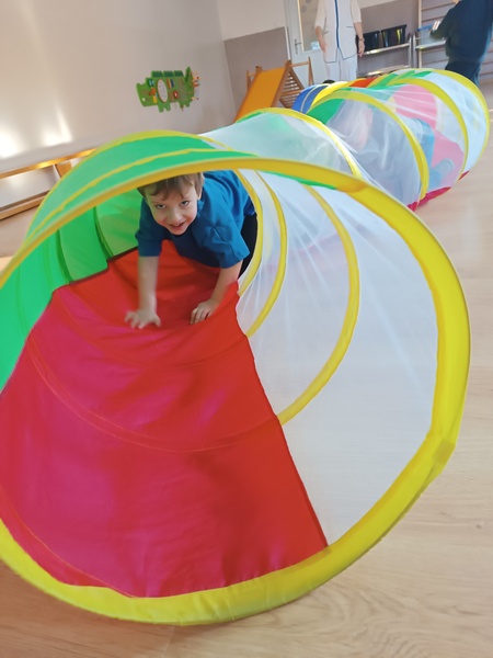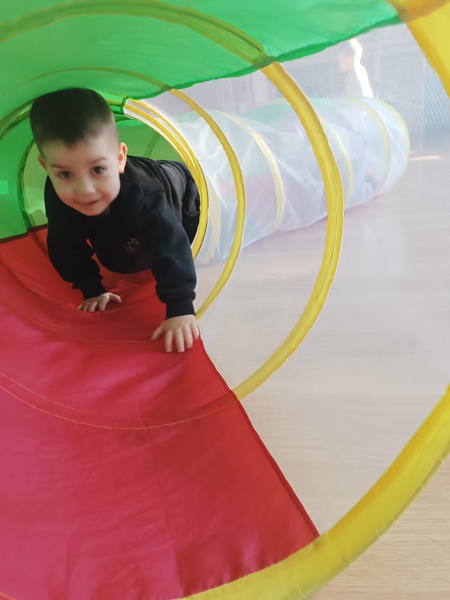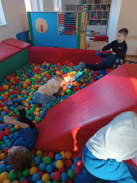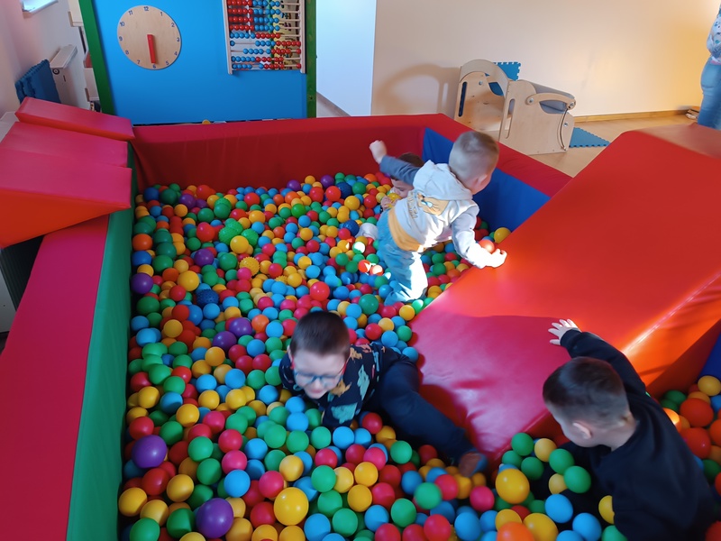 „Zajączki” spędziły niezwykle atrakcyjny czas w Sali Ruchu, która jak zawsze okazała się miejscem pełnym inspirujących doświadczeń. Dzieci korzystały z basenu z kulkami, tuneli i drabinek, dzięki czemu mogły rozwijać sprawność, odwagę i swobodę ruchu w naturalny, radosny sposób.
