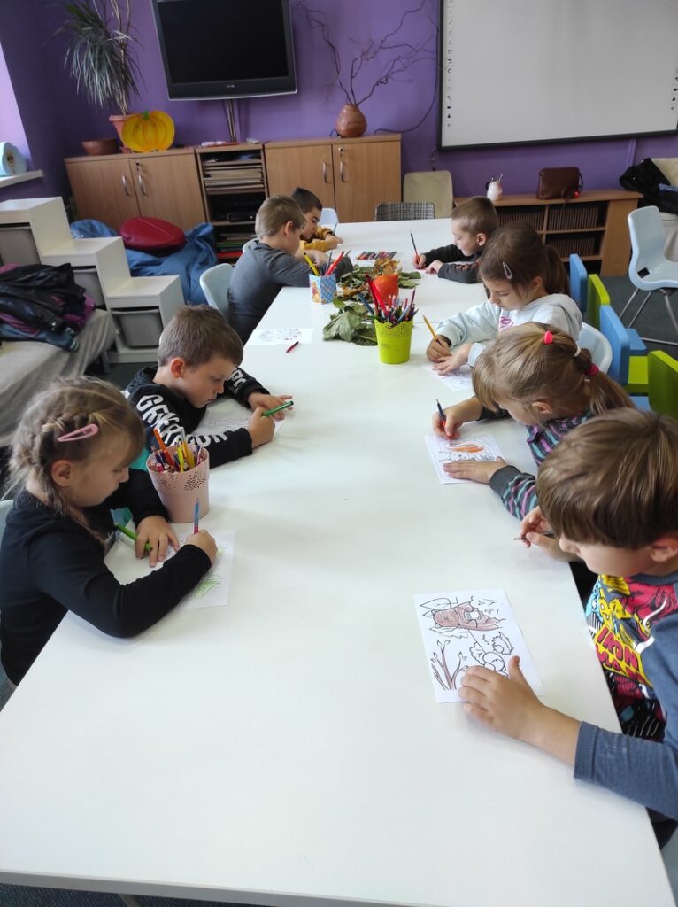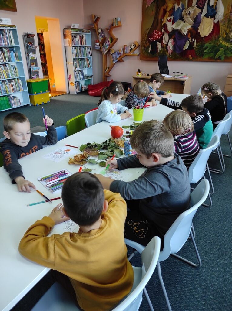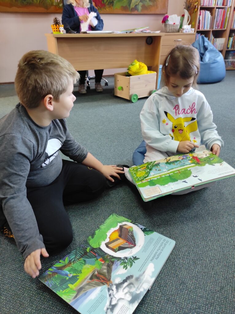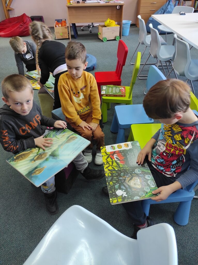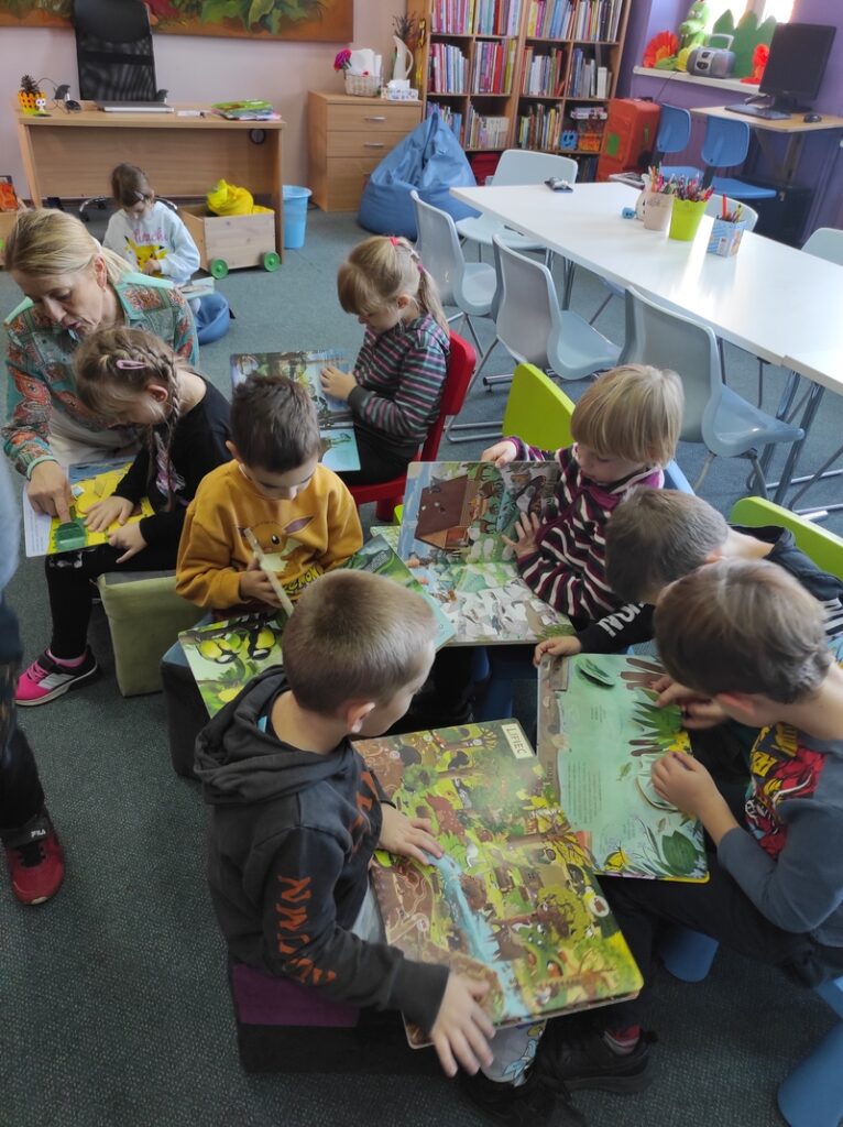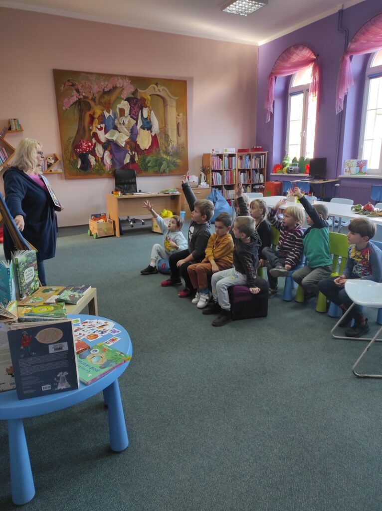 Żabki podczas wizyty w bibliotece obejrzały teatrzyk kamishibai o tematyce jesiennej, rozmawiały z Panią Lucyną o przygotowaniach zwierząt do zimy i z uwagą oglądały książki o zwierzętach.