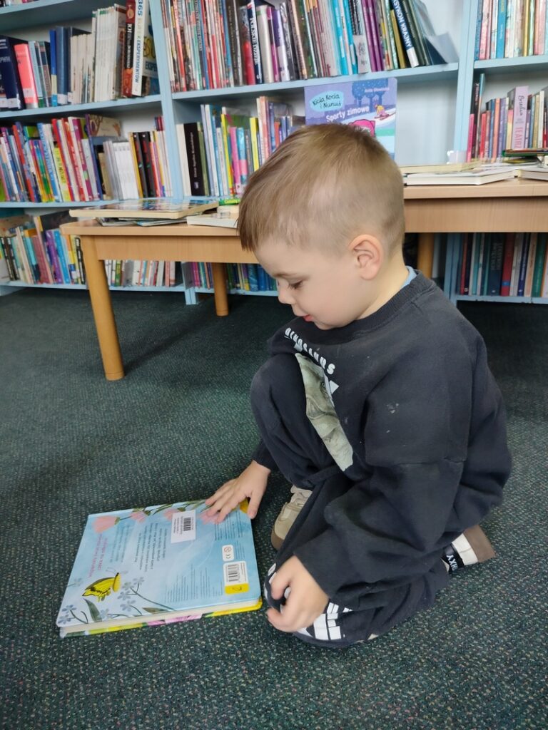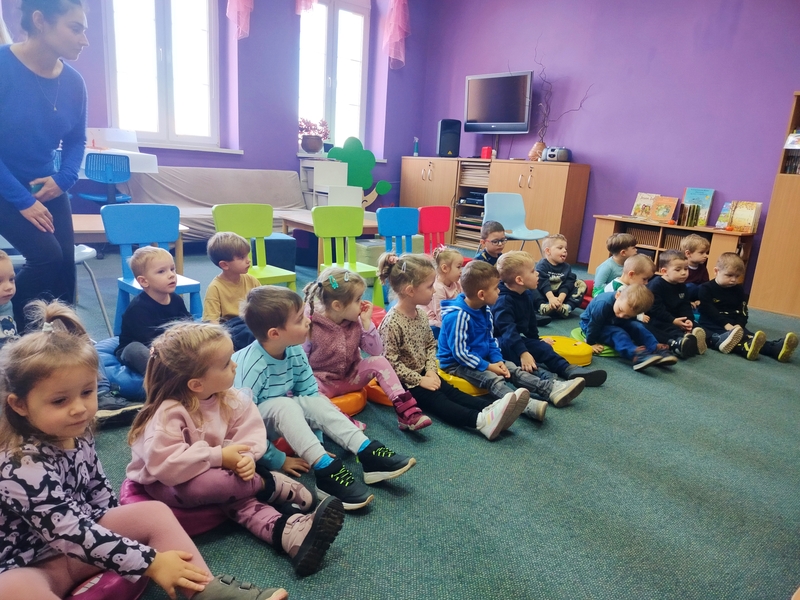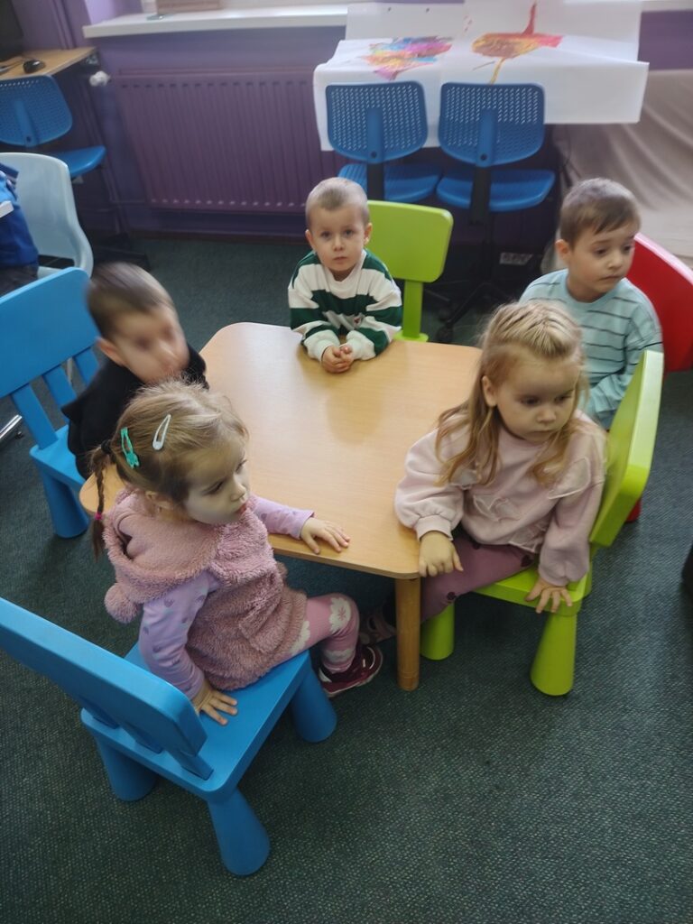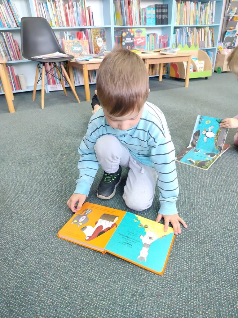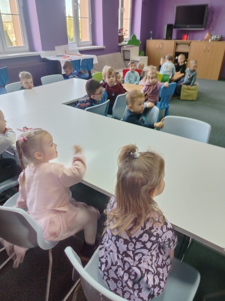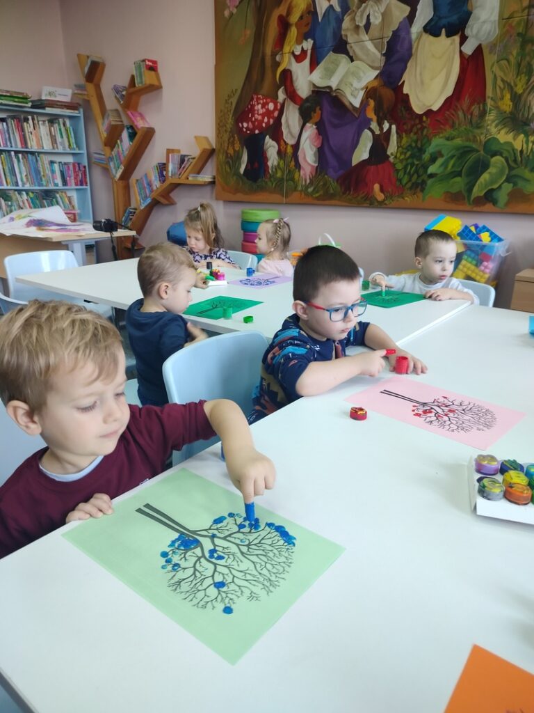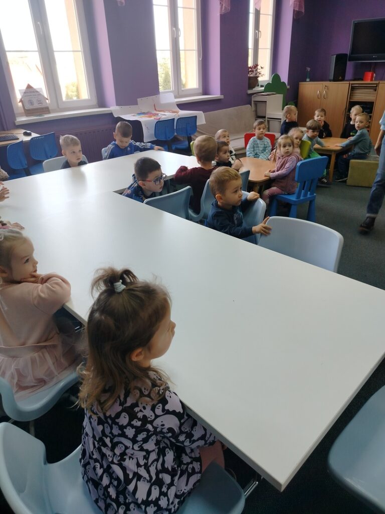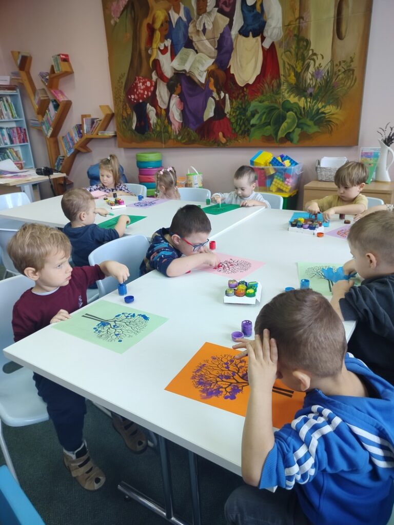 Nasze Zajączki odbyły swoją pierwszą wizytę w bibliotece – pełną ciekawości, odkryć i radości. Dzieci z zainteresowaniem poznawały książeczki, oglądały ilustracje i słuchały opowieści, które pobudzały wyobraźnię. Podczas zajęć szukały ukrytych darów jesieni – liści, kasztanów, żołędzi – ucząc się uważności i spostrzegawczości. Na zakończenie wykonały jesienną pracę plastyczną, używając do malowania swoich paluszków. Było kolorowo, twórczo i bardzo wesoło! To była wyjątkowa przygoda, która rozbudziła miłość do książek i pokazała, że biblioteka to miejsce pełne magii.