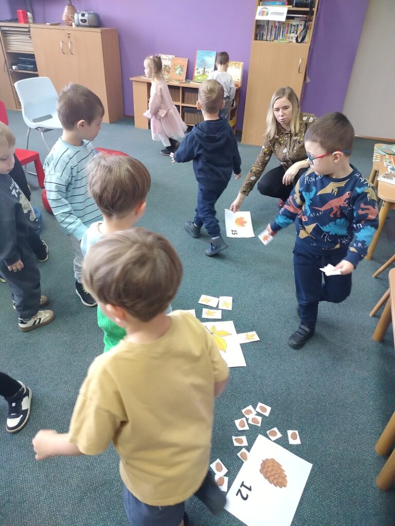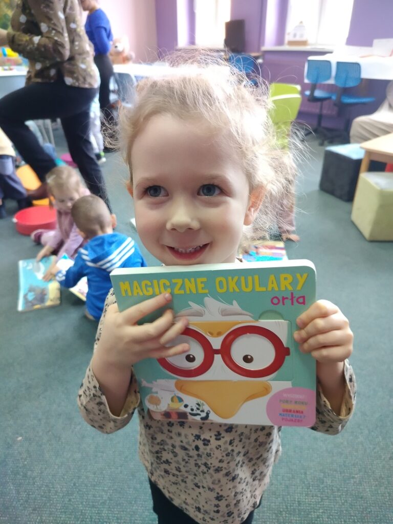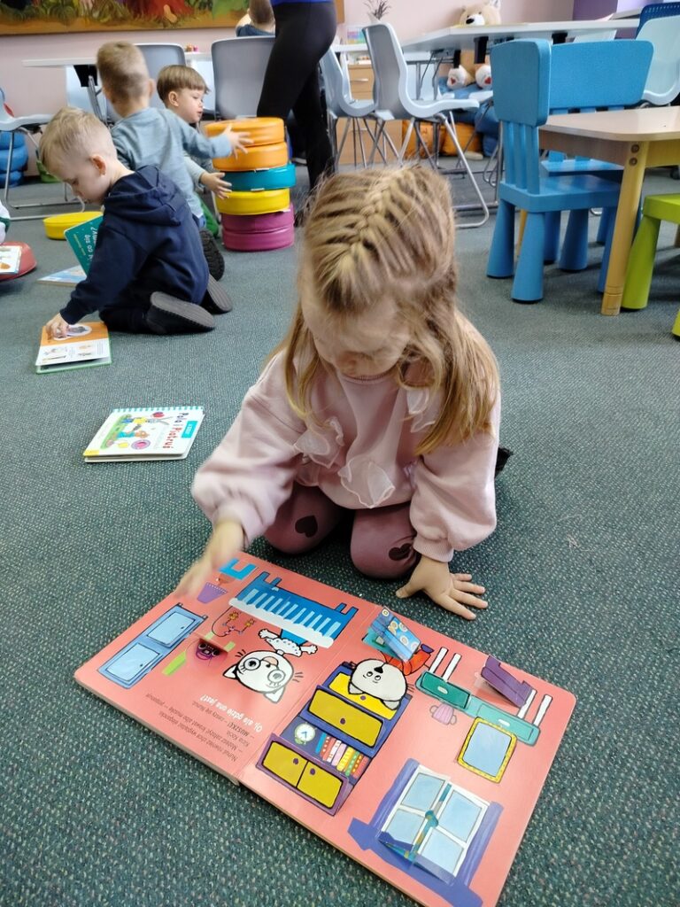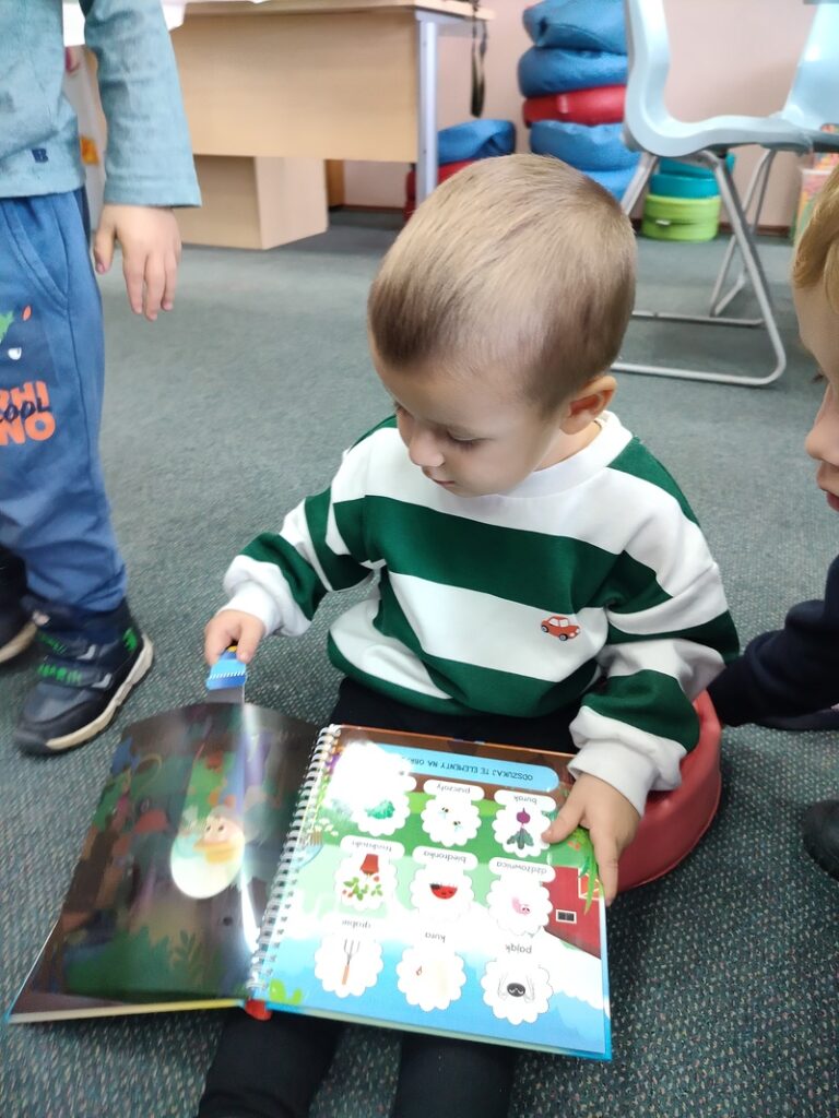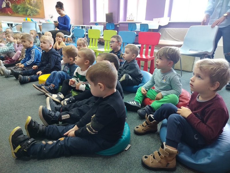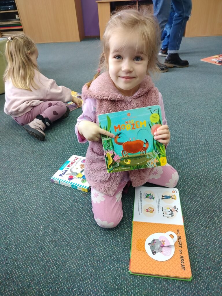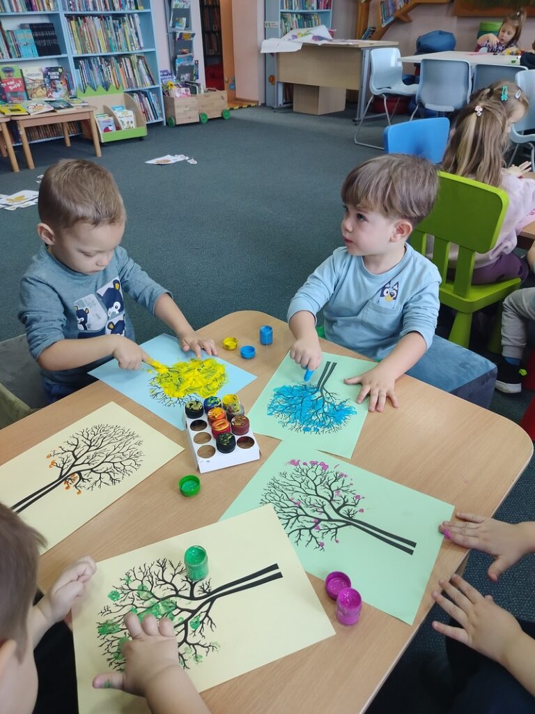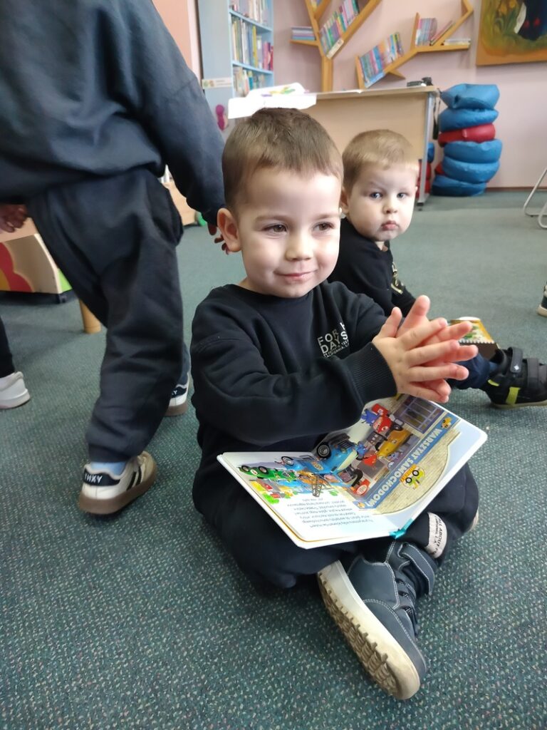 Nasze Zajączki odbyły swoją pierwszą wizytę w bibliotece – pełną ciekawości, odkryć i radości. Dzieci z zainteresowaniem poznawały książeczki, oglądały ilustracje i słuchały opowieści, które pobudzały wyobraźnię. Podczas zajęć szukały ukrytych darów jesieni – liści, kasztanów, żołędzi – ucząc się uważności i spostrzegawczości. Na zakończenie wykonały jesienną pracę plastyczną, używając do malowania swoich paluszków. Było kolorowo, twórczo i bardzo wesoło! To była wyjątkowa przygoda, która rozbudziła miłość do książek i pokazała, że biblioteka to miejsce pełne magii.