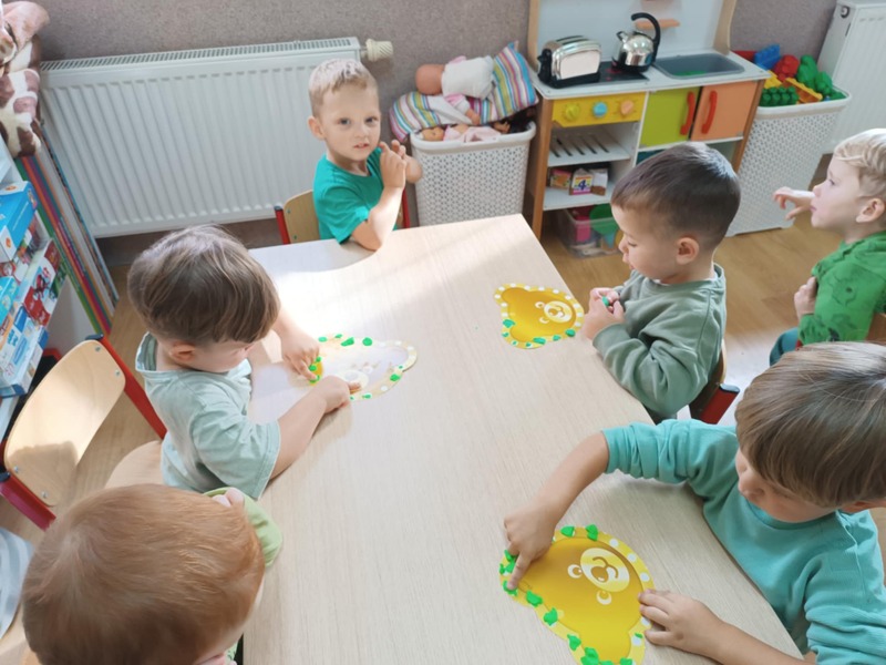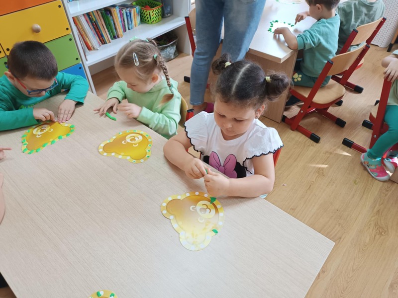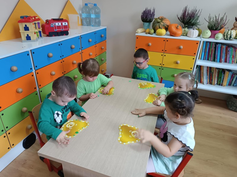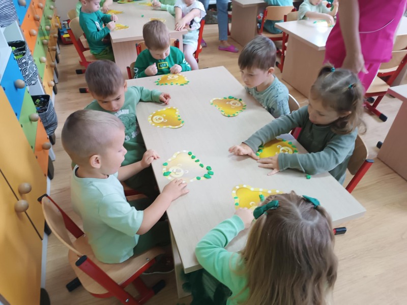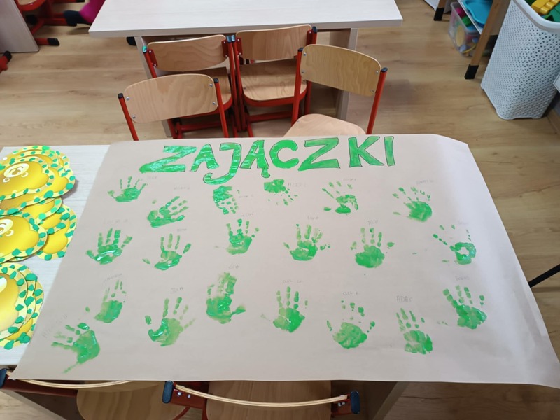 Wykonaliśmy też plakat naszej grupy – z odcisków naszych rączek powstało prawdziwe dzieło sztuki! A żeby było jeszcze bardziej wyjątkowo, wszyscy ubraliśmy się na zielono – wyglądaliśmy jak wesoła drużyna wiosennych duszków. To był dzień pełen śmiechu, zabawy i wspólnej radości.
