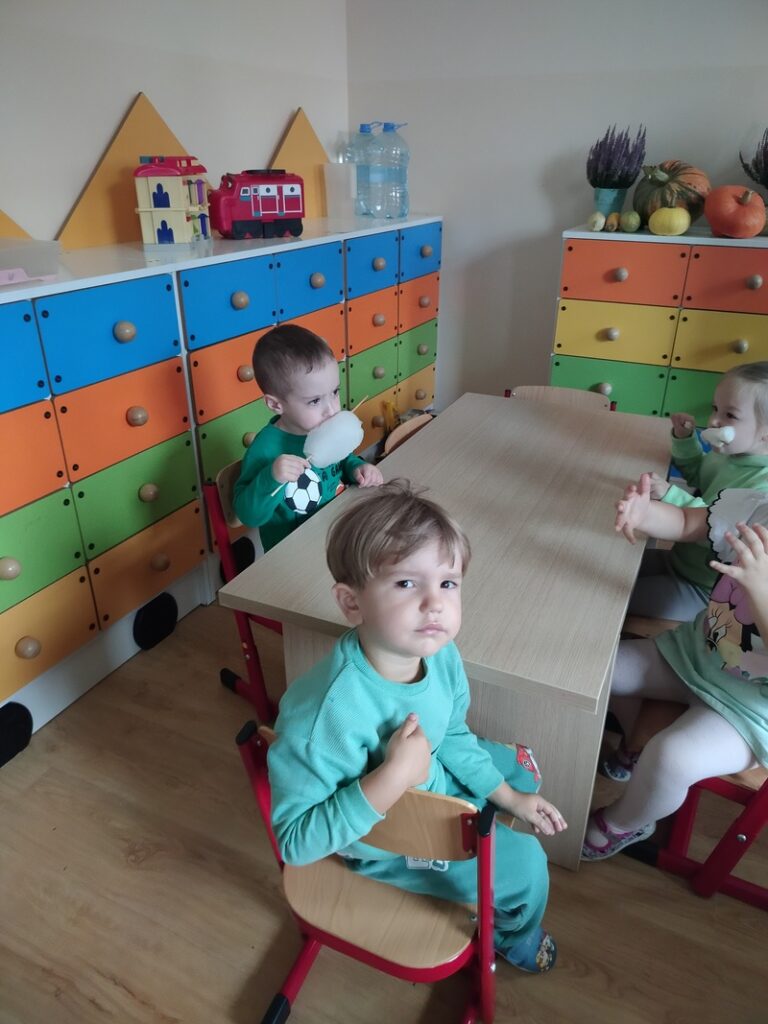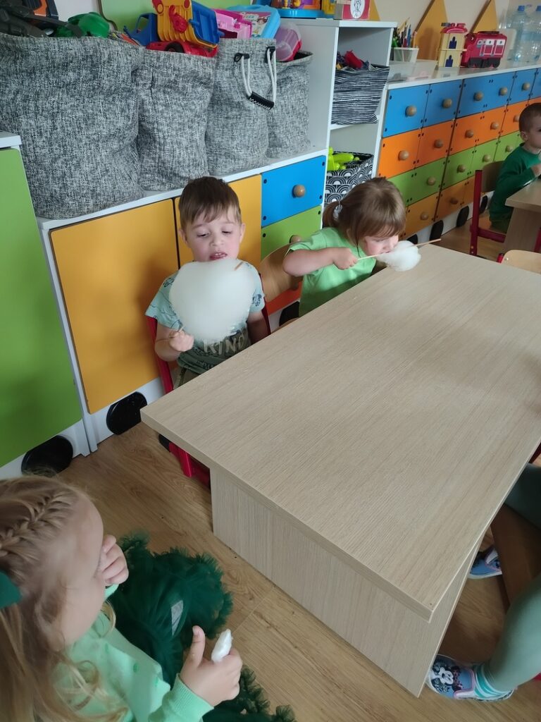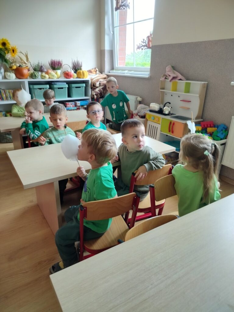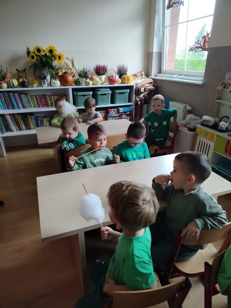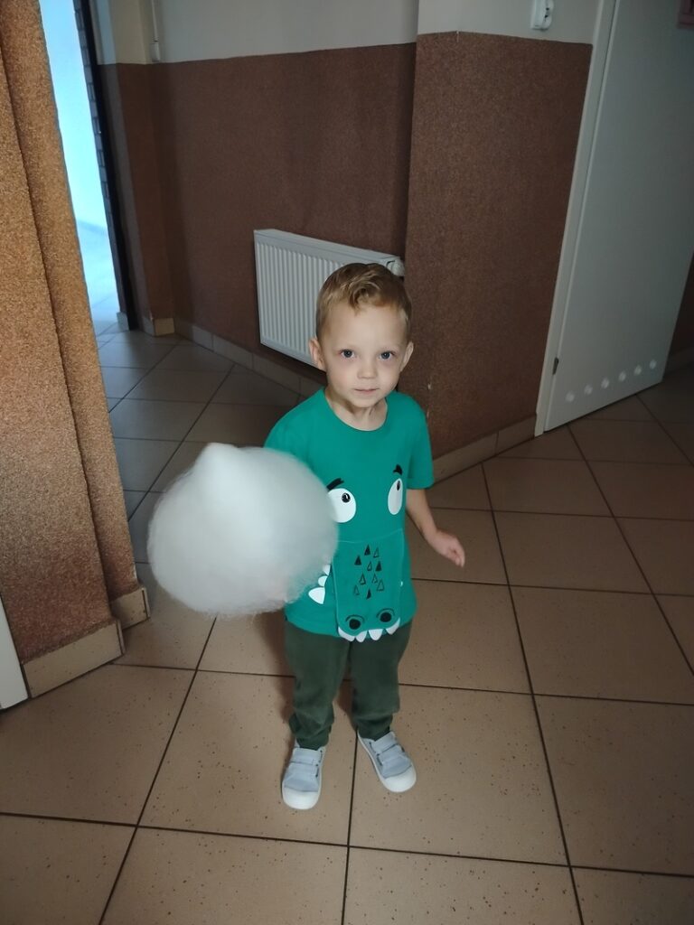 19. września w naszej grupie obchodziliśmy swój pierwszy Dzień Przedszkolaka z uśmiechami od ucha do ucha. Po raz pierwszy wystąpiliśmy na prawdziwej scenie – śpiewaliśmy naszą wspólną piosenkę tak głośno i radośnie, że aż echo się ucieszyło! Były muzyczne zabawy, tańce, skoki i wygibasy – nogi same rwały się do pląsów! A potem… wata cukrowa! Słodka, puszysta i klejąca – palce lizać! Niektórzy z nas ozdobili się kolorowymi tatuażami i wyglądali jak mali artyści.